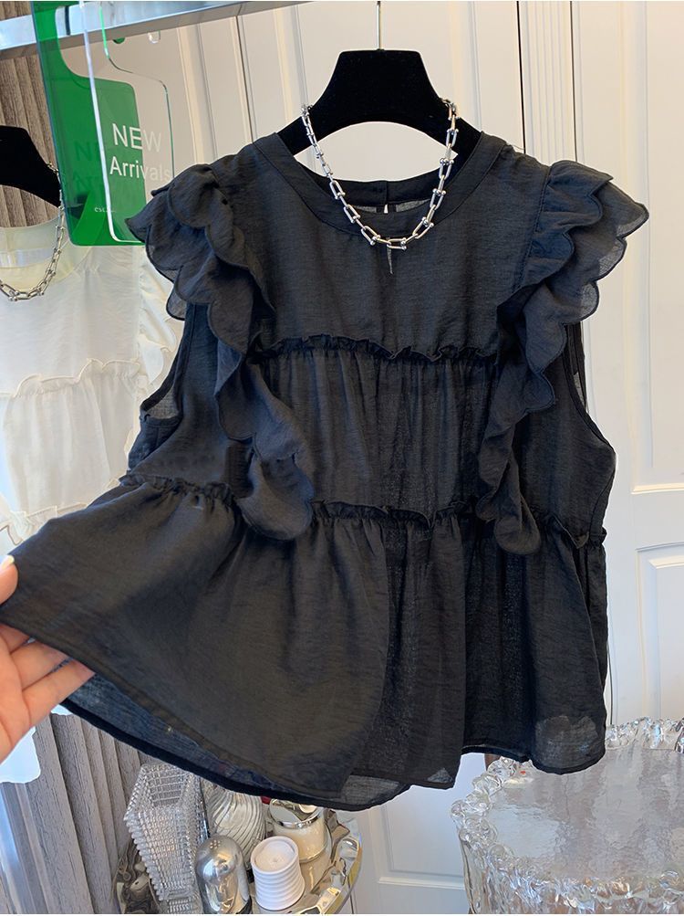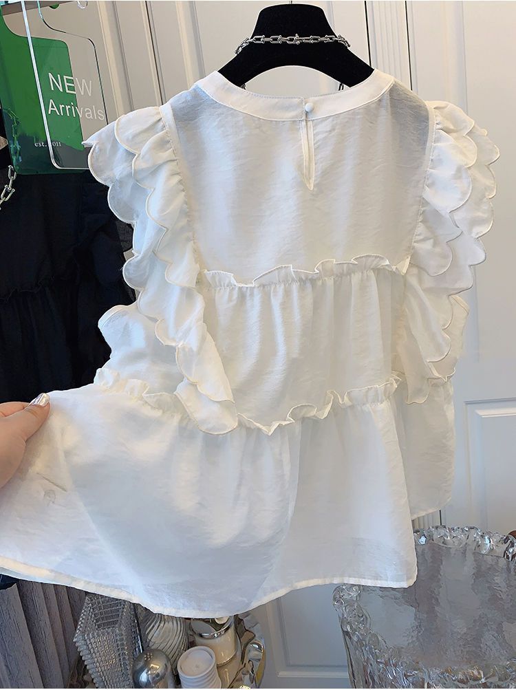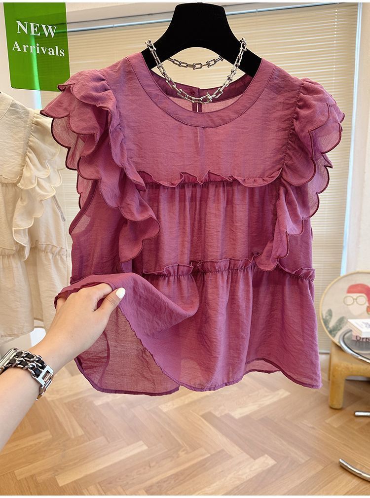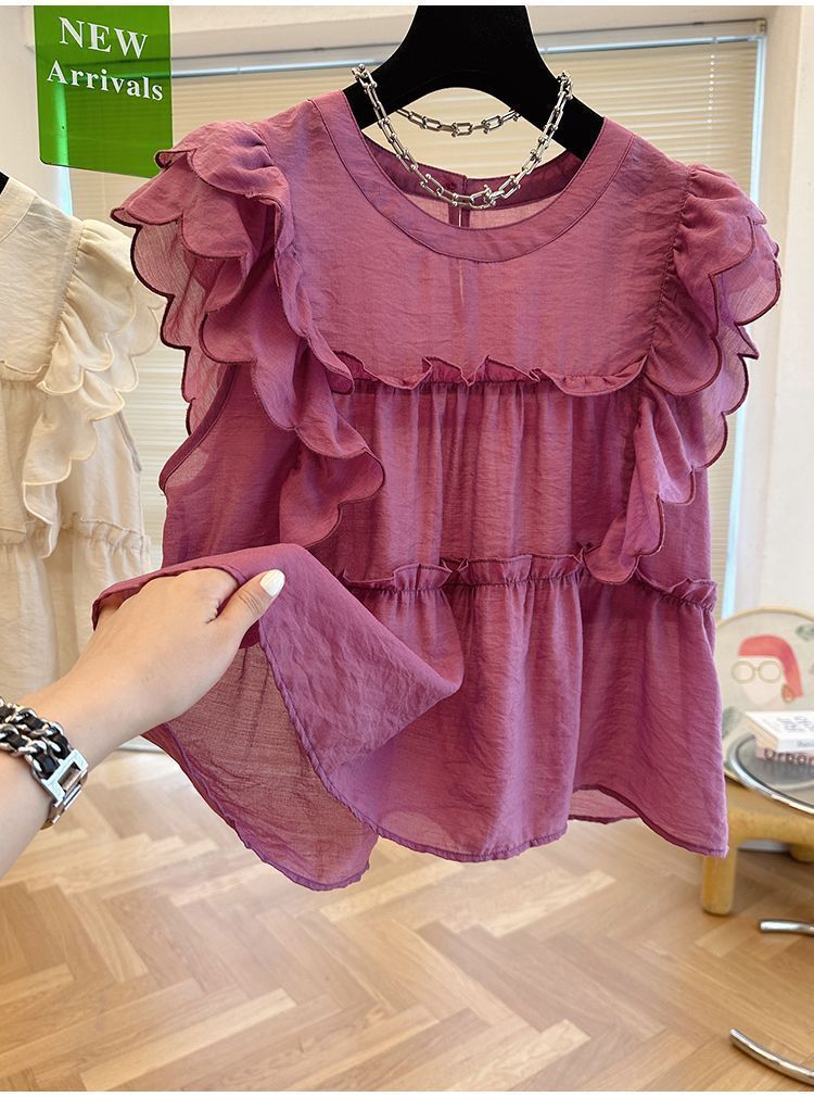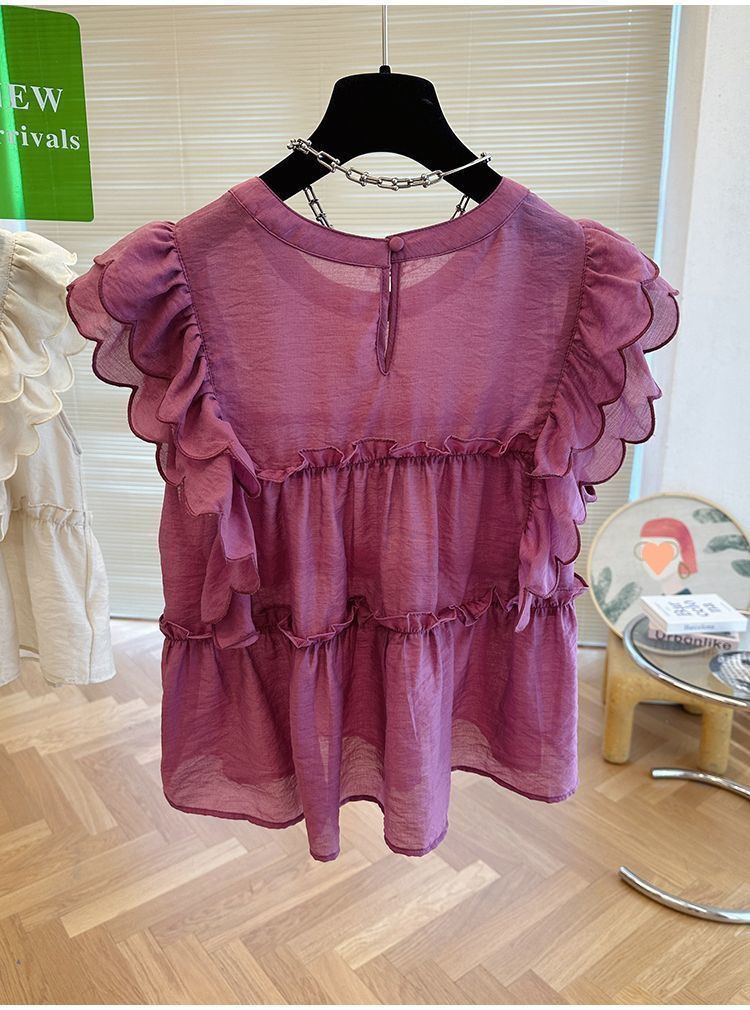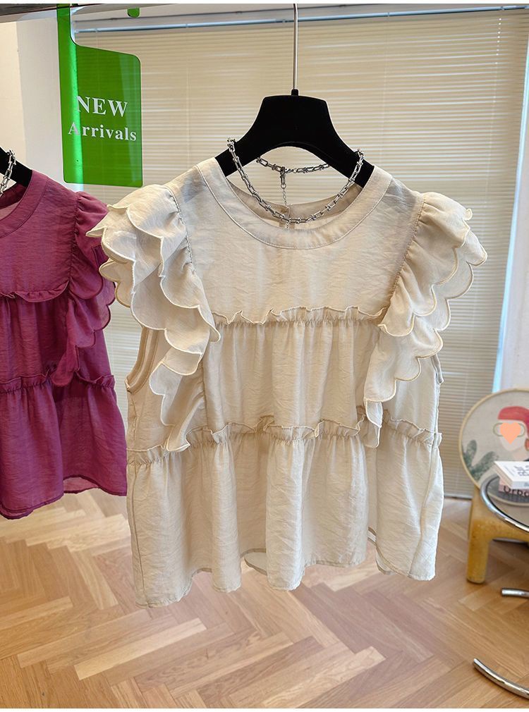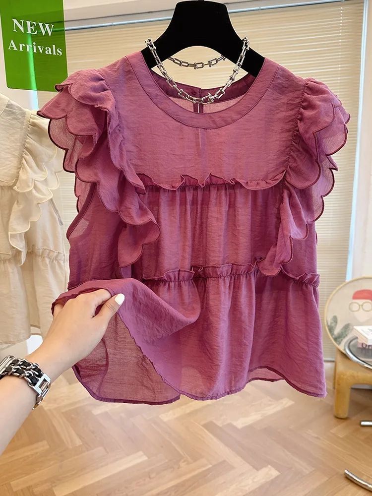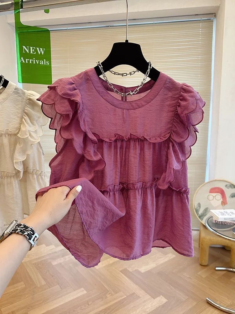 프렌치 러플 플라잉 슬리브 크루 넥 셔츠 여성용 여름 달콤한 인형 셔츠 루즈 니치 세련된 민소매 탑