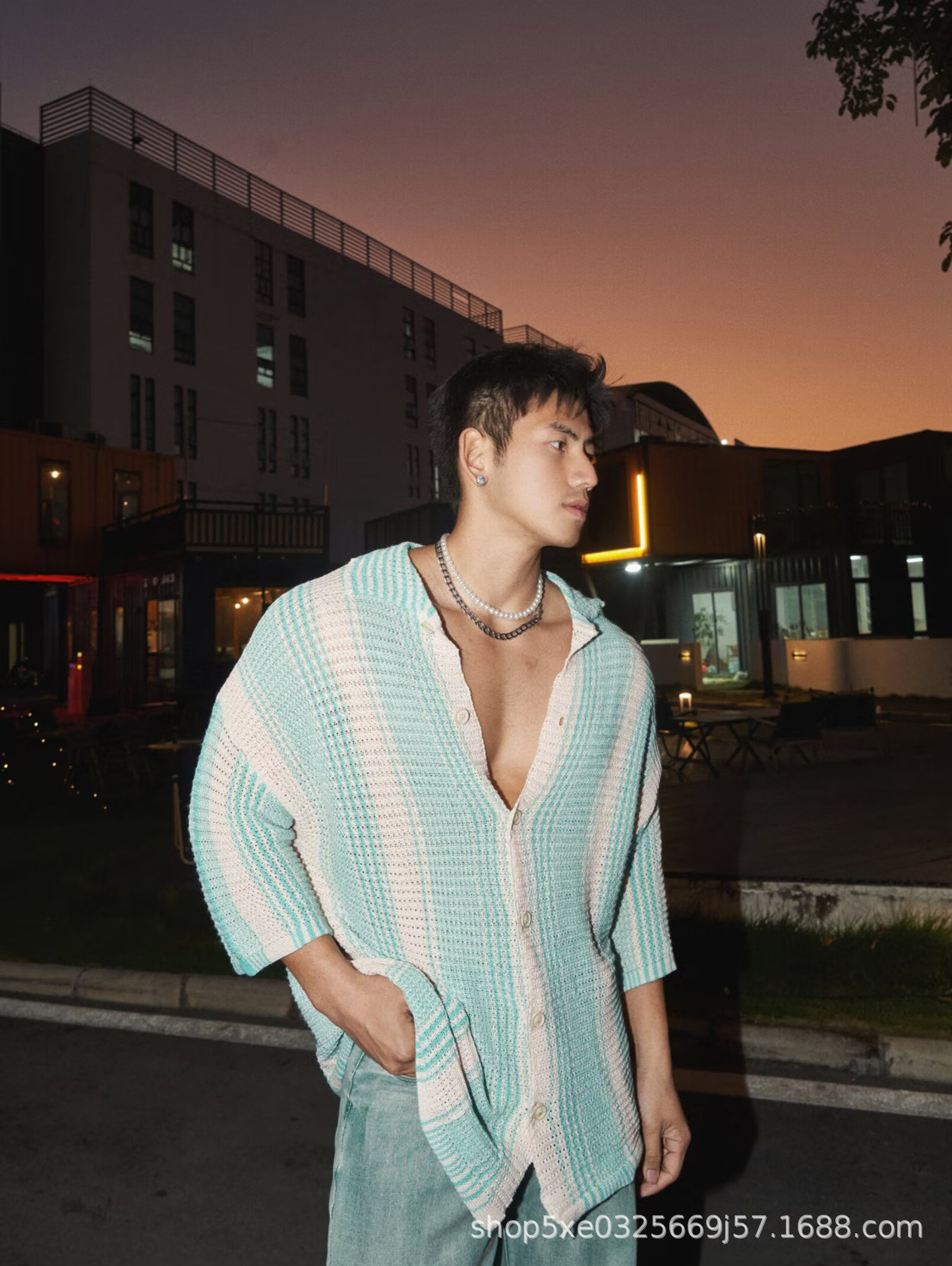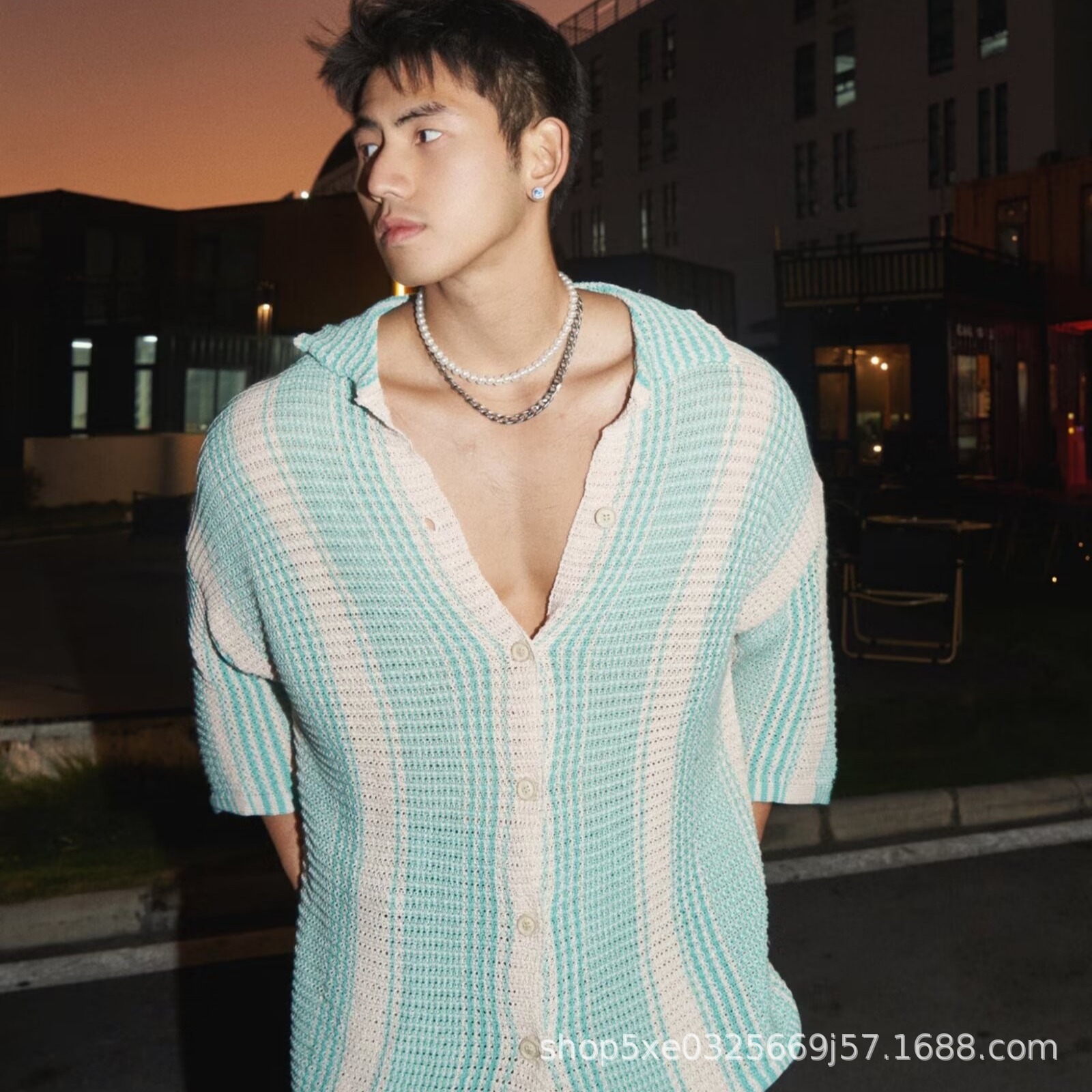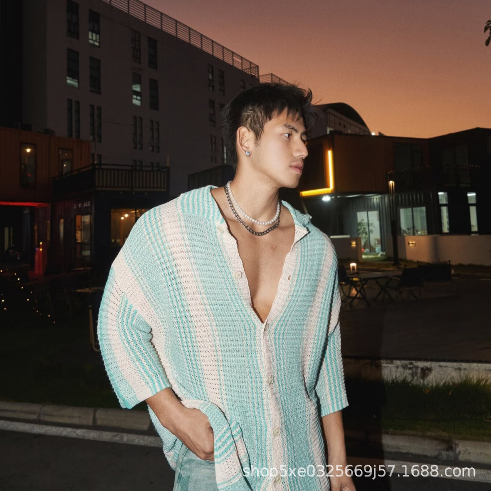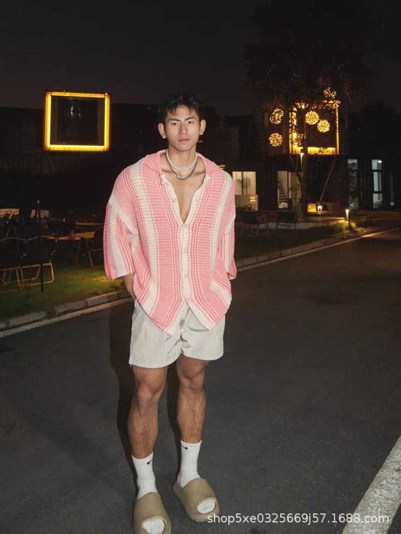 유럽과 미국의 중공 니트 카디건 남자 하이 엔드 센스 루즈 아이스 쿨 실크 셔츠 쿨 얇은 통기성 메쉬 스트라이프 스웨터 트렌디스토어 가기