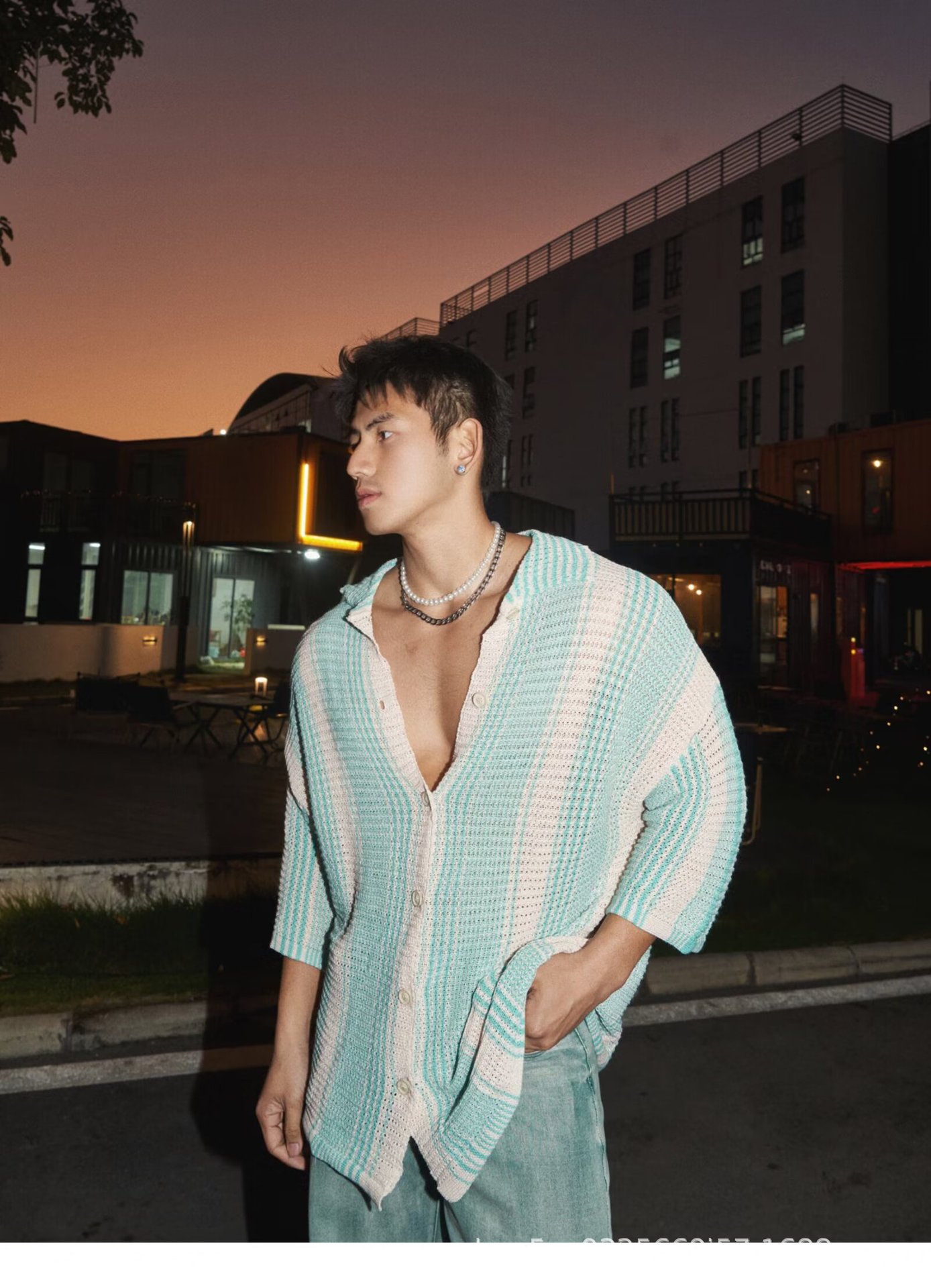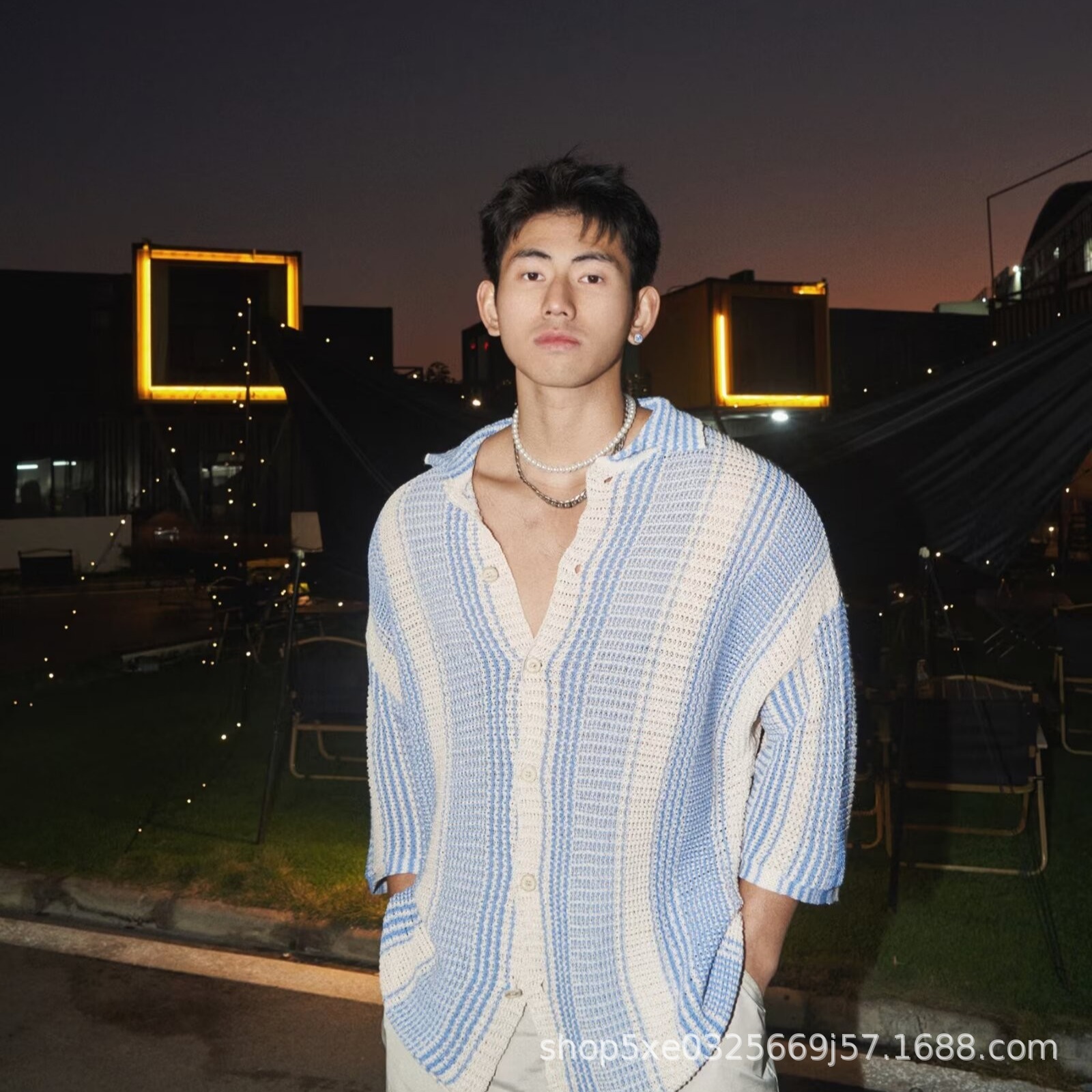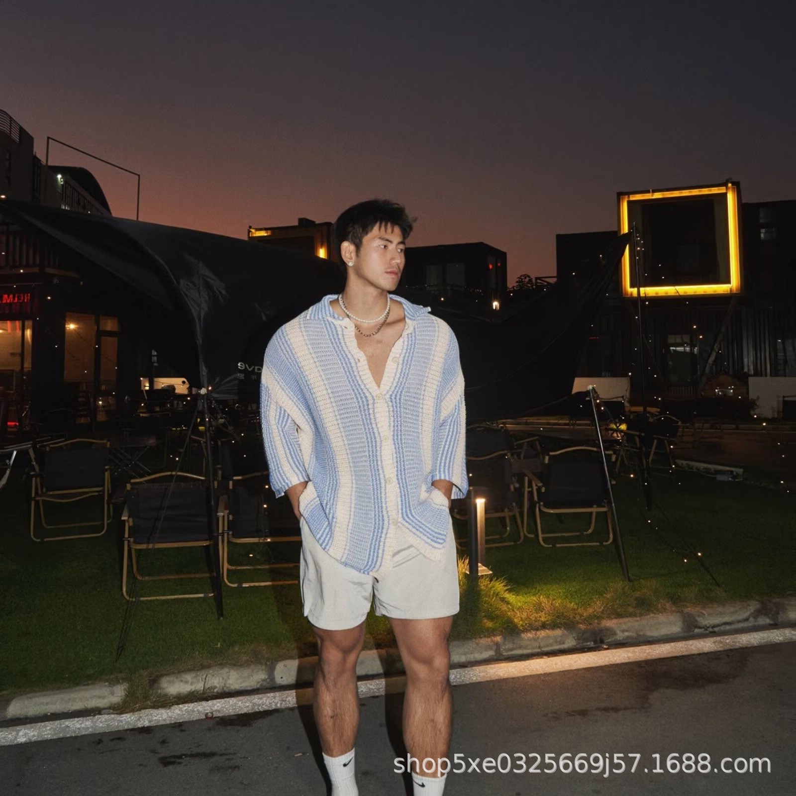유럽과 미국의 중공 니트 카디건 남자 하이 엔드 센스 루즈 아이스 쿨 실크 셔츠 쿨 얇은 통기성 메쉬 스트라이프 스웨터 트렌디스토어 가기