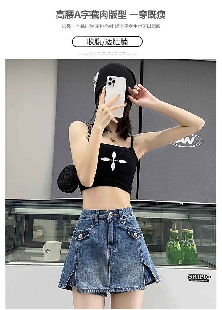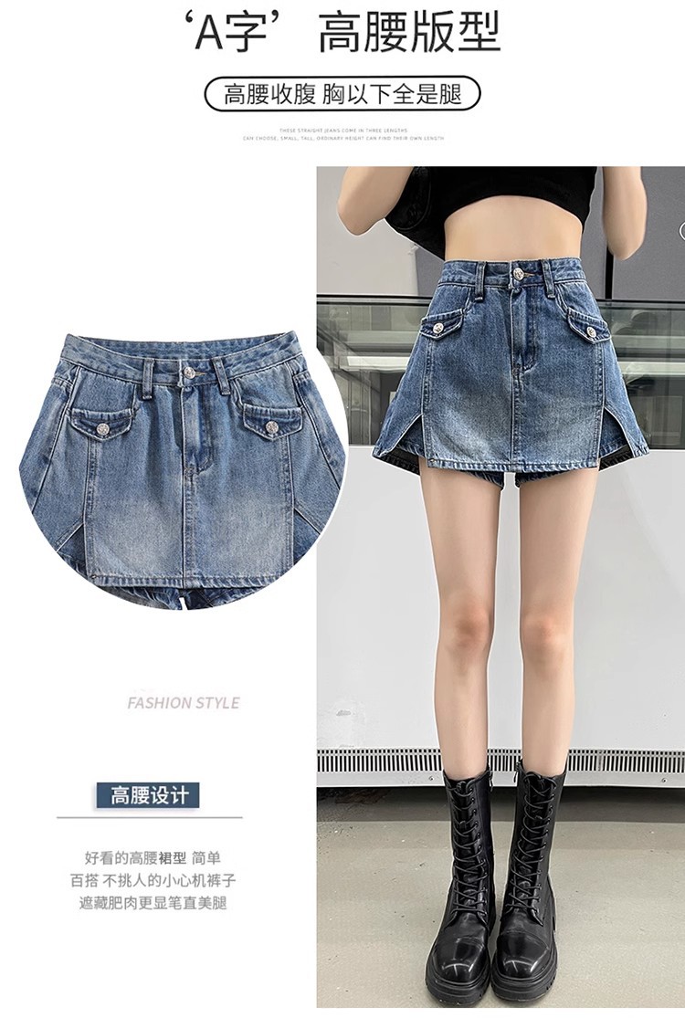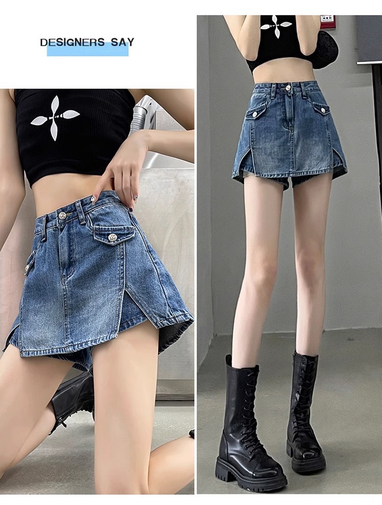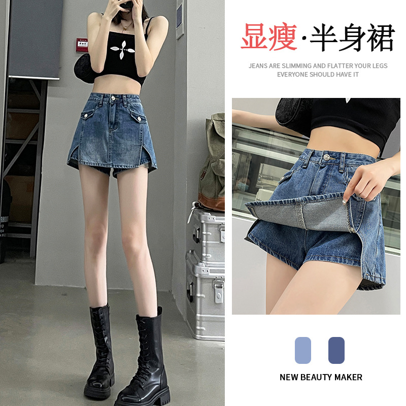 높은 허리 데님 반바지 여성 바지 스커트 스파이스 걸스 2024 봄과 가을 새로운 복고풍 슬리밍 가짜 투피스 핫 트렌디 팬츠