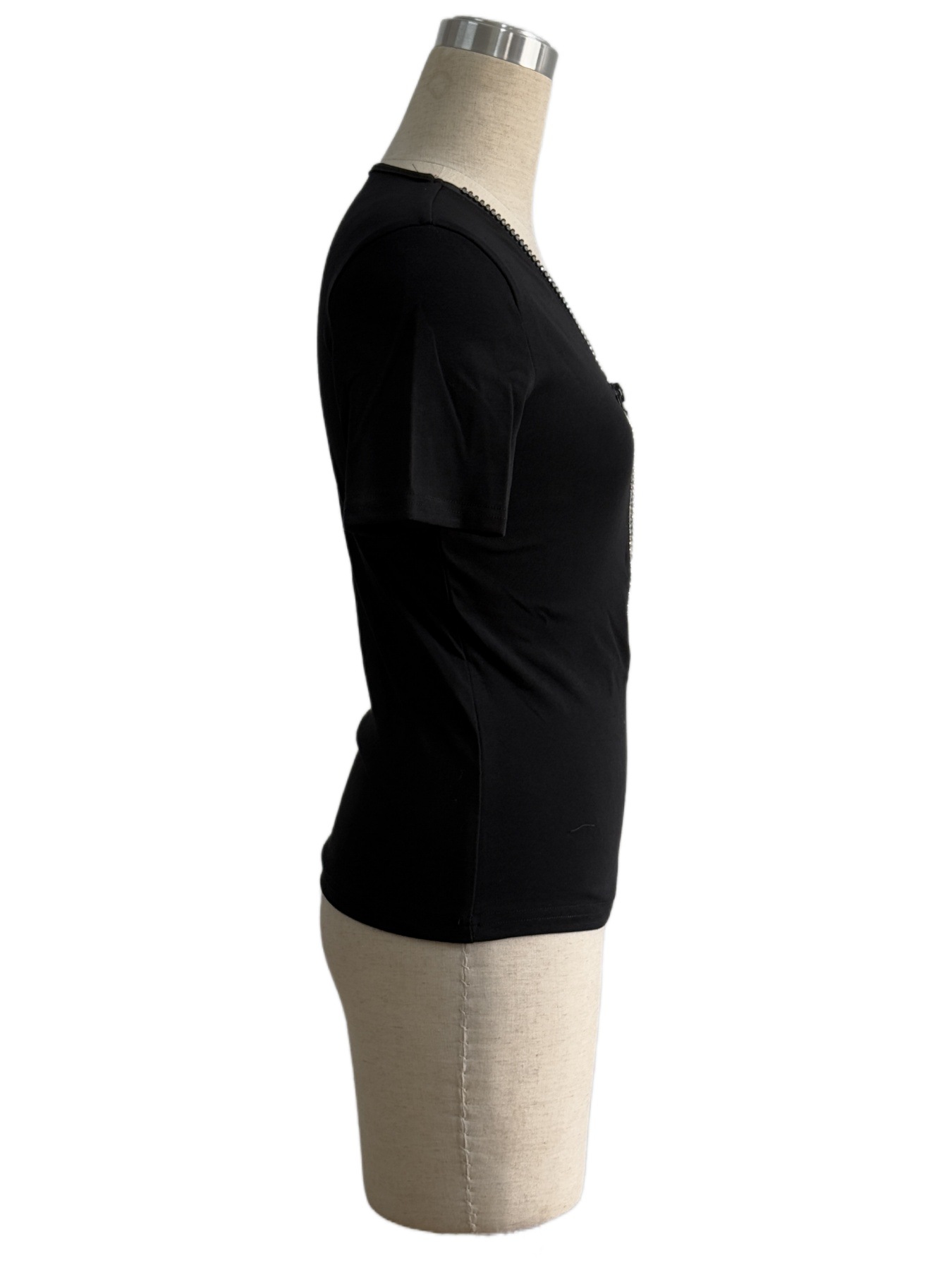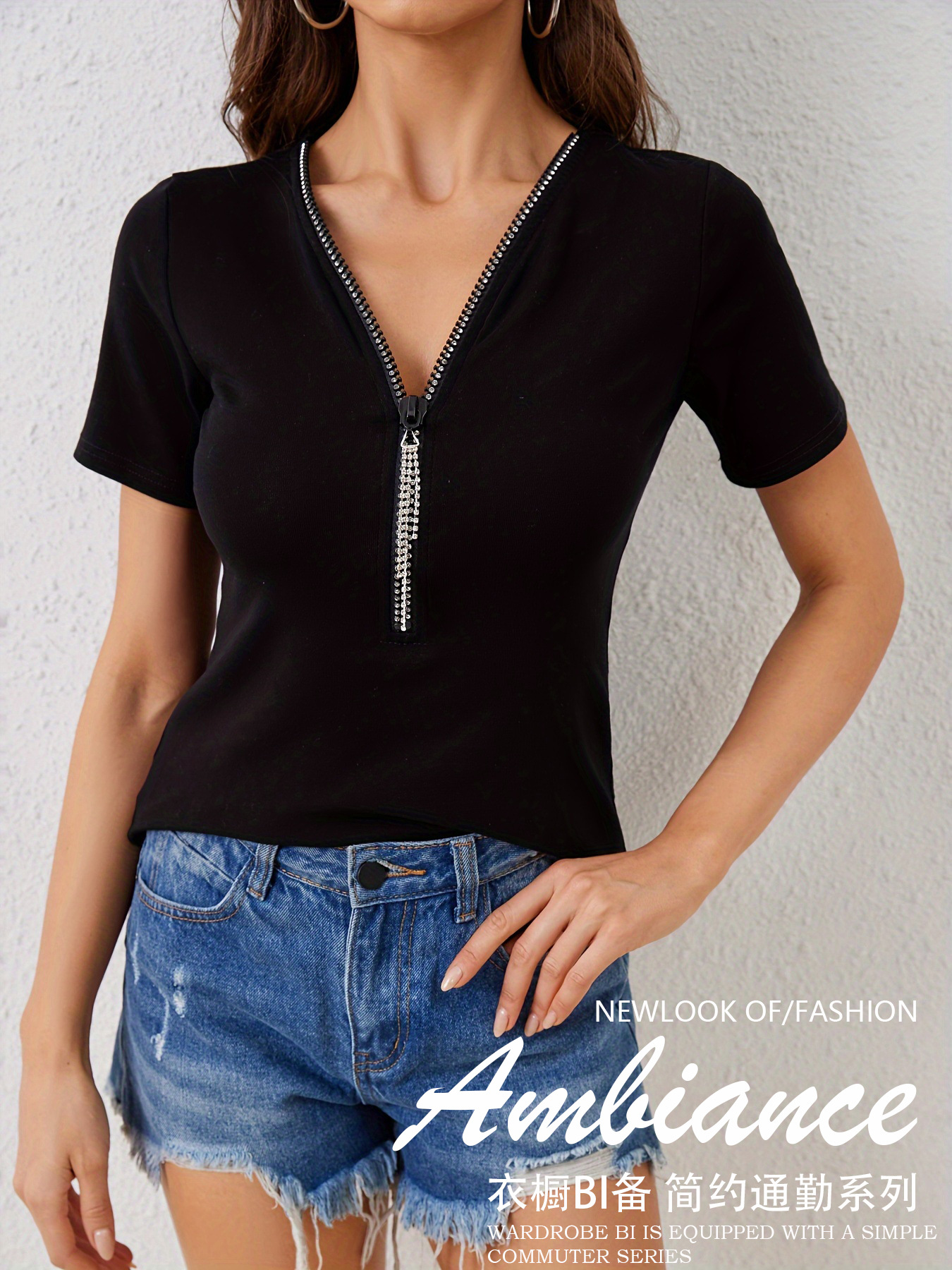 유럽과 미국의 국경 2025 새로운 스타일 95 코튼 리브 v 넥 다이아몬드 펜던트 지퍼 솔리드 컬러 반팔 티셔츠 슬리밍 탑 여성용스토어 가기
