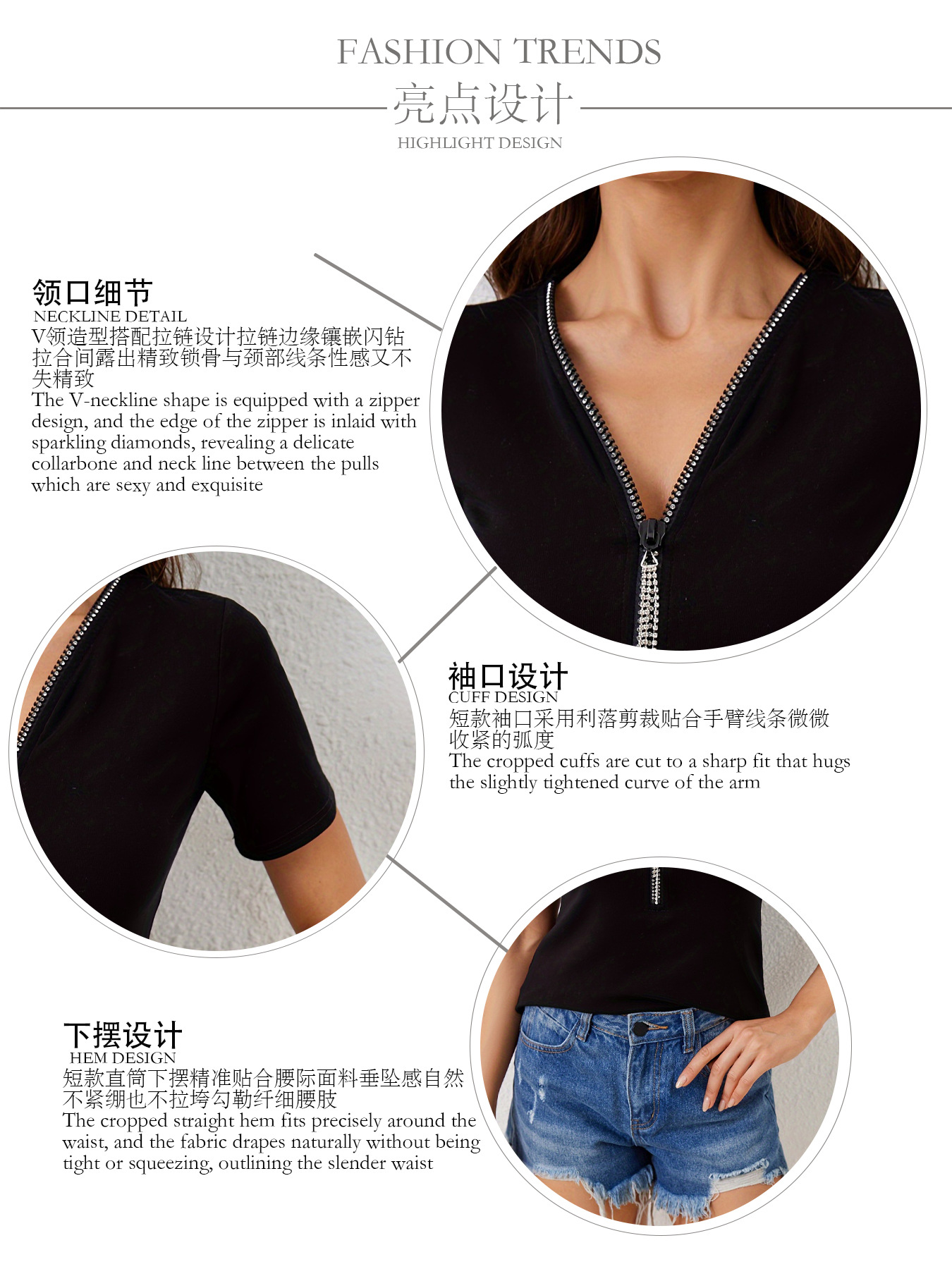 유럽과 미국의 국경 2025 새로운 스타일 95 코튼 리브 v 넥 다이아몬드 펜던트 지퍼 솔리드 컬러 반팔 티셔츠 슬리밍 탑 여성용