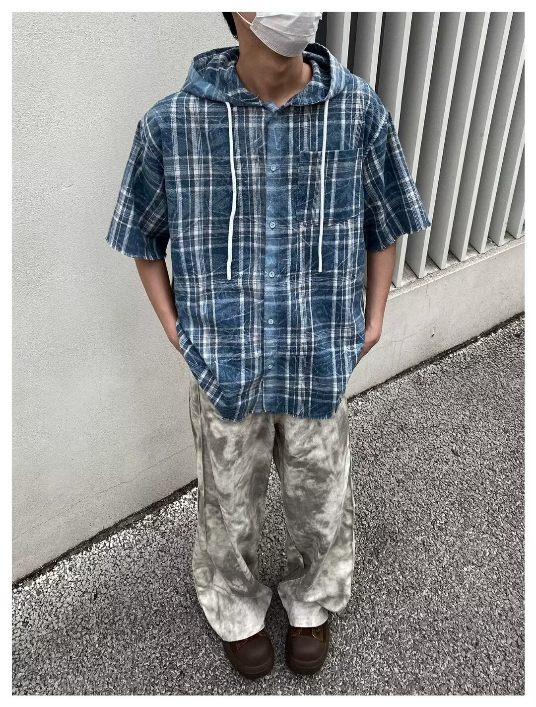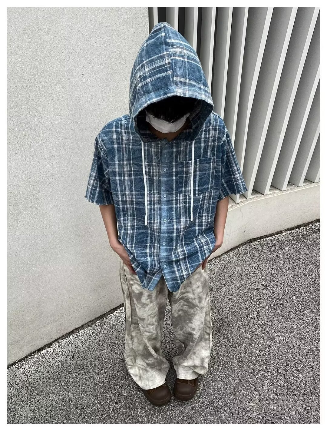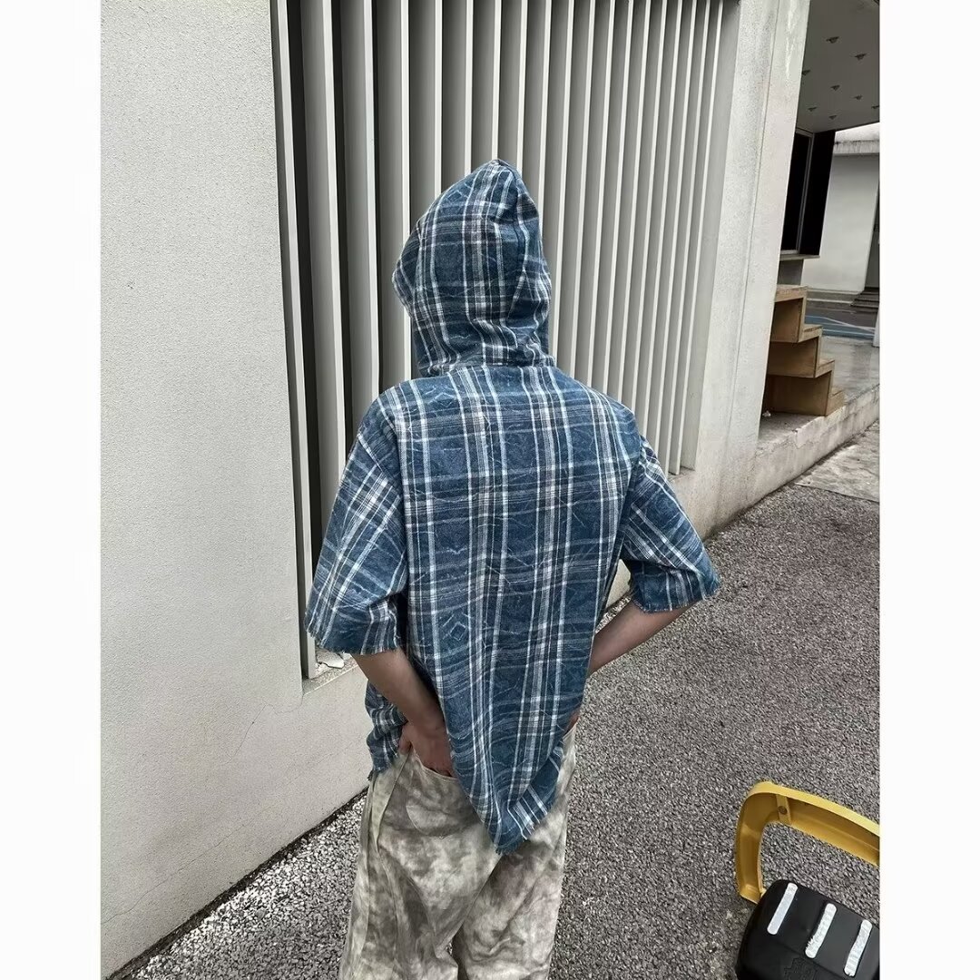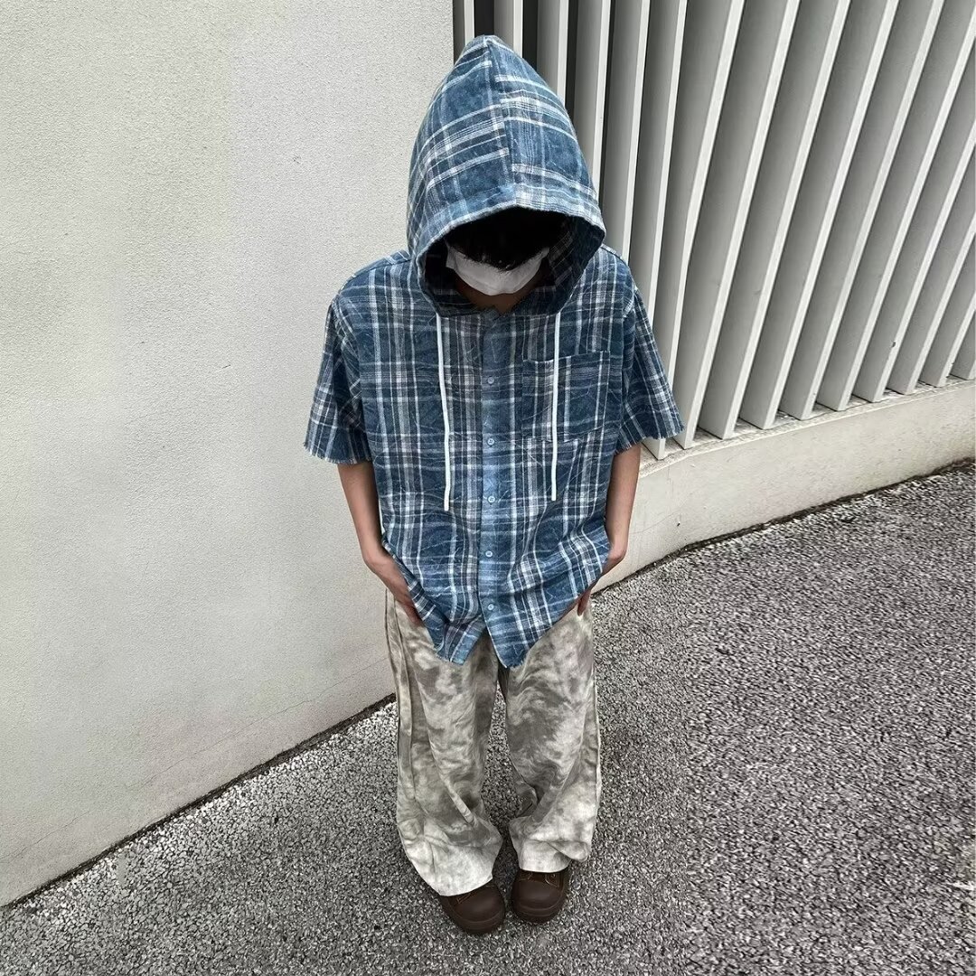 격자 무늬 반팔 셔츠 2024 남자 여름 일본 스타일 레트로 느슨한 캐주얼 셔츠 미국 스타일 하이 스트리트 패션 브랜드 재킷스토어 가기