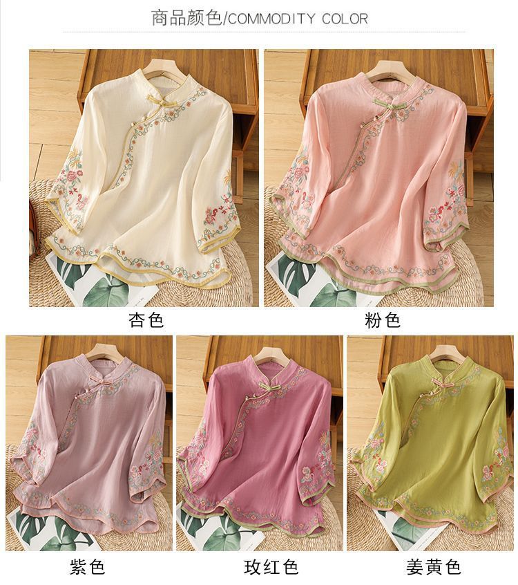 코튼 티 의류 셔츠 여성용 새 스타일 탑 중국 여름 레트로 국립 스타일 슬란 트 플래켓 느슨한 예술적 버클스토어 가기