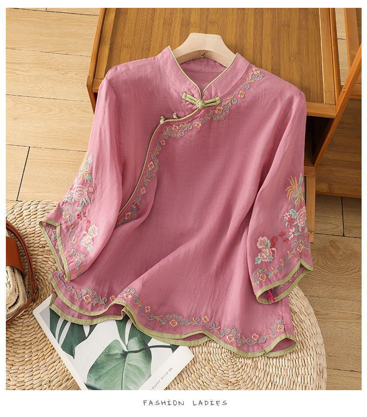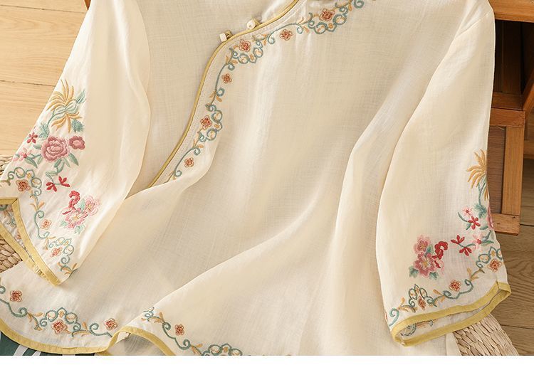 코튼 티 의류 셔츠 여성용 새 스타일 탑 중국 여름 레트로 국립 스타일 슬란 트 플래켓 느슨한 예술적 버클