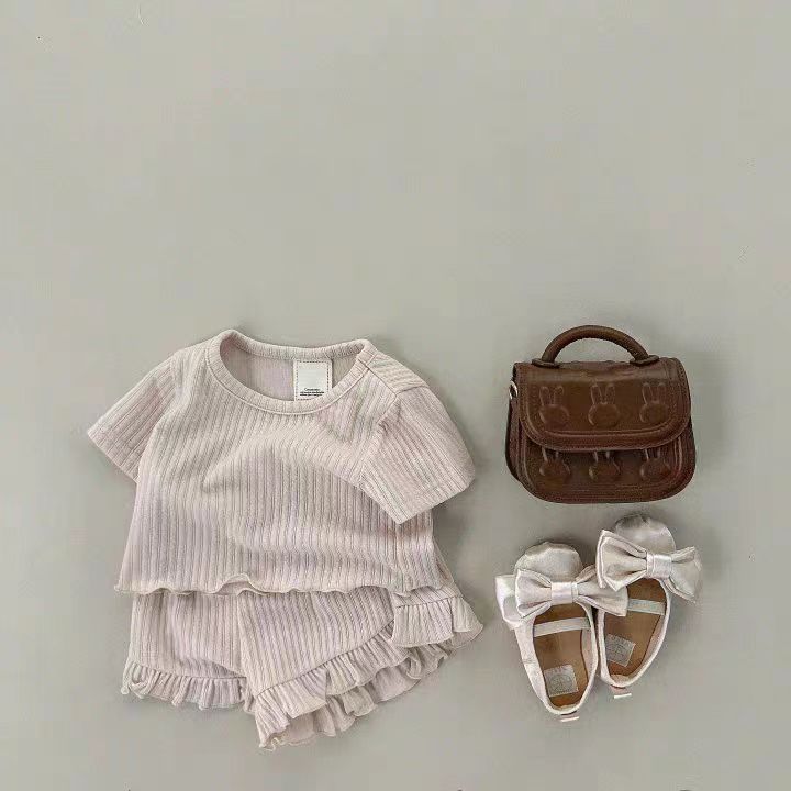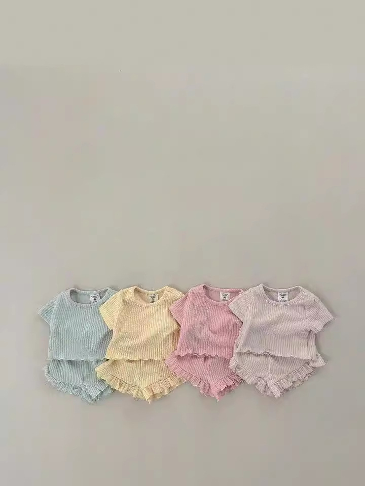 Ins Korean Style Boys and Girls 반팔 단색 간단한 티셔츠 반바지 투피스 세트 어린이 아기 캔디 컬러 레이스 바지 세트