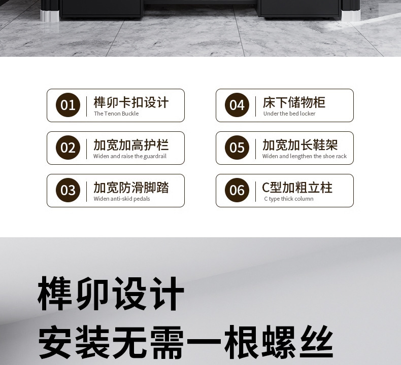 • 침대판 + 침대 밑 수납장을 갖춘 두껍고 대담한 900 블랙 더블 레이어