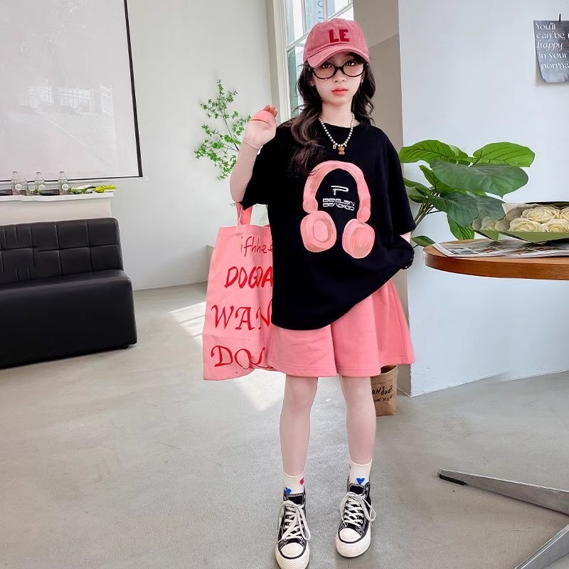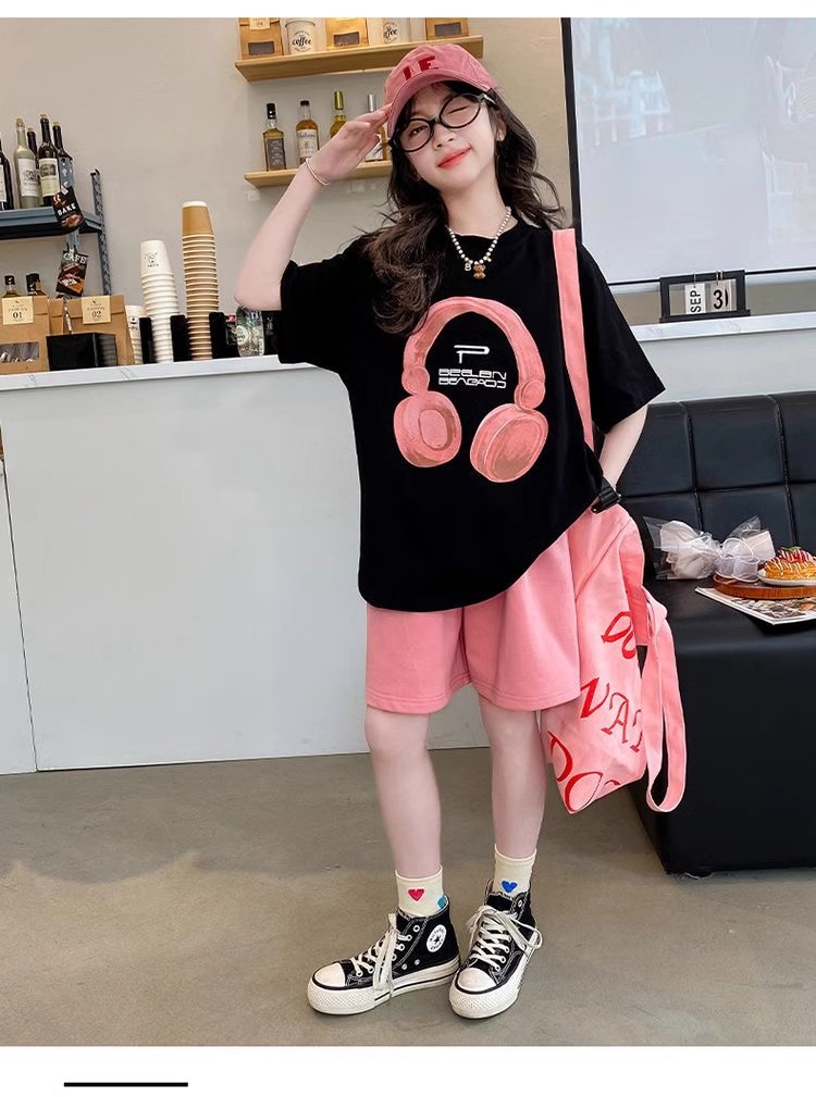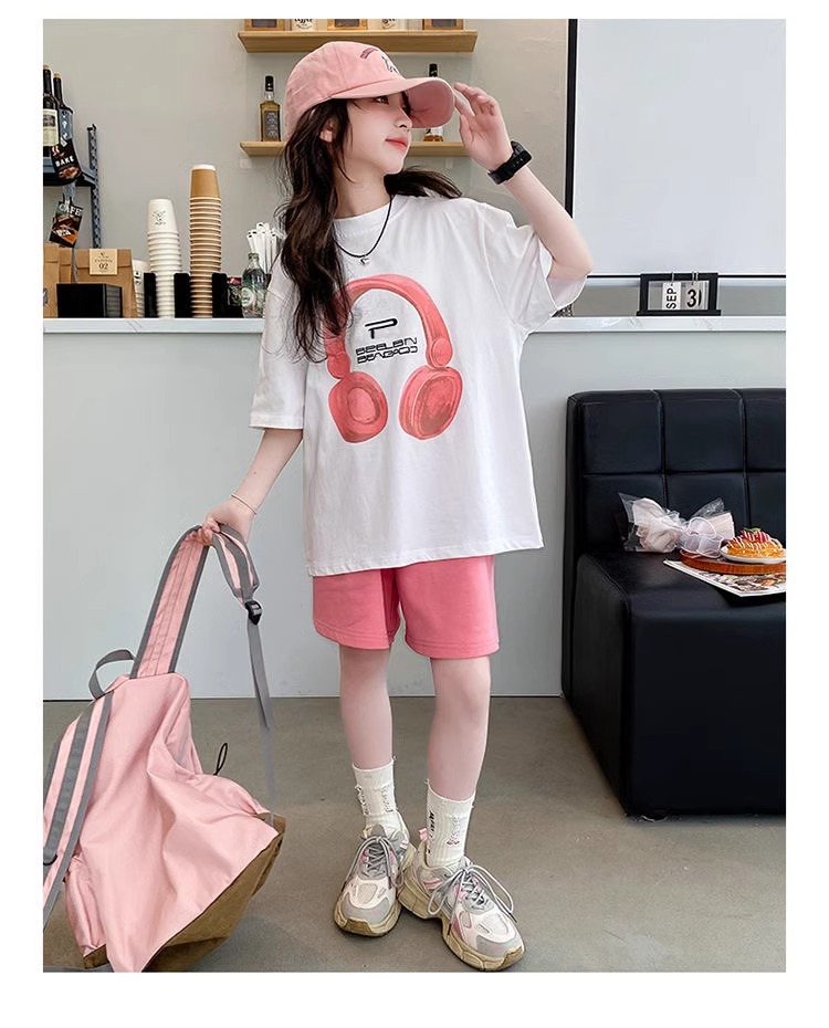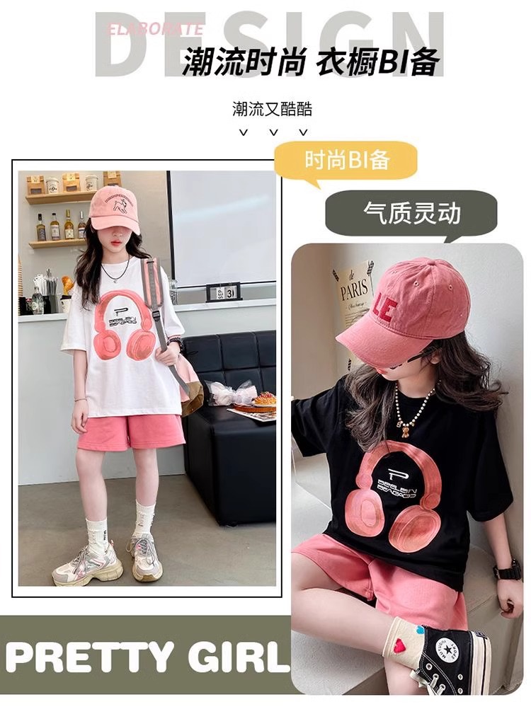 2024 새로운 여아 반팔 세트 여름 어린이 온라인 인기 외국 스타일 반바지 중대형 어린이 레저 스포츠 투피스 세트