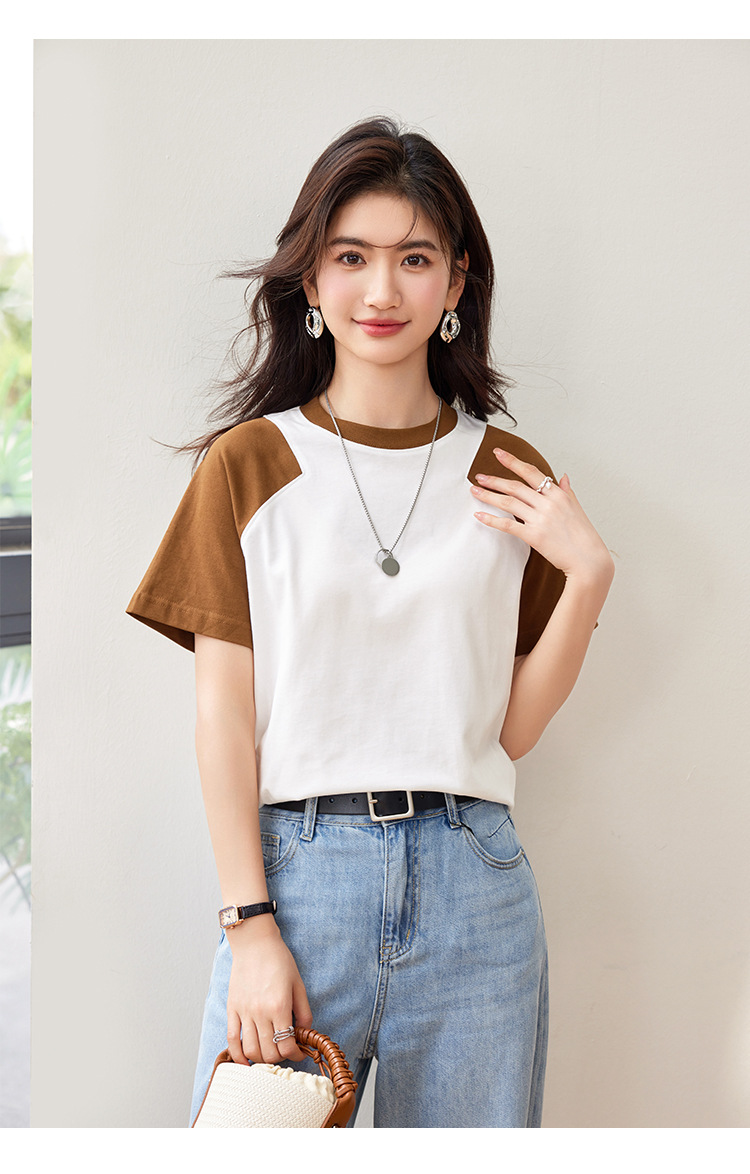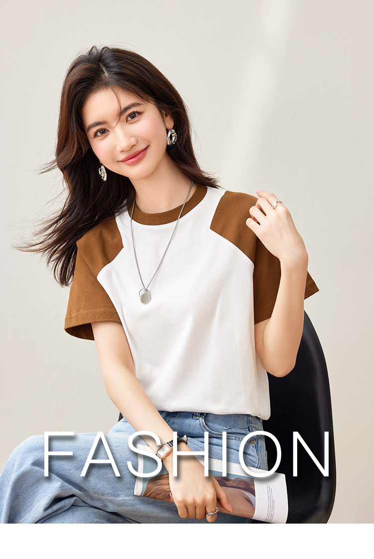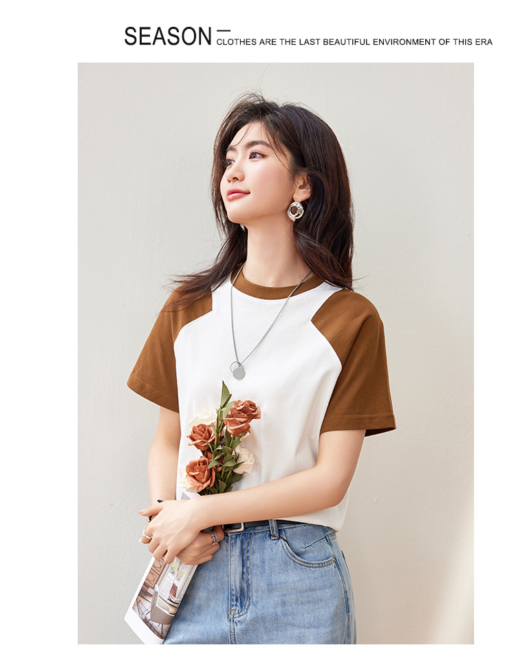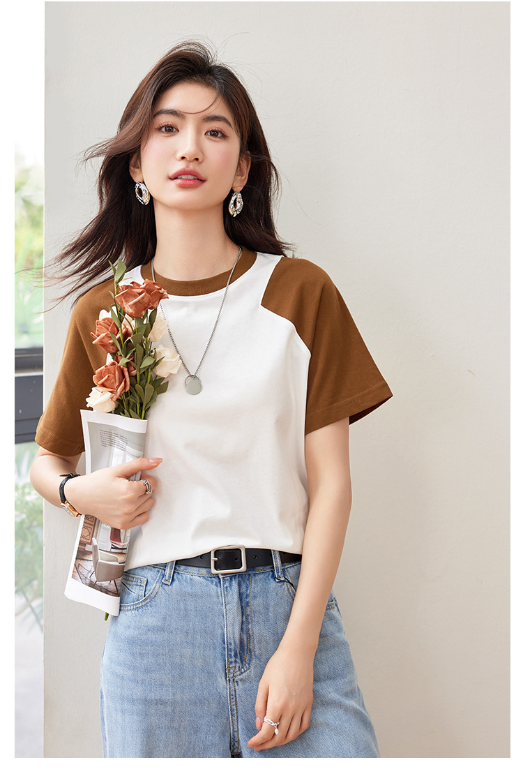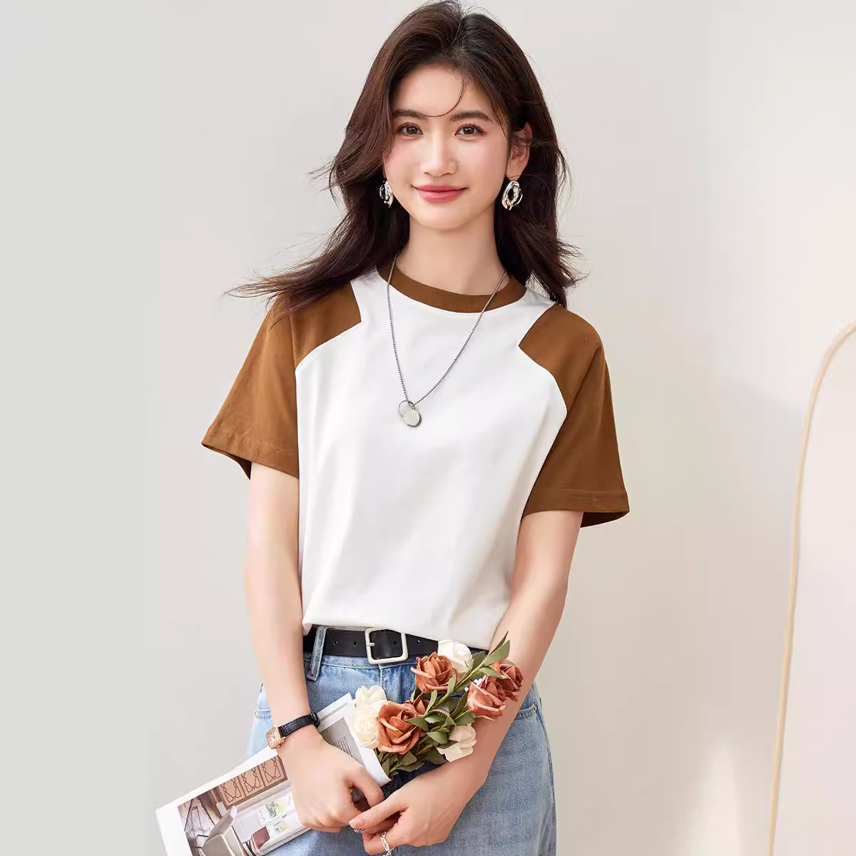 반팔 티셔츠 여성용 2024 년 여름 새로운 한국식 디자인 센스 심플 콘트라스트 컬러 느슨한 슬림 핏 라운드 넥 Ins 트렌디 탑스토어 가기