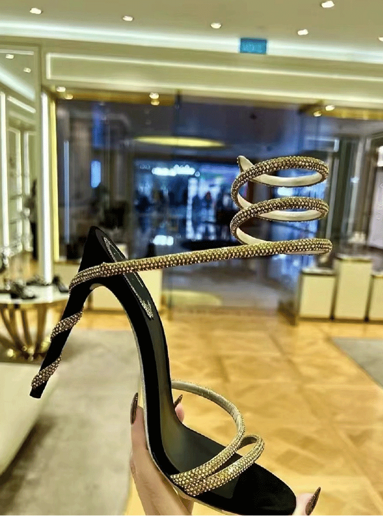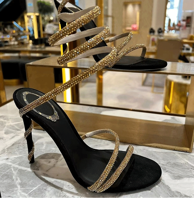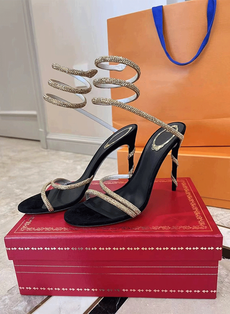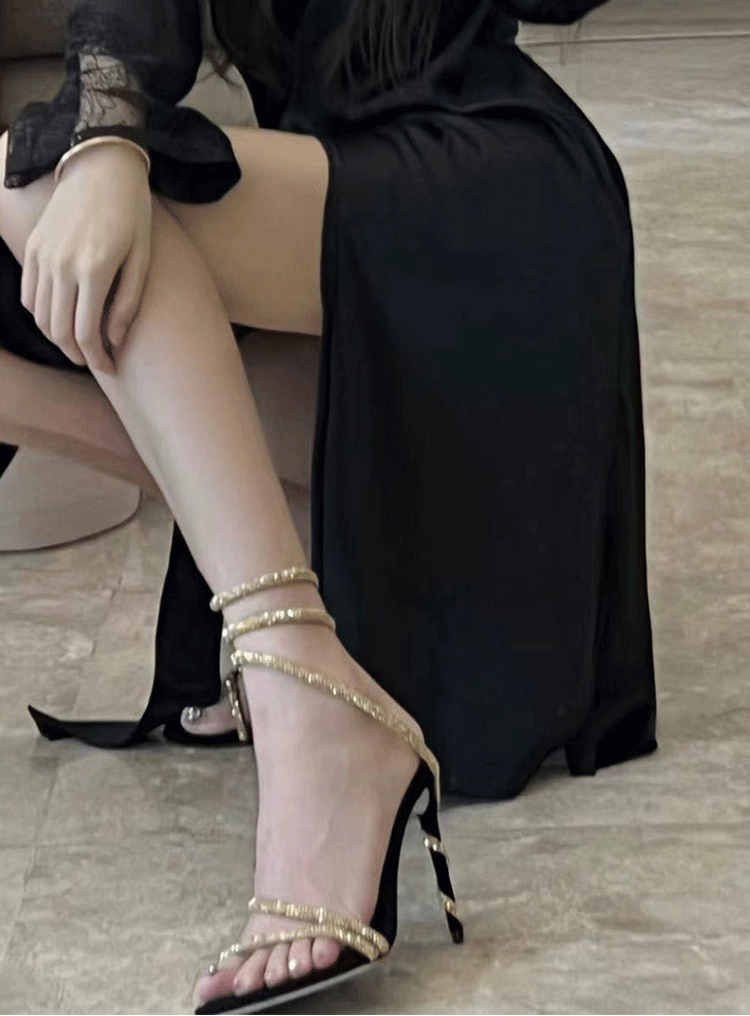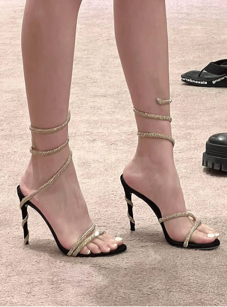라인스톤 뱀 상처 하이힐 여자 2024 년 새 여름 섹시한 사교계 오픈 발가락 얇은 힐 스트랩 샌들