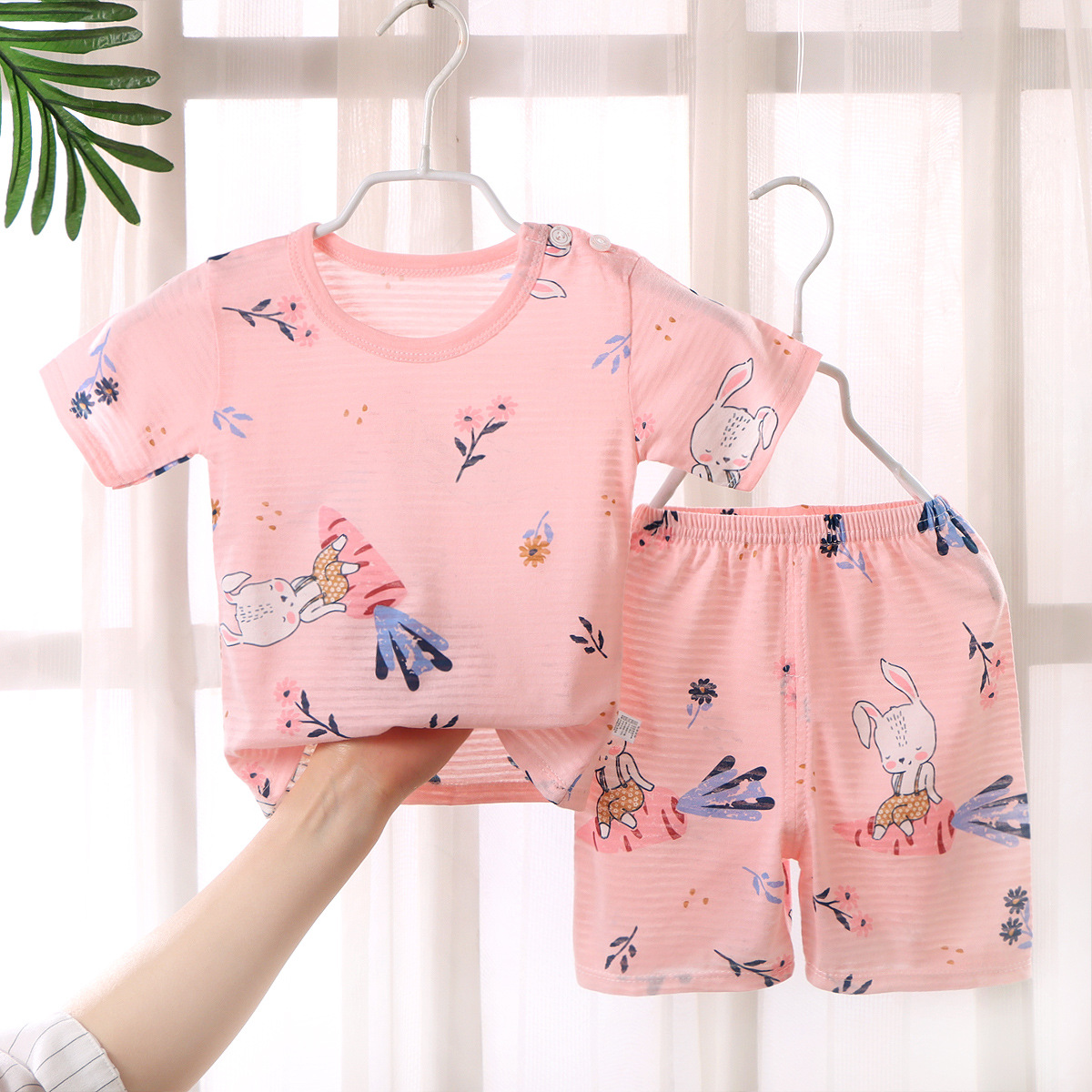새로운 어린이 티셔츠 세트 0-7 세 여름 중소형 어린이 반팔 반바지 홈 의류 땀 흡수성 통기성 잠옷