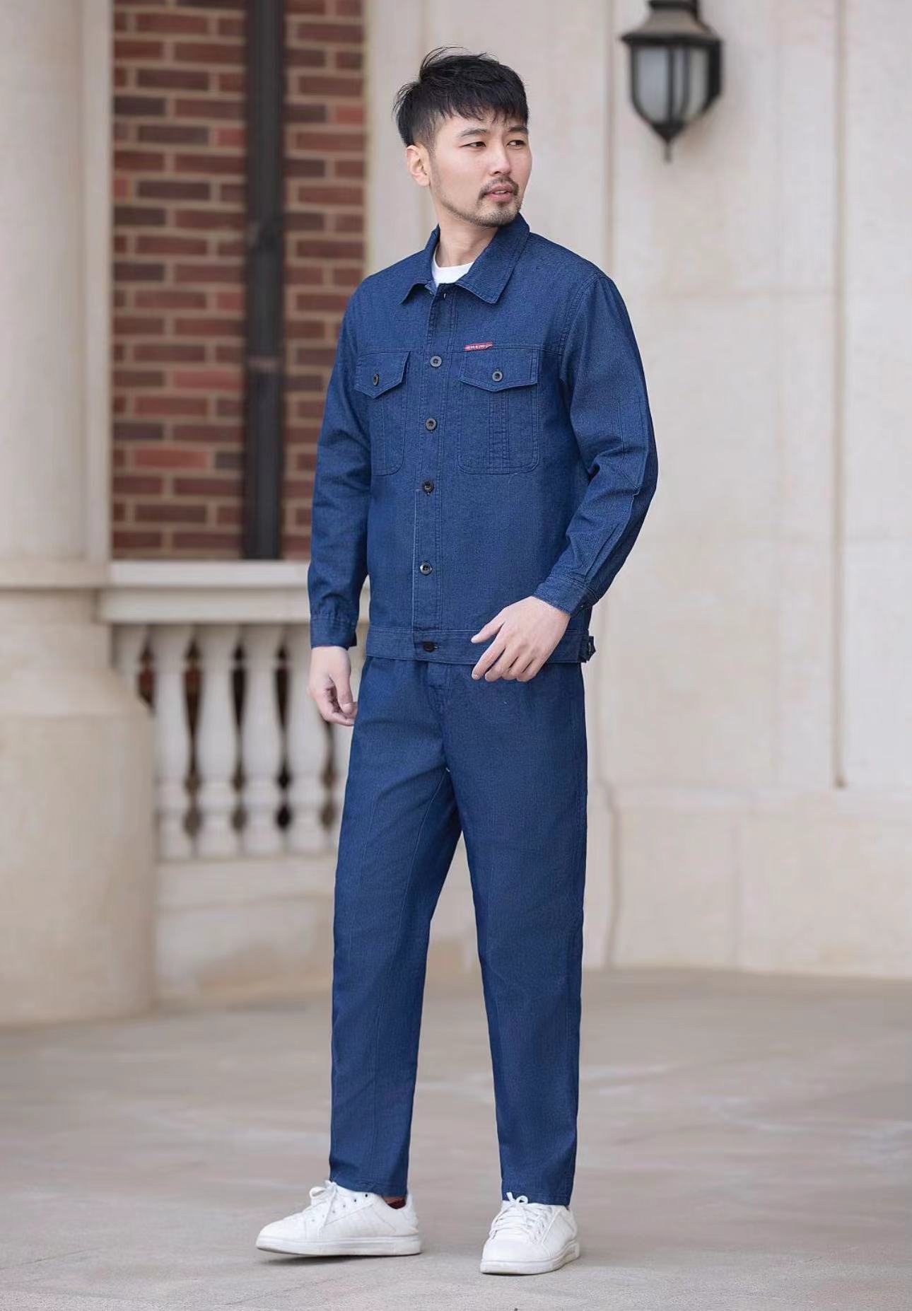 여름 폴리 에스테르 면화 바지 세트 현장 용접 데님 노동 보호 의류 남성 단추 인쇄 자수 재고 도매스토어 가기
