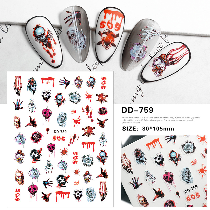Redanco 새로운 3D 그물 붉은 폭발 공포 두개골 네일 스티커 접착제 네일 스티커 도매스토어 가기