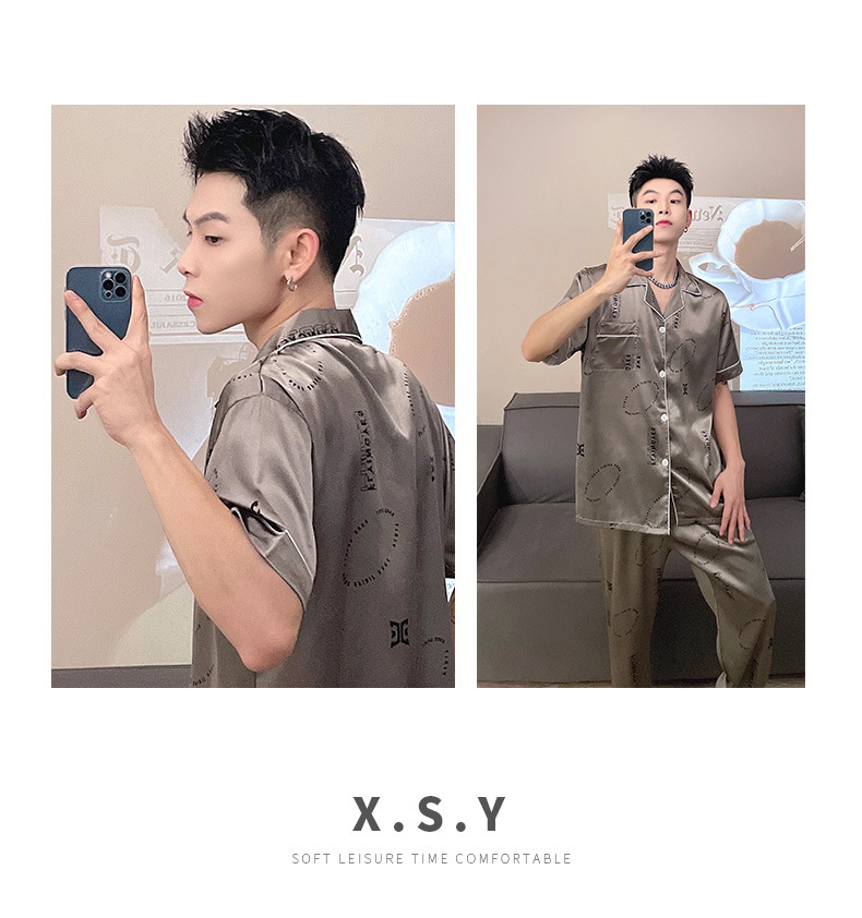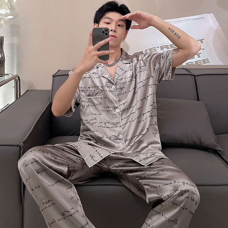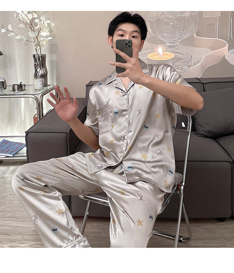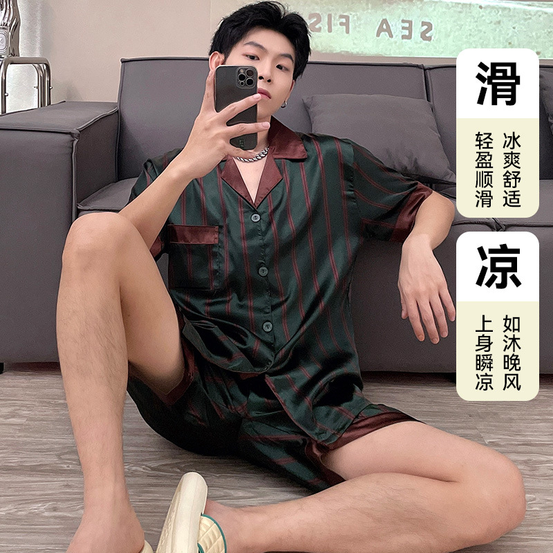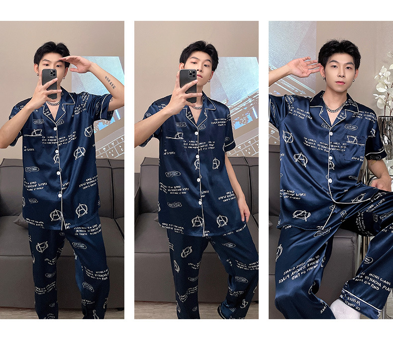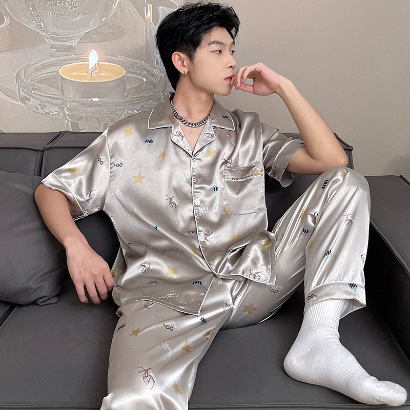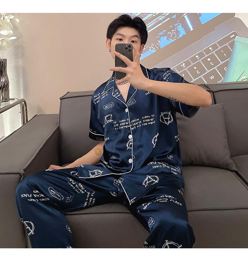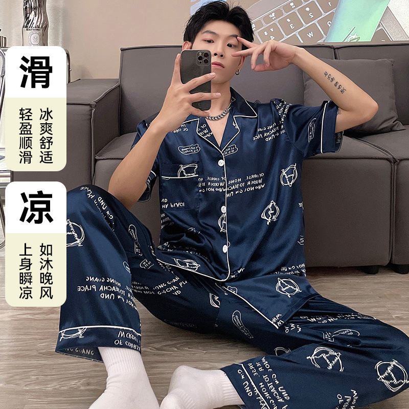 남자 잠옷 여름 반팔 반바지 아이스 실크 얇은 만화 플러스 사이즈 잠옷 남자 실크 세트 외부 착용