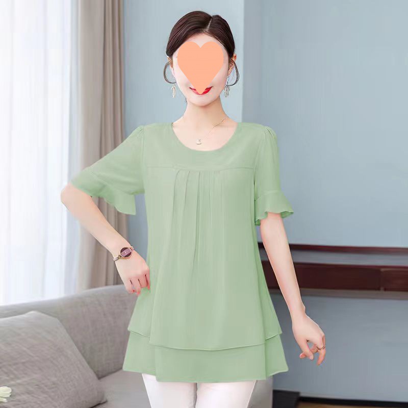 통통한 시폰 반팔 최고 여성 2024 년 여름 새로운 오버 사이즈 플러스 사이즈 느슨한 배 덮음 우아한 서양식 작은 셔츠스토어 가기