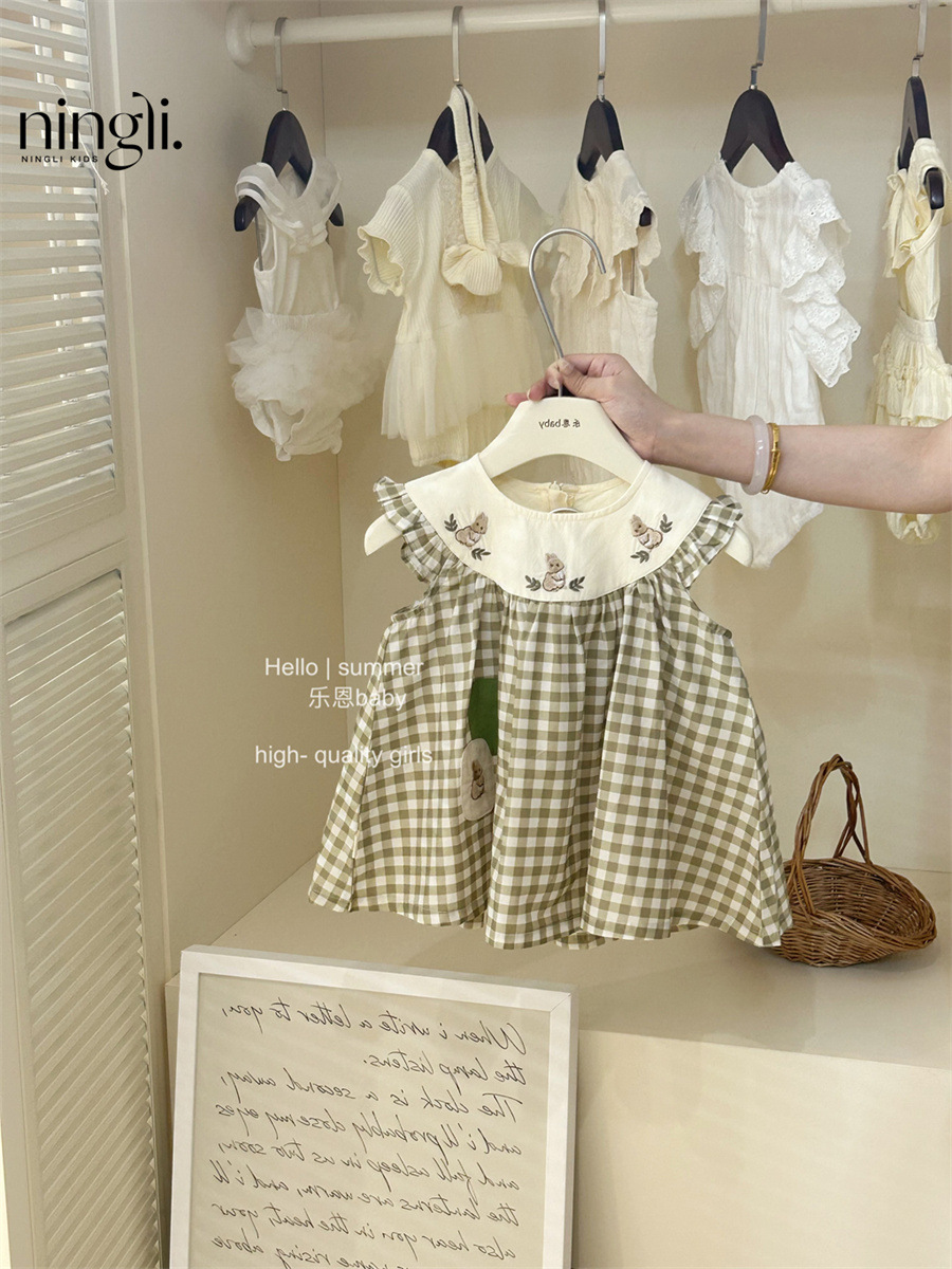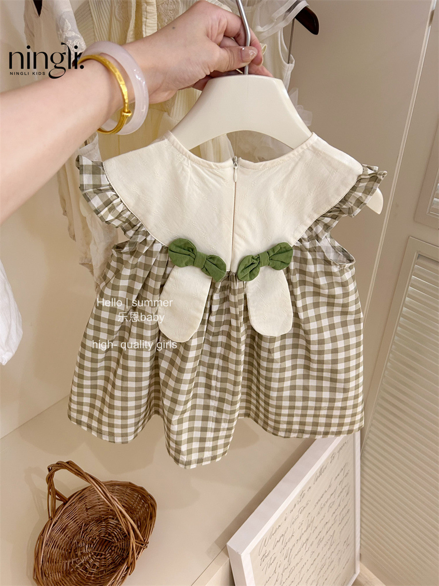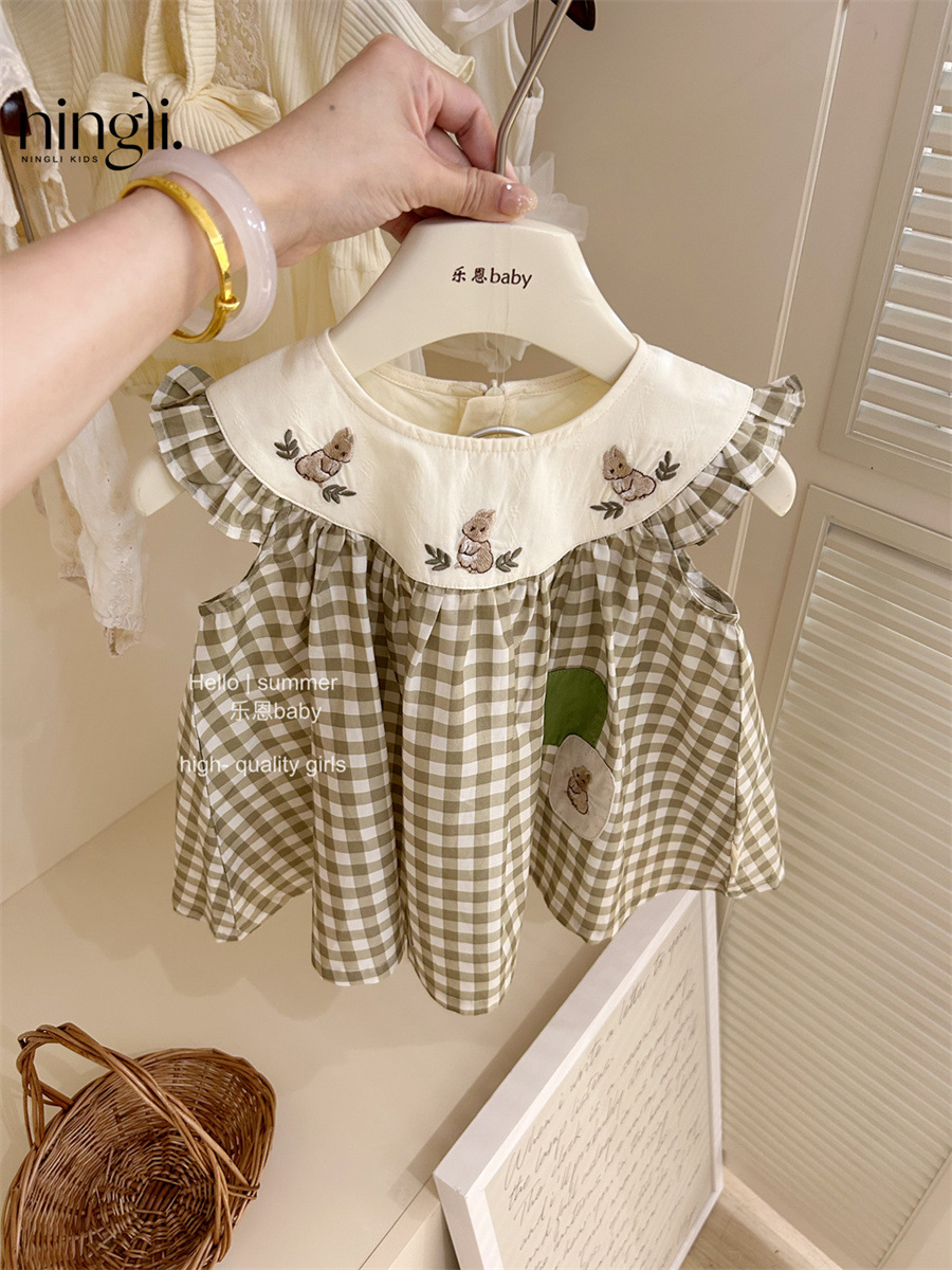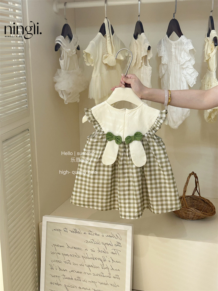 라임 한국 소녀 여름 새 토끼 녹색 격자 무늬 치마 아기 세련된 원피스 한국 스타일 유행 공주 치마