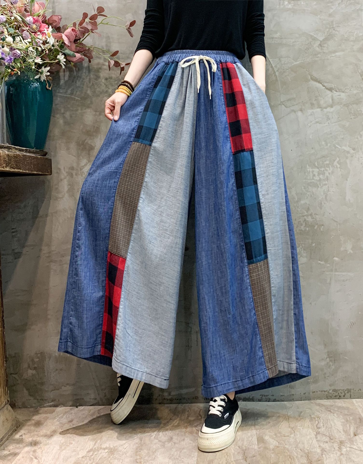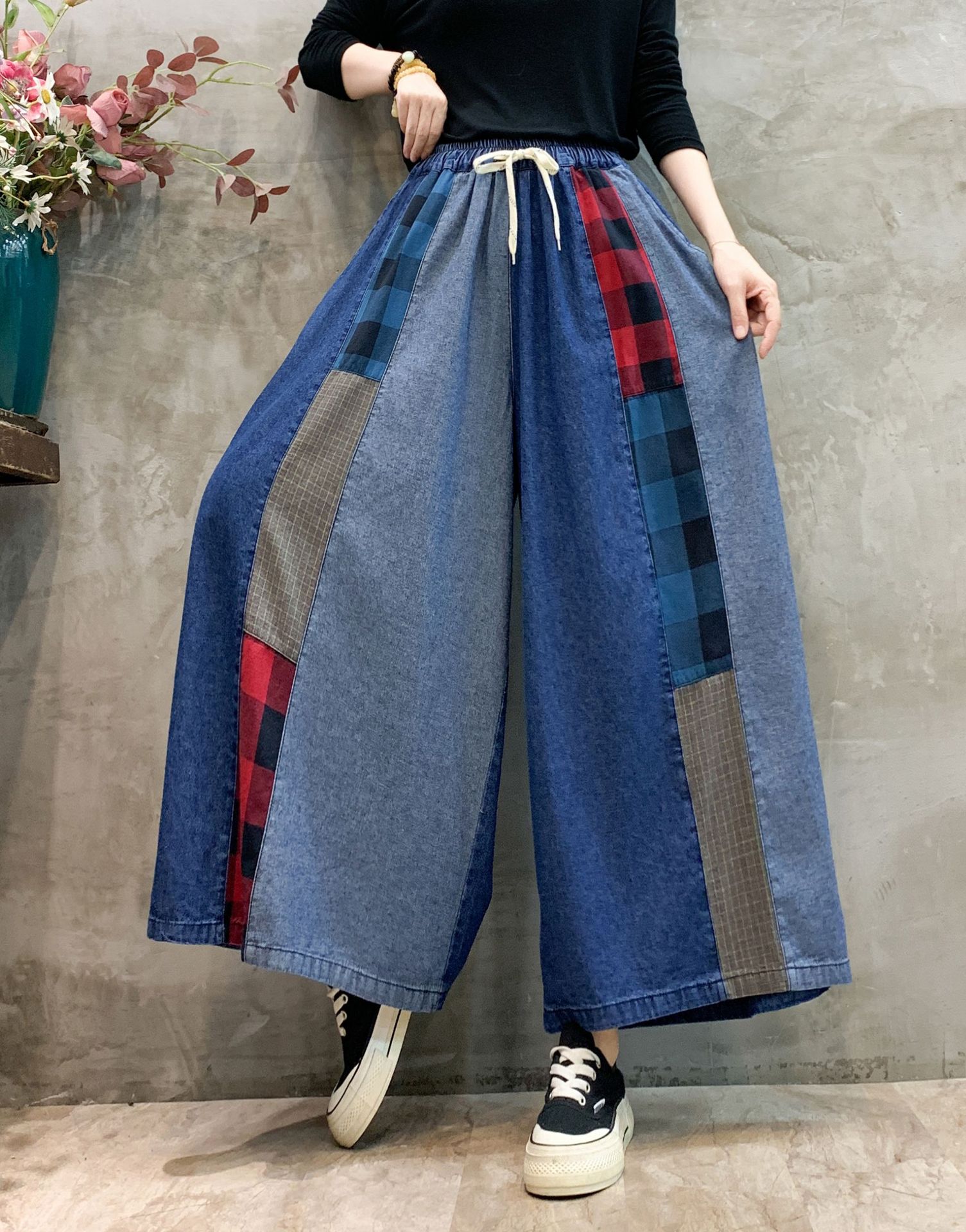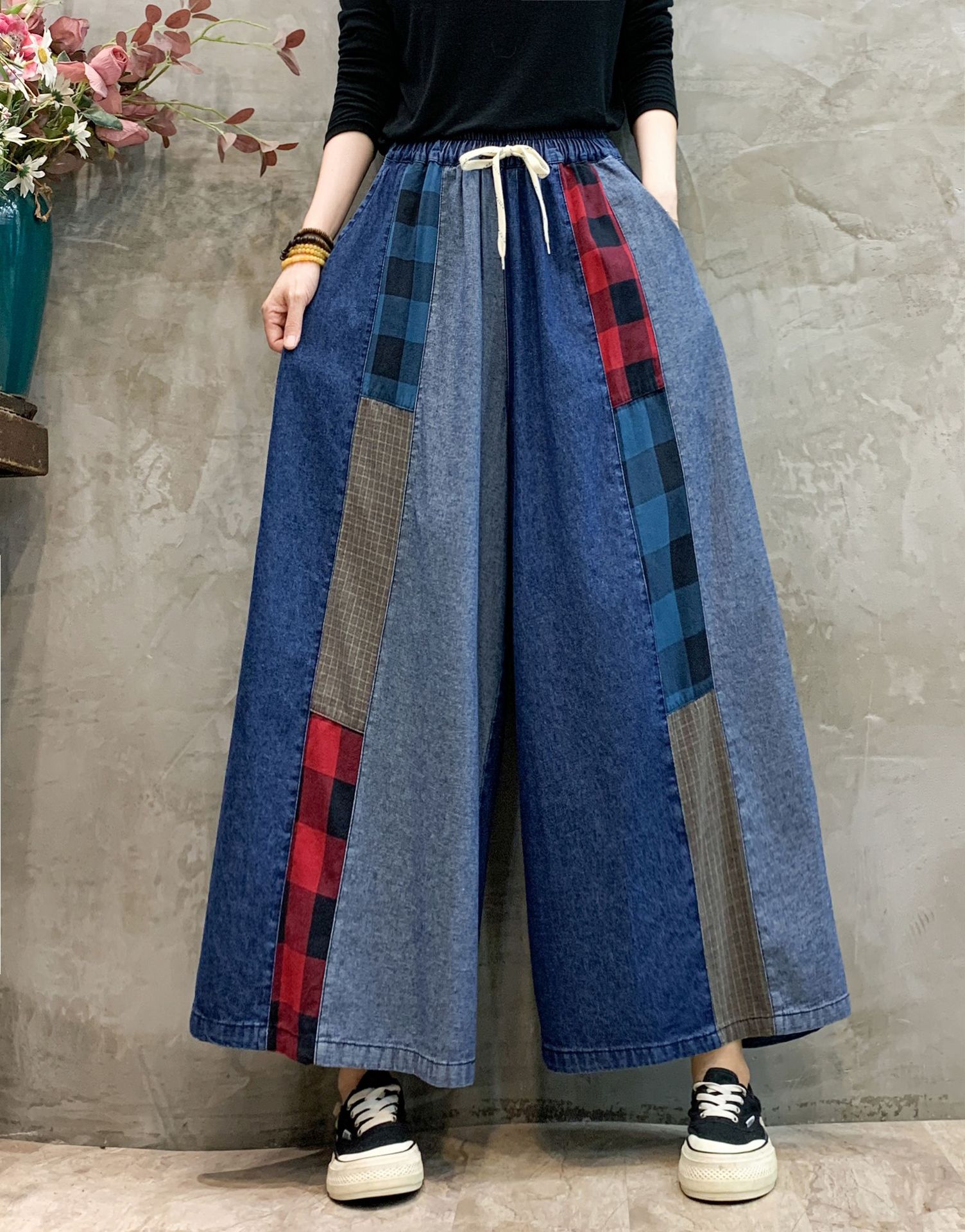 청바지 새로운 패션 캐주얼 컬러 매칭 패치 높은 허리 레이스 업 탄성 넓은 다리 스트레이트 바지 도매스토어 가기