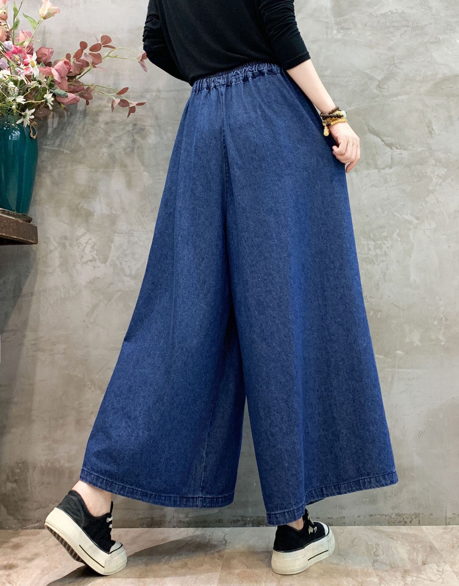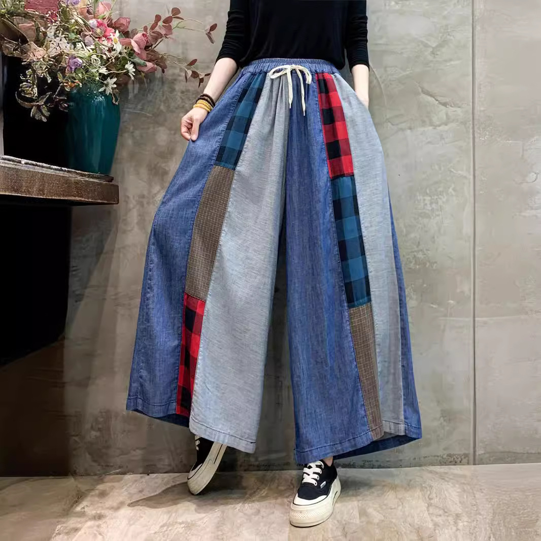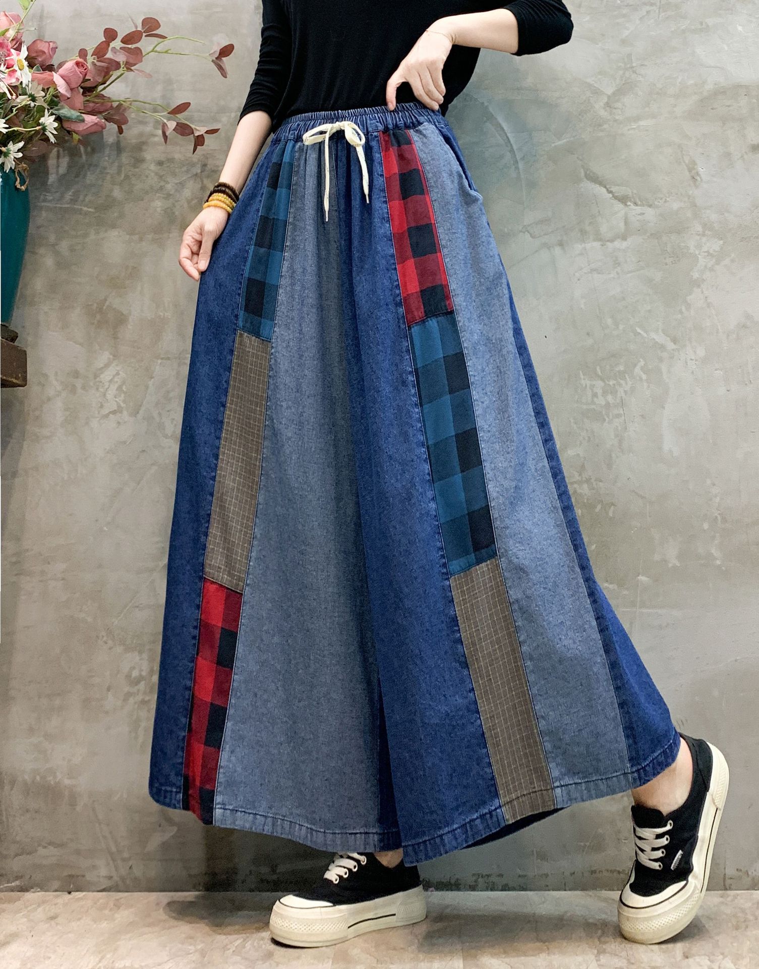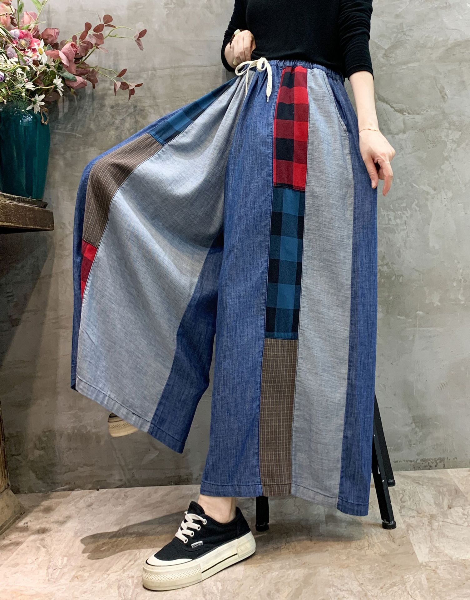 청바지 새로운 패션 캐주얼 컬러 매칭 패치 높은 허리 레이스 업 탄성 넓은 다리 스트레이트 바지 도매스토어 가기