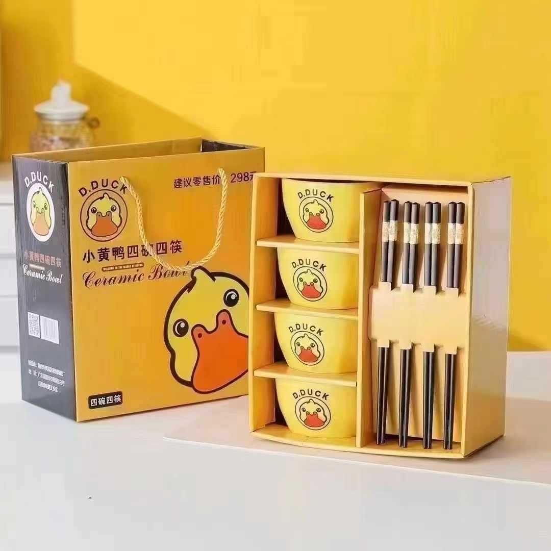• 작은 노란 오리 사각 그릇 합금 그릇 4개 젓가락 4개 각 20세트