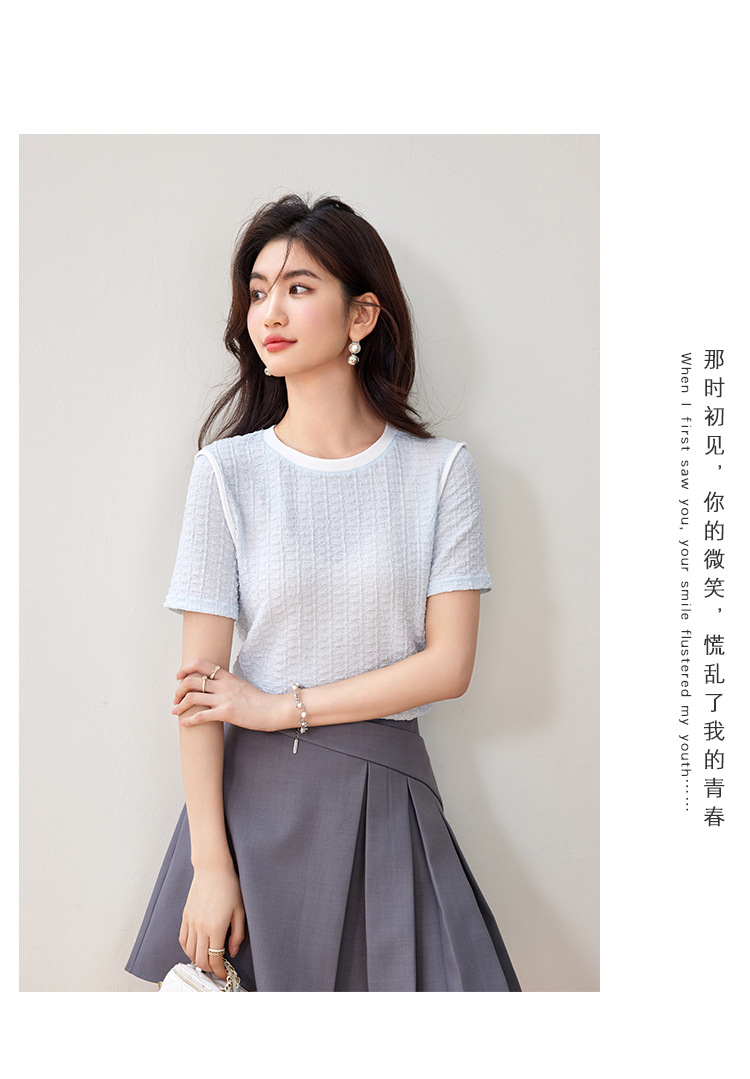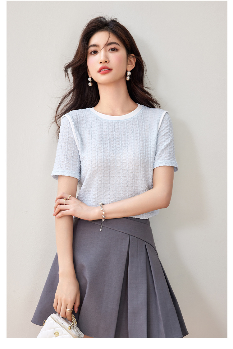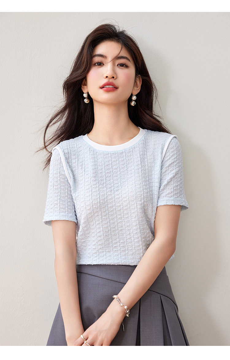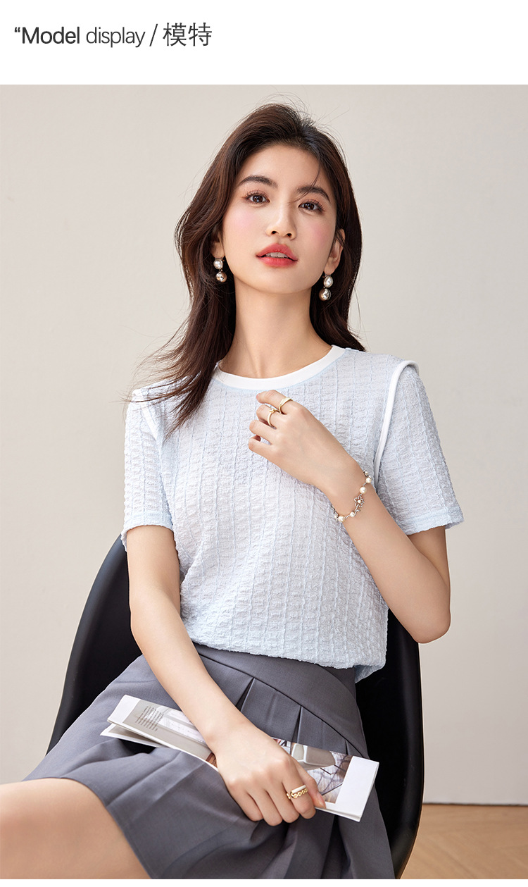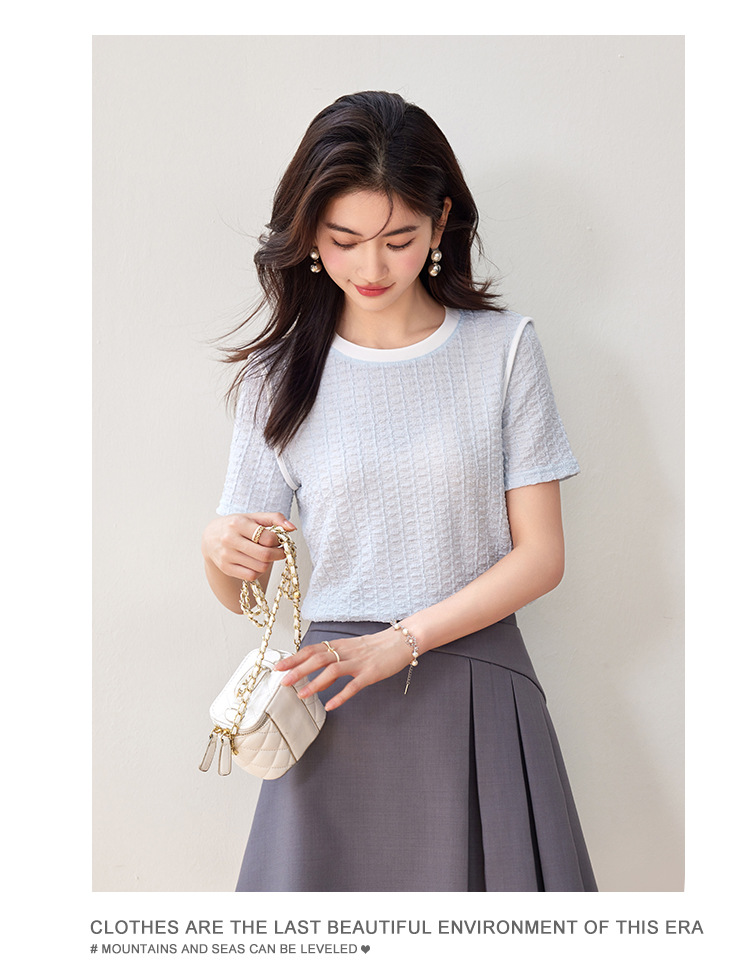 질감 반팔 티셔츠 여성용 2024 년 여름 새로운 프랑스 우아한 둥근 목 대비 색상 느슨한 슬리밍 주름