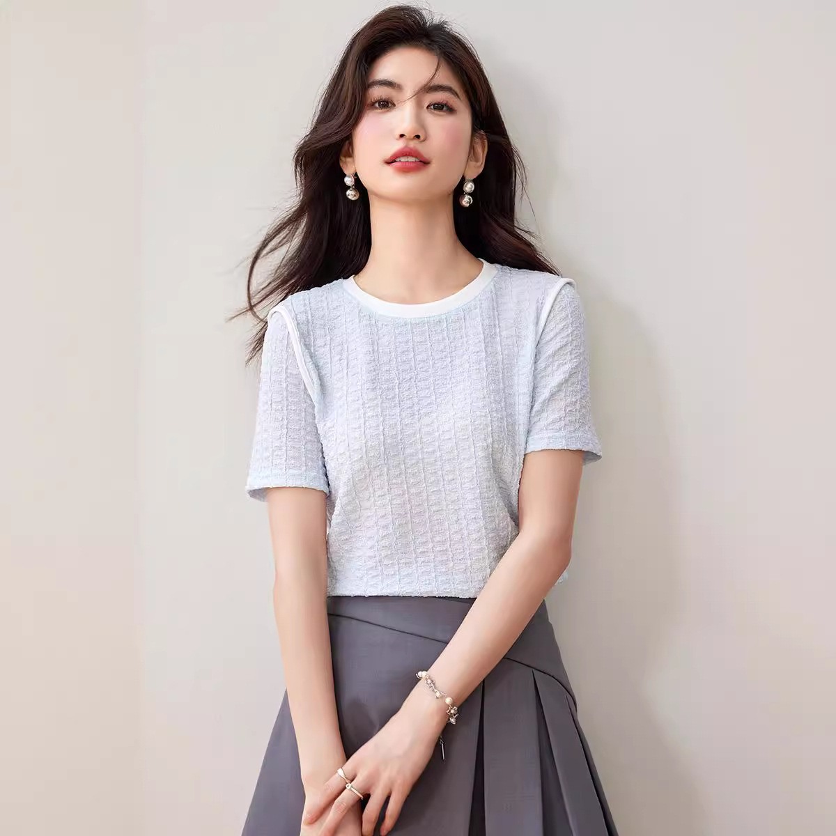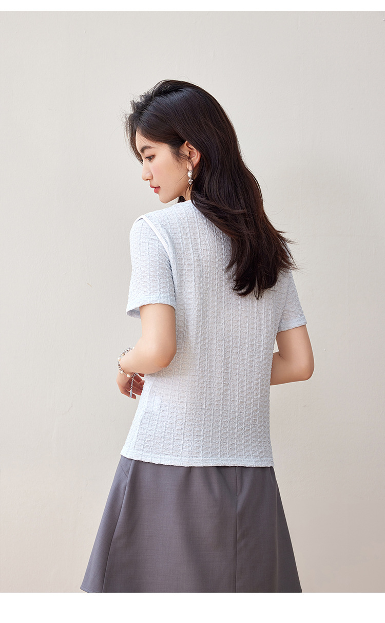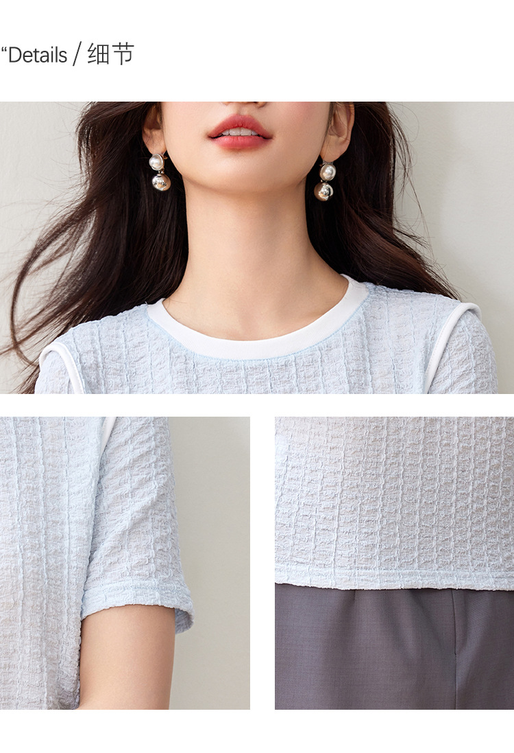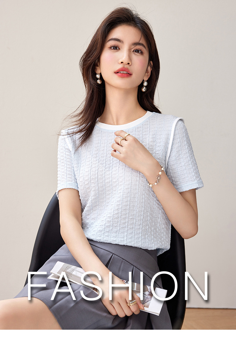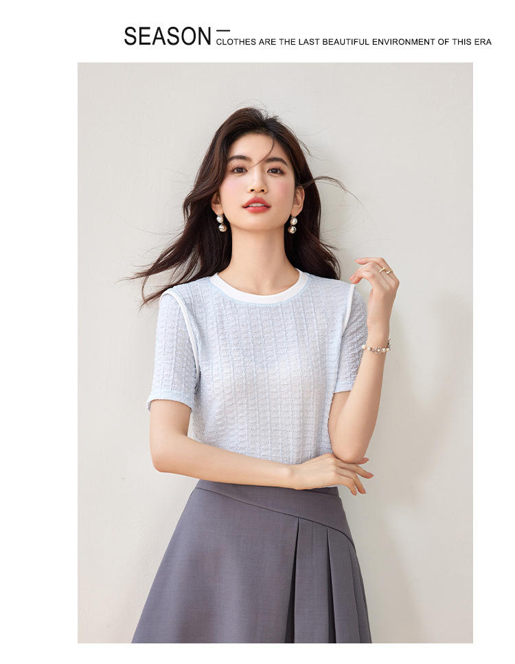 질감 반팔 티셔츠 여성용 2024 년 여름 새로운 프랑스 우아한 둥근 목 대비 색상 느슨한 슬리밍 주름