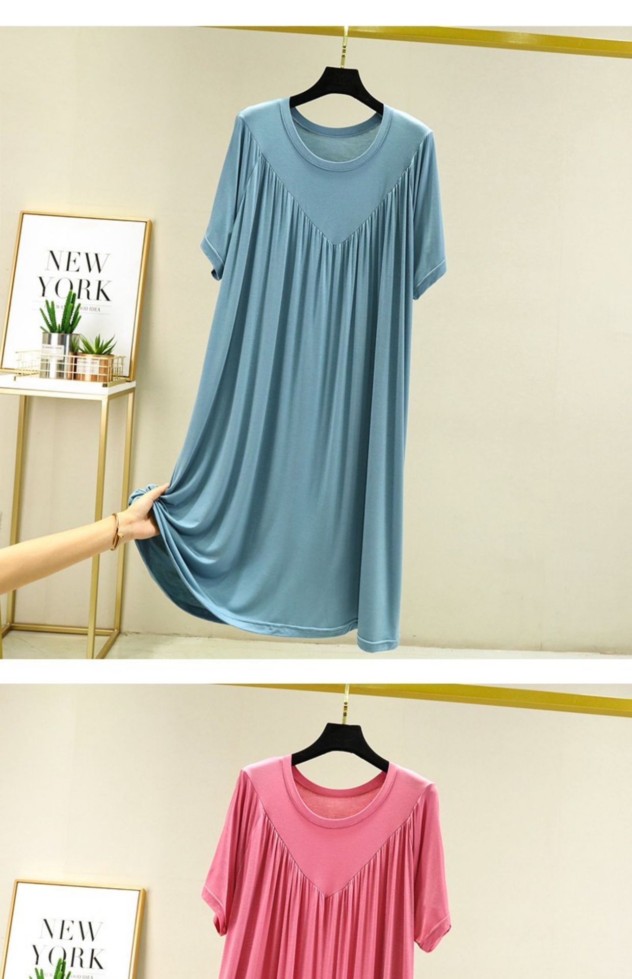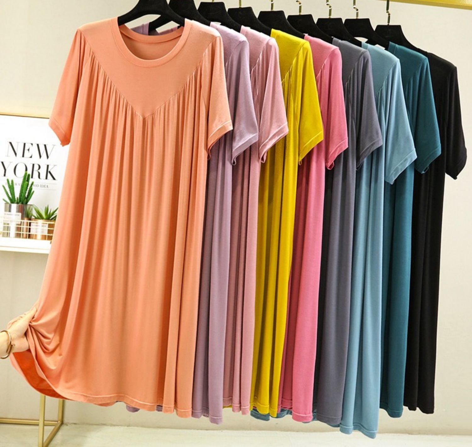 모달 원피스 여자 여름 2024 플러스 플러스 사이즈 크루 넥 주름 치마 얇은 통통녀 느슨한 반팔 긴 치마스토어 가기