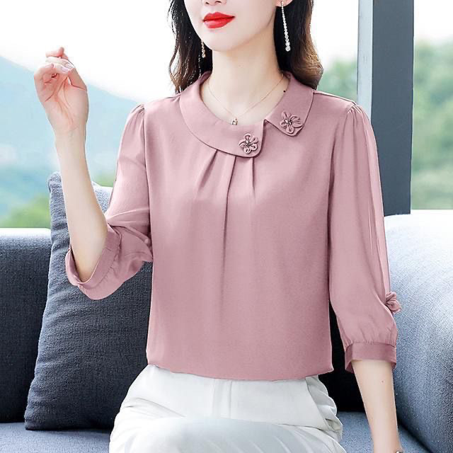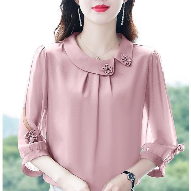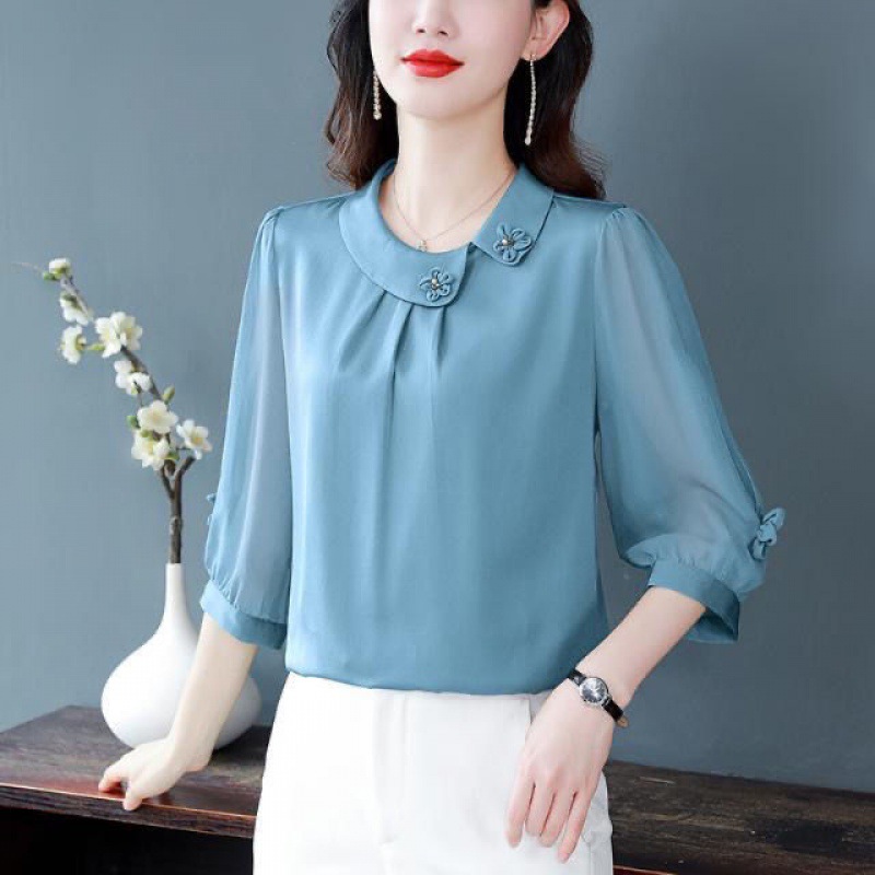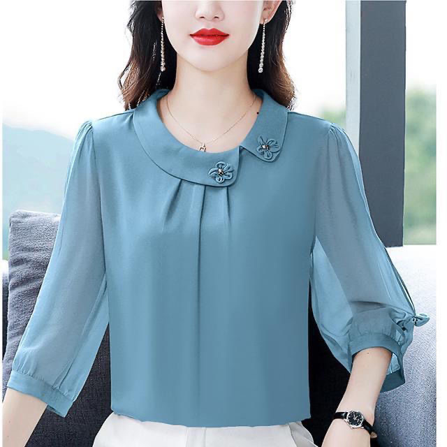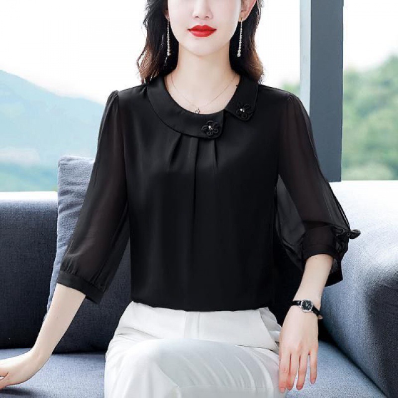 여름 새로운 서양식 하이 엔드 플러스 사이즈 통통녀 솔리드 컬러 세븐 슬리브 쉬폰 셔츠 느슨한 슬림 벨리 커버 나이 감소 탑스토어 가기