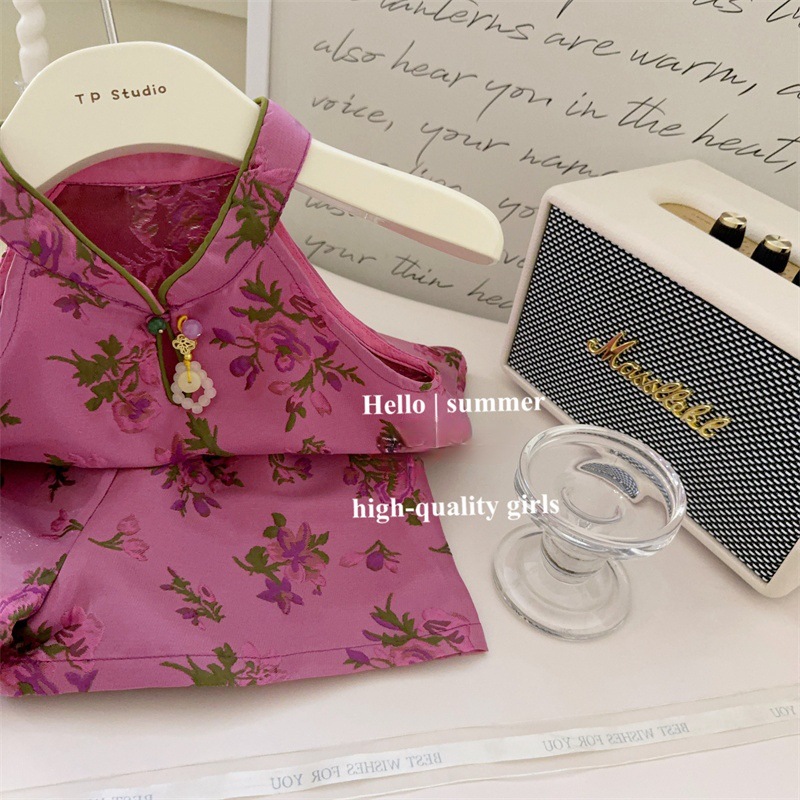 핑크 하우스 걸스 2024 여름 노크 사랑 귀여운 새로운 중국 브로케이드 자수 조끼 반바지 세트 여름스토어 가기