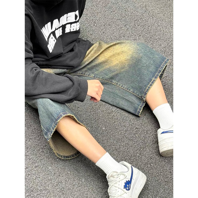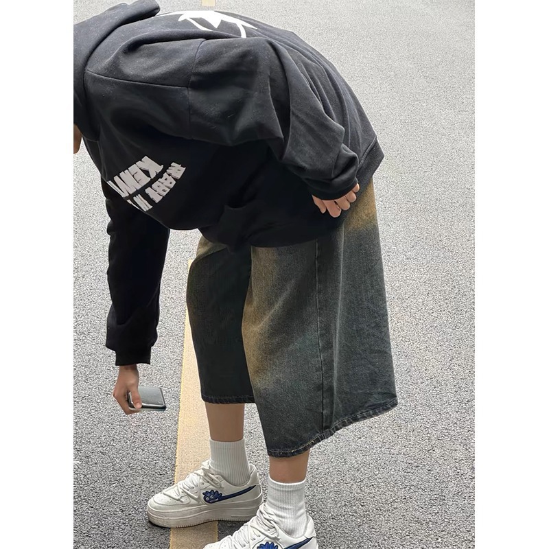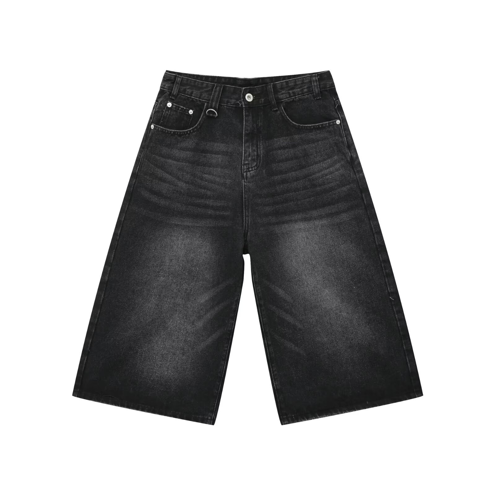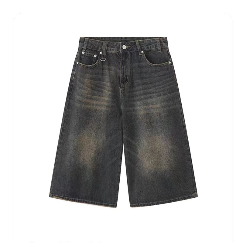 여름 아메리칸 스타일 레트로 구식 데님 반바지 남자 클렌핏 틈새 올 매치 루즈 와이드 레그 크롭 팬츠스토어 가기