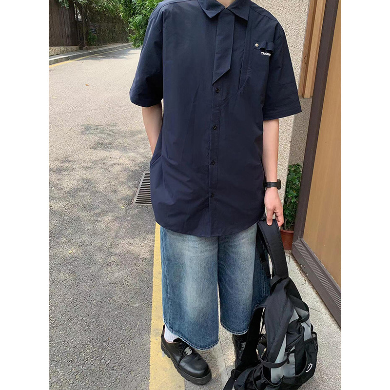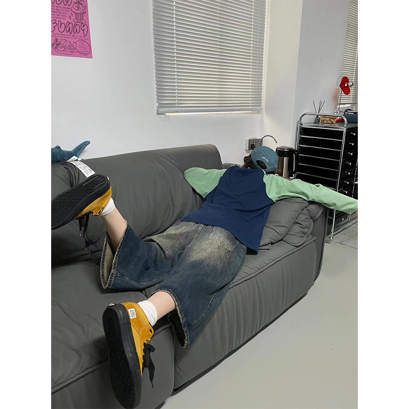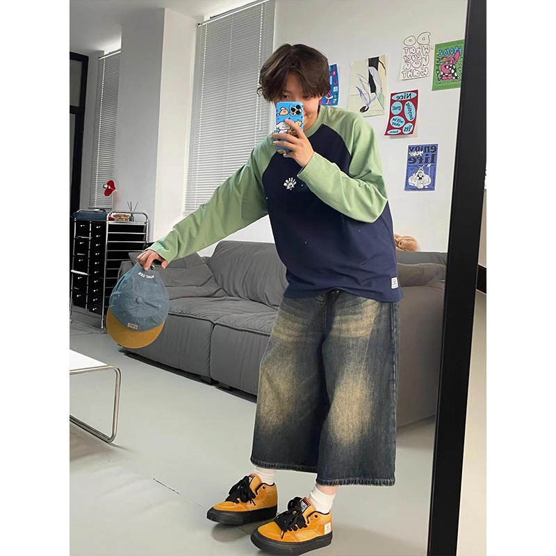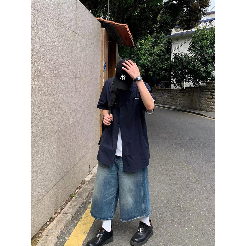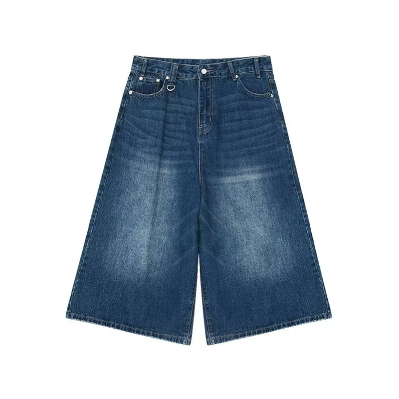 여름 아메리칸 스타일 레트로 구식 데님 반바지 남자 클렌핏 틈새 올 매치 루즈 와이드 레그 크롭 팬츠스토어 가기