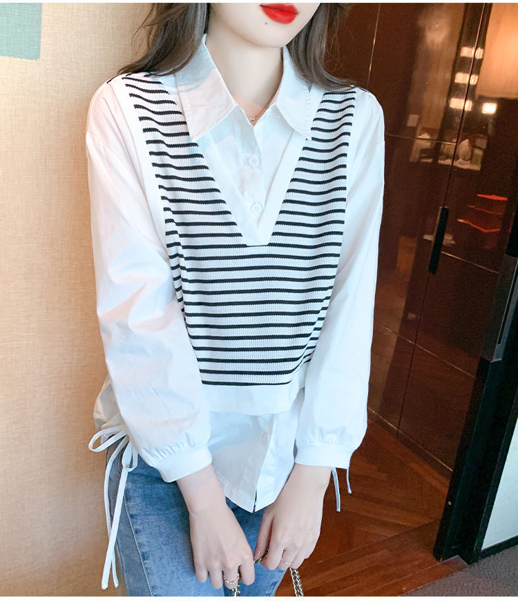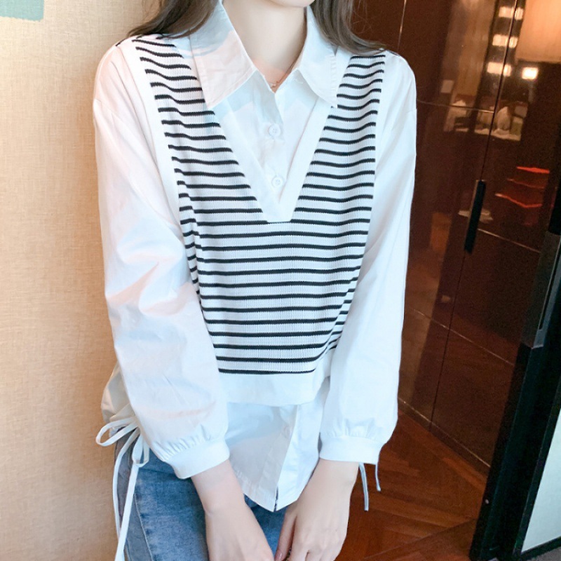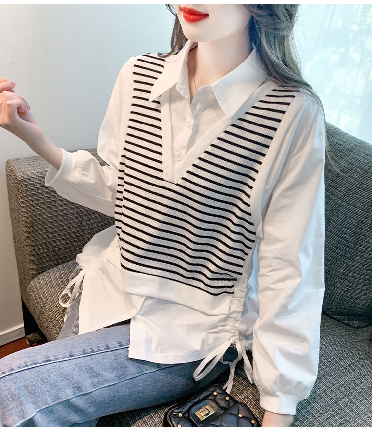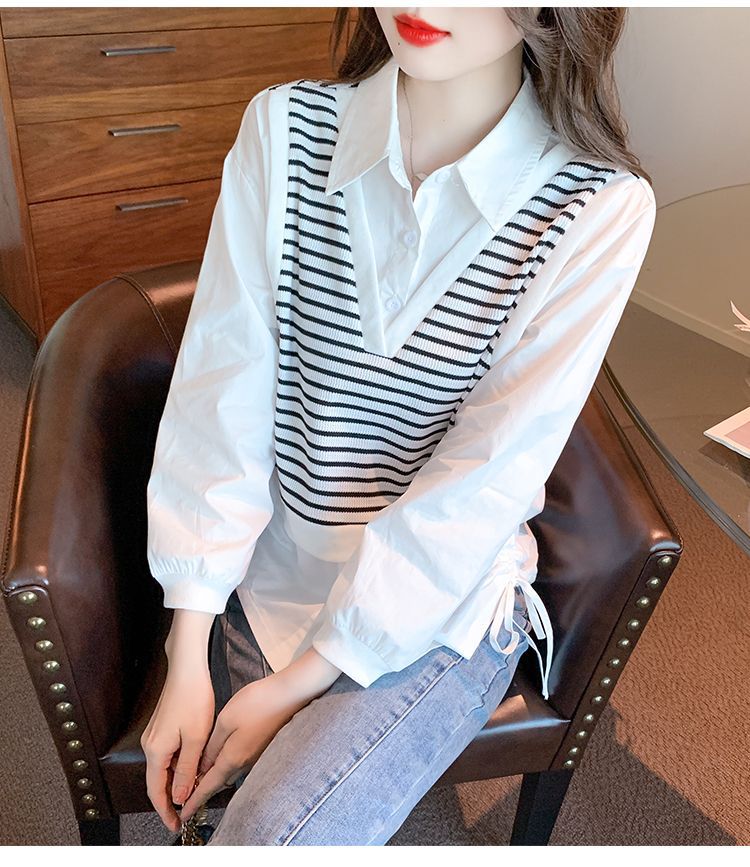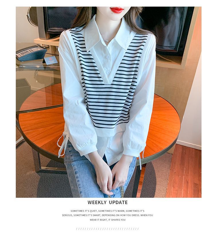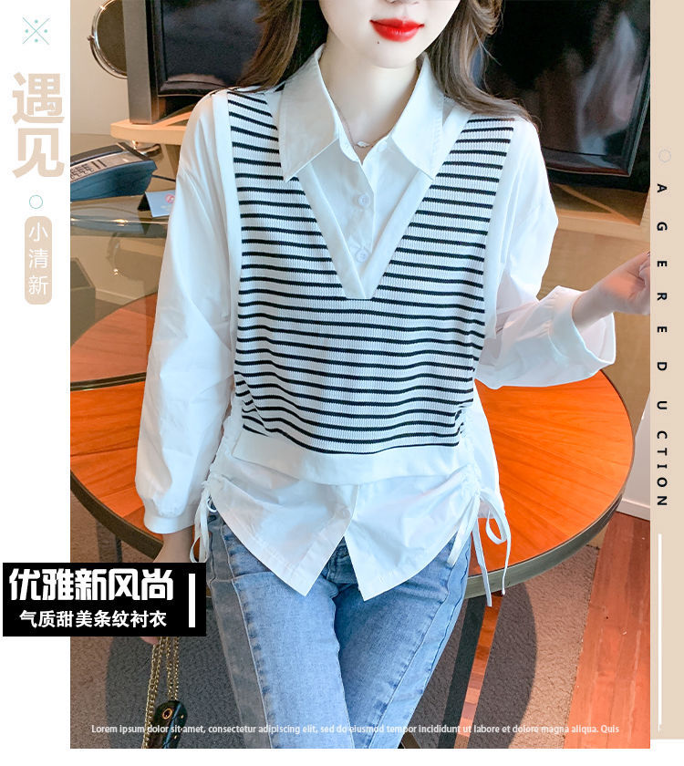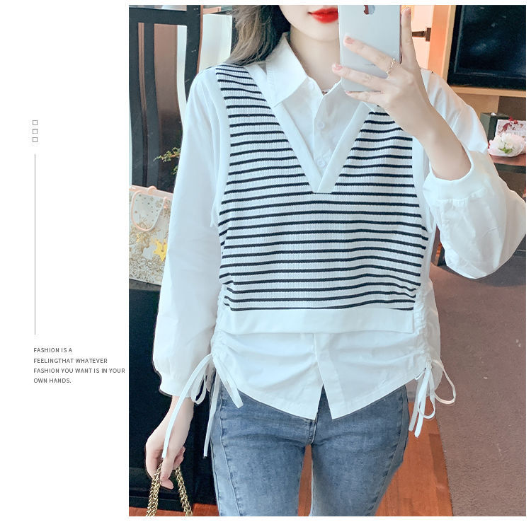 가짜 투피스 스트라이프 셔츠 여성복 2025 신상 가을 폴로 칼라 드로스트링 긴팔 쉬폰 탑 예쁜 블라우스