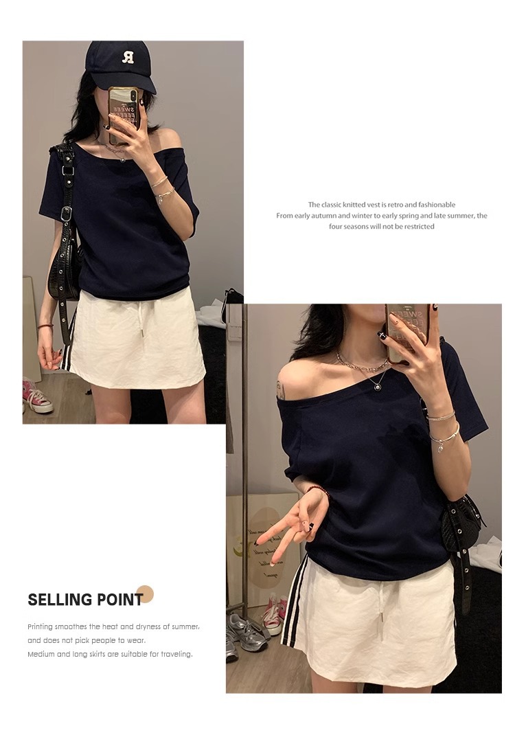 여성을위한 흰색 단색 오프 숄더 반팔 티셔츠 2025 여름 새로운 스타일 원 숄더 루즈한 살을 커버하고 슬리밍 탑