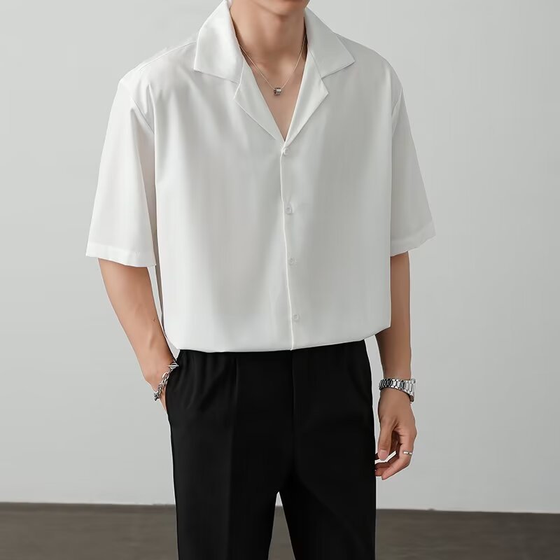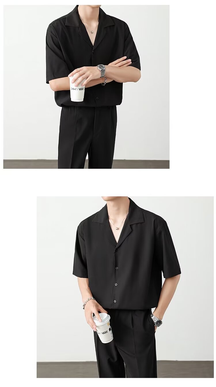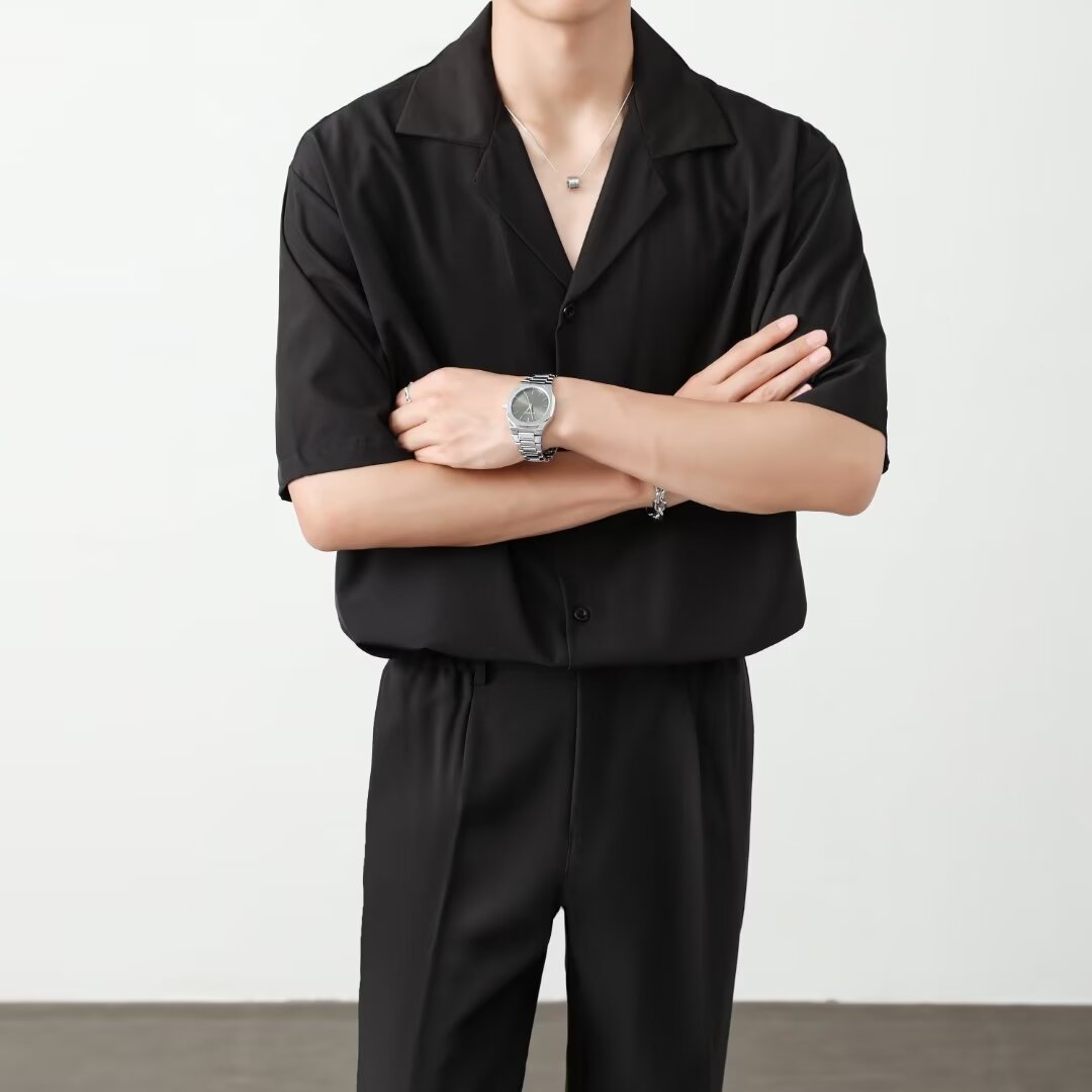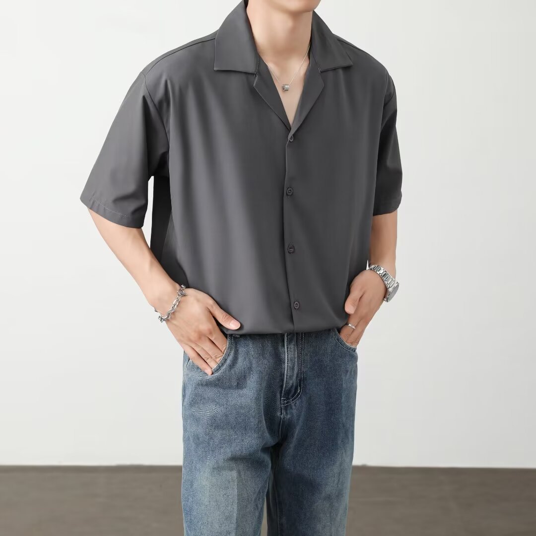 아이스 실크 반팔 셔츠 남자 여름 한국식 셔츠 홍콩 스타일 일본식 느슨한 플러스 사이즈 반소매 셔츠 비 다림질 주름 셔츠