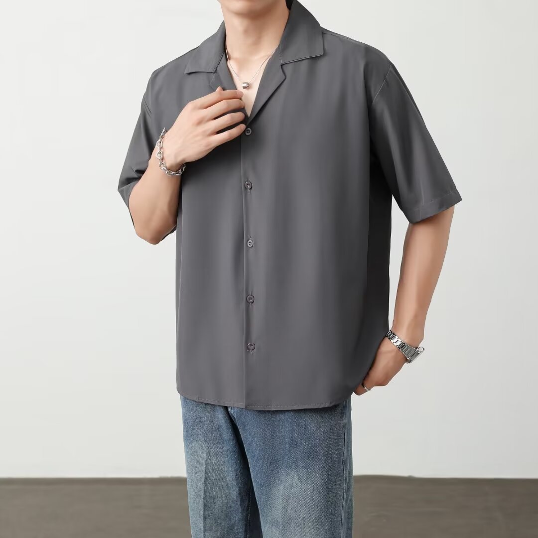 아이스 실크 반팔 셔츠 남자 여름 한국식 셔츠 홍콩 스타일 일본식 느슨한 플러스 사이즈 반소매 셔츠 비 다림질 주름 셔츠스토어 가기
