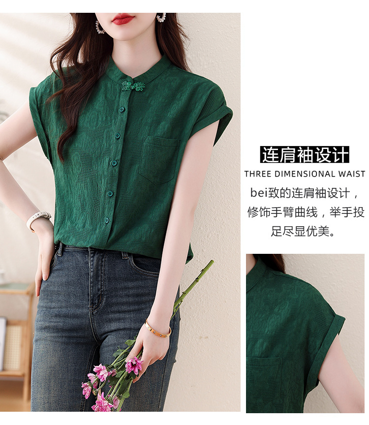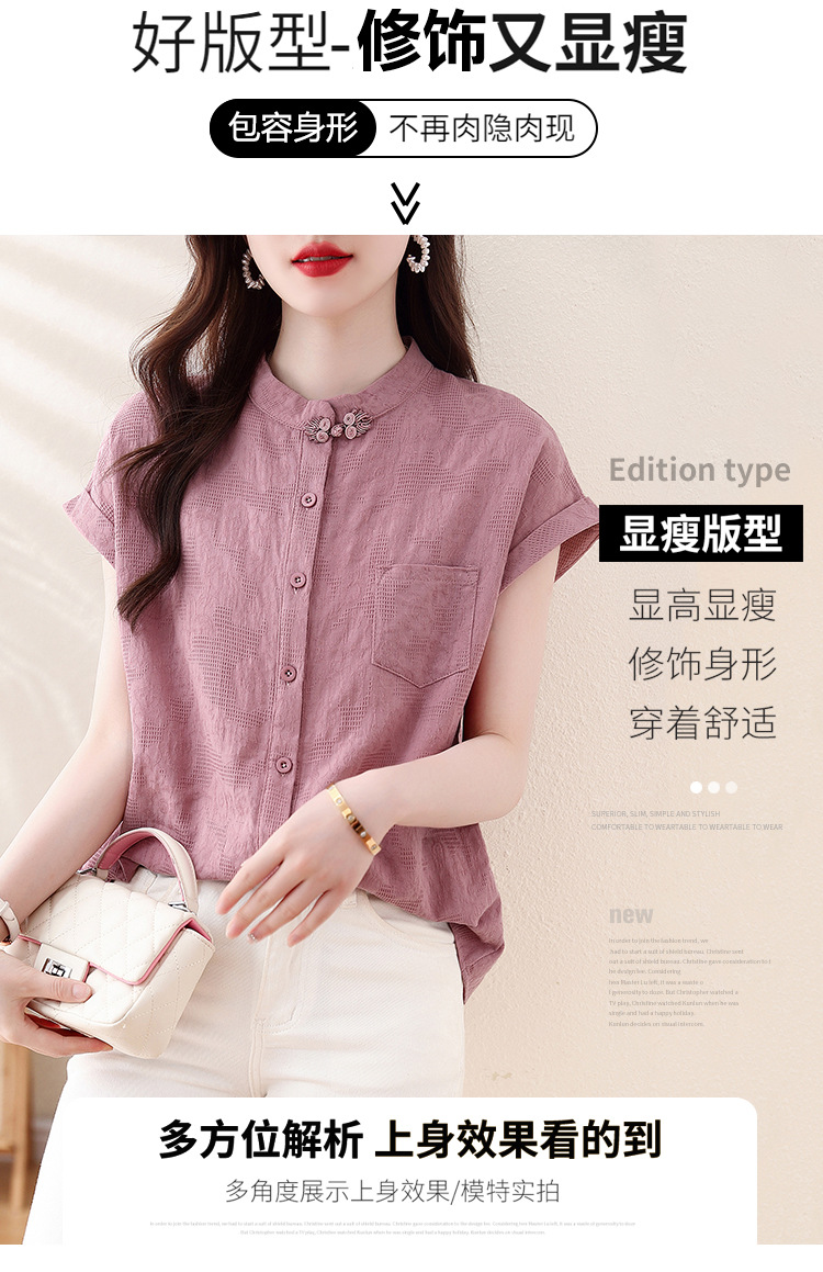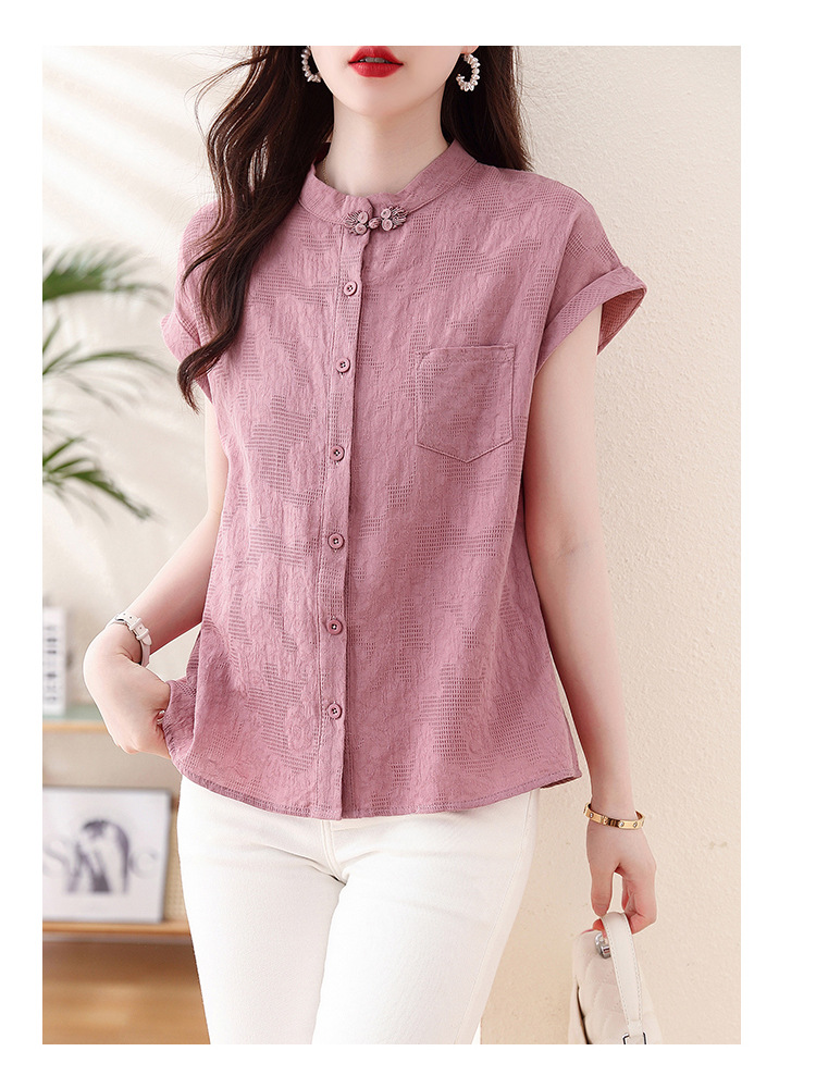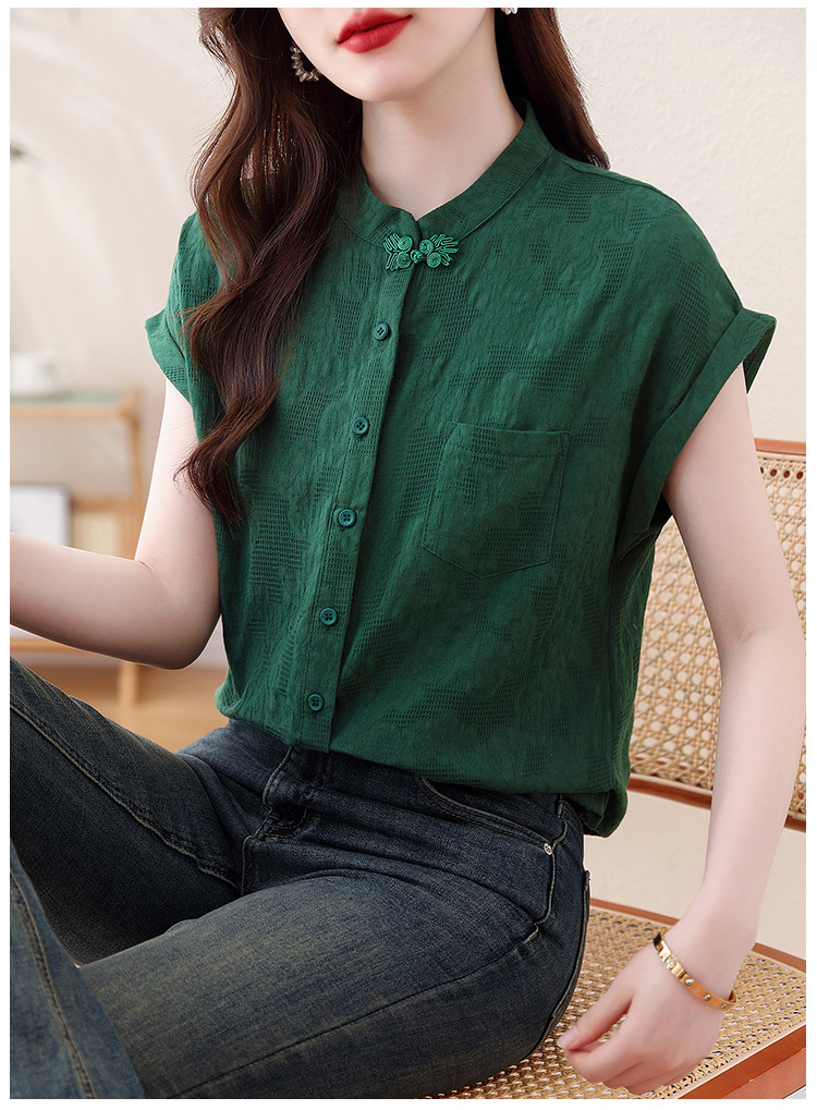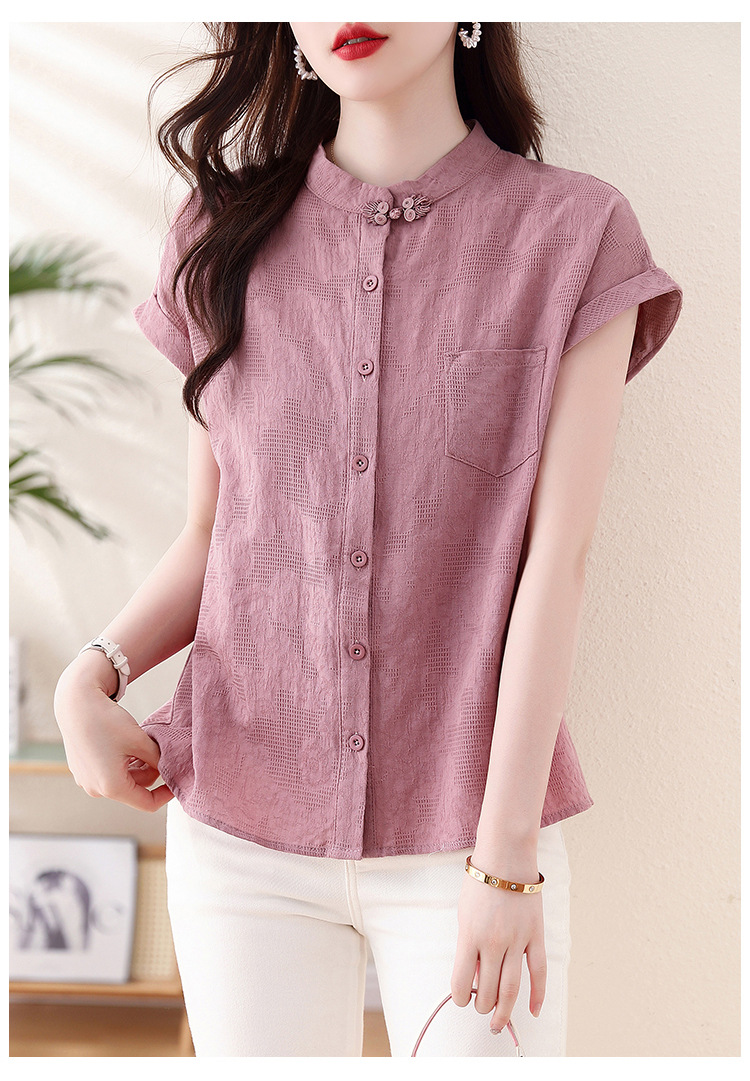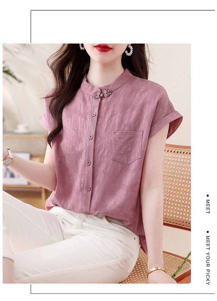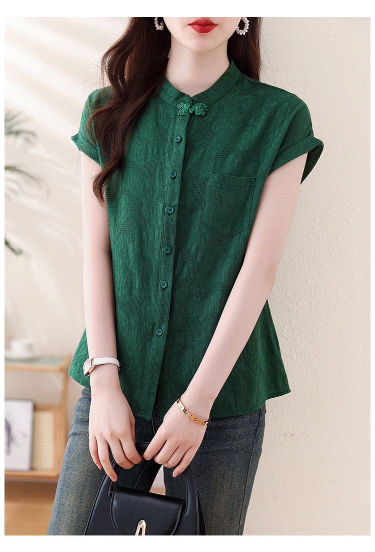 2024 여름 새로운 새로운 중국 스타일 국가 스타일 버클 짧은 소매 셔츠 슬림 베이스 코트 여성 도매스토어 가기
