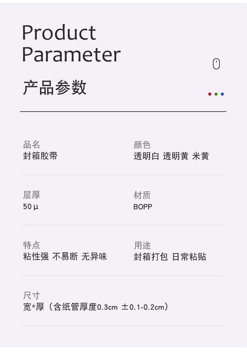 • 투명한 노란색; 폭 5.5cm × 두께 1.7cm × 길이 130y (전체 상자에 72롤)