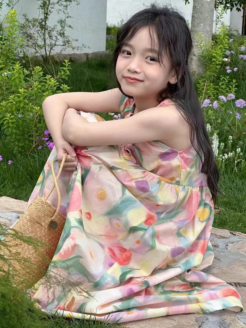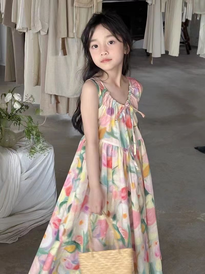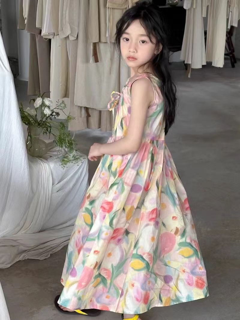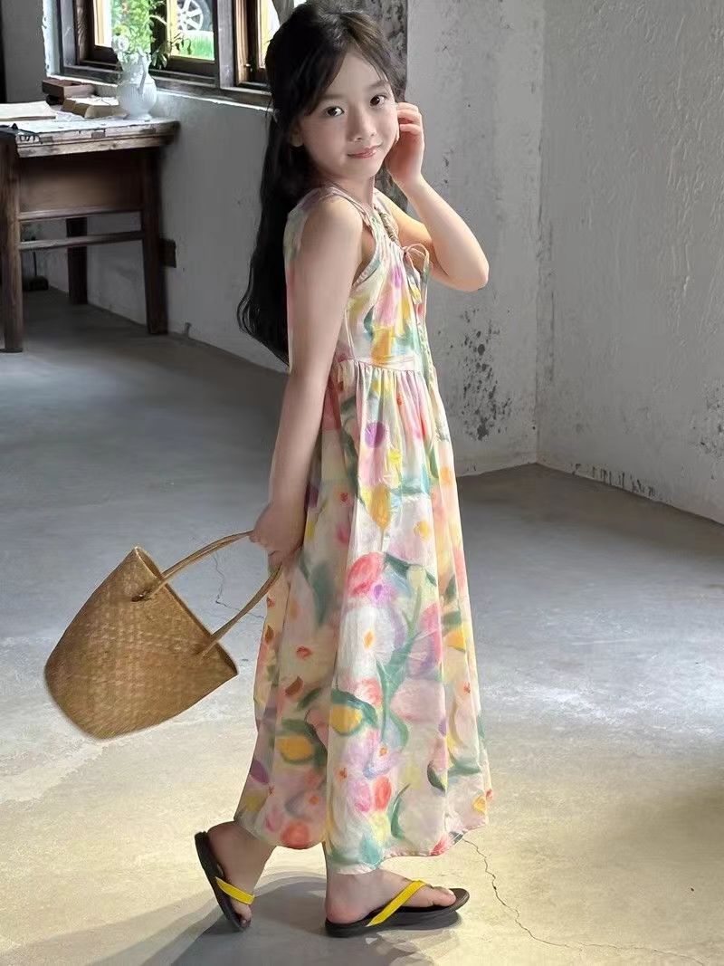 조끼 원피스 2024 여름 중년 어린이와 소녀 유화 스타일 큰 꽃 긴 원피스 여름 휴일 스타일 긴 원피스