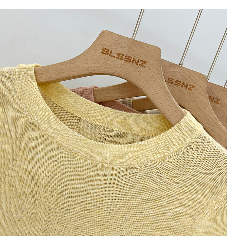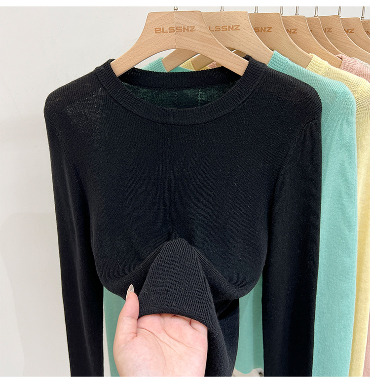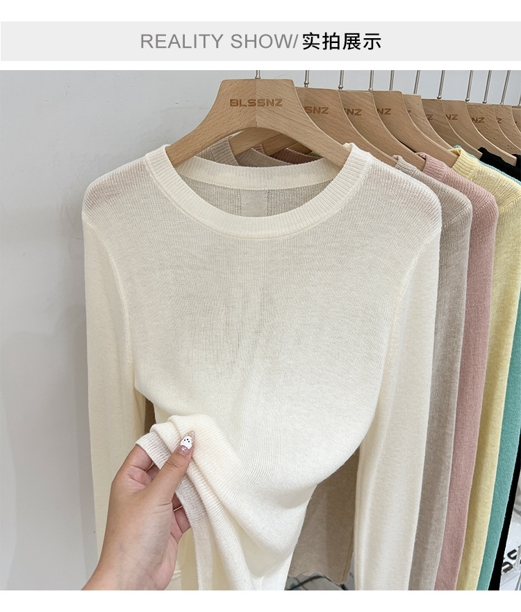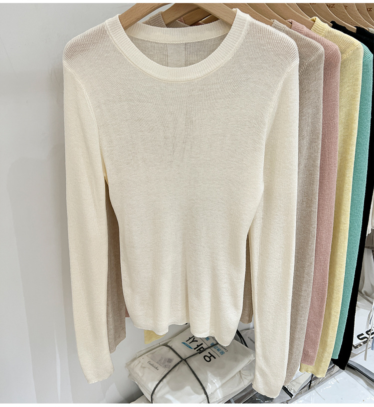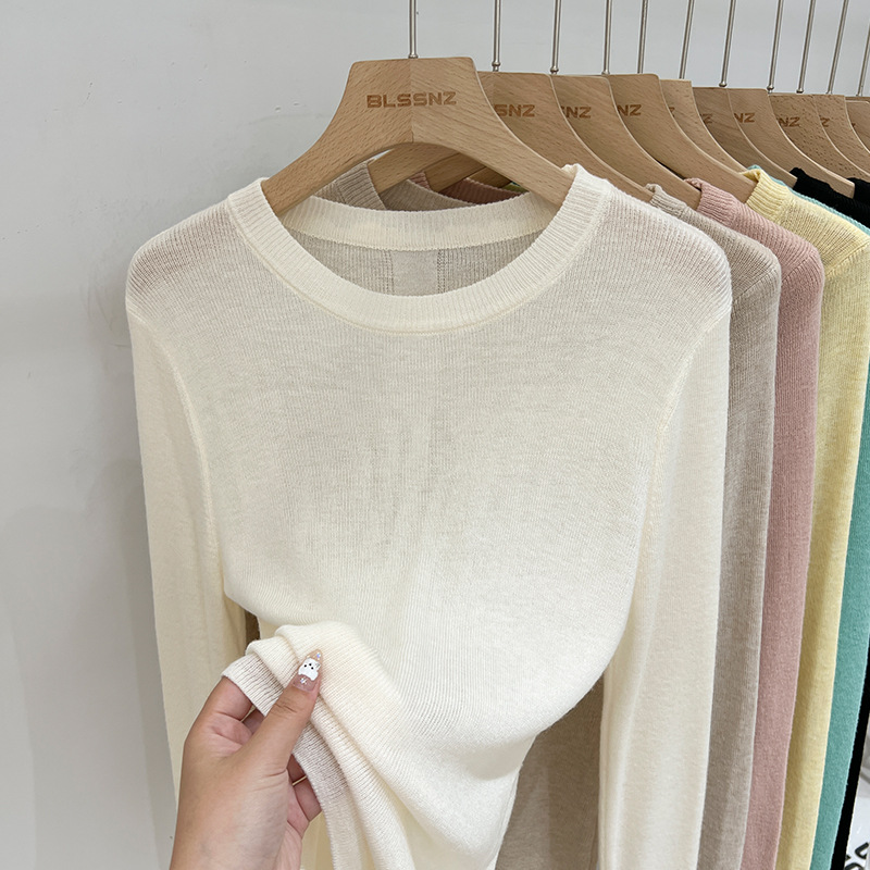 녹색 긴팔 니트 티셔츠 여자 여름 탑 2024 새로운 간단한 올 매치 숄더베이스 셔츠 여성용 얇은