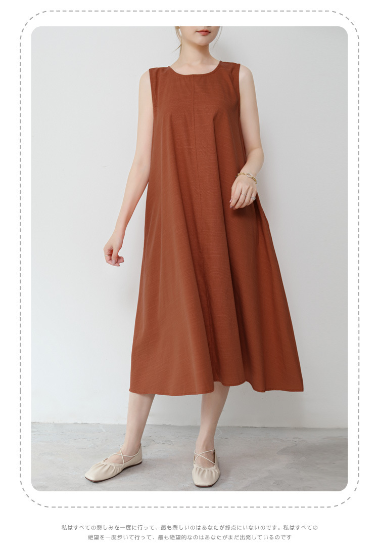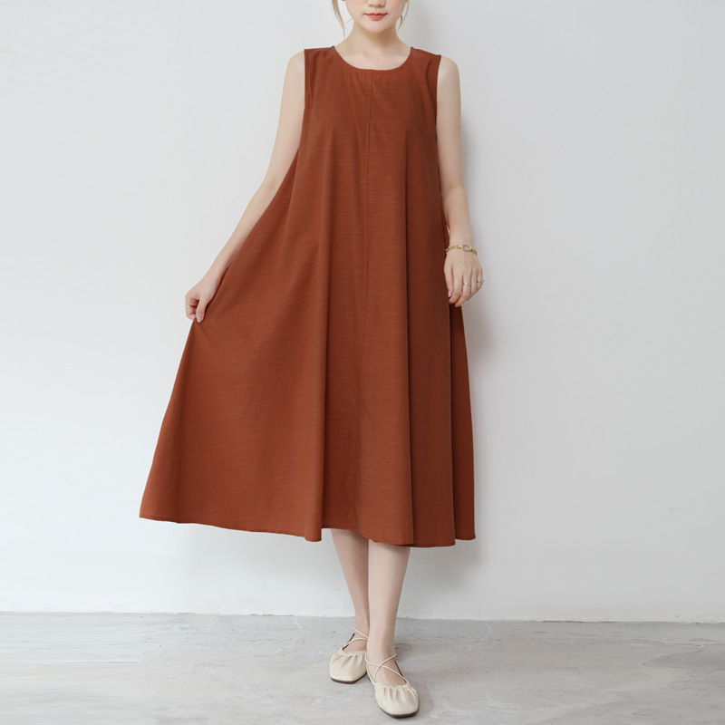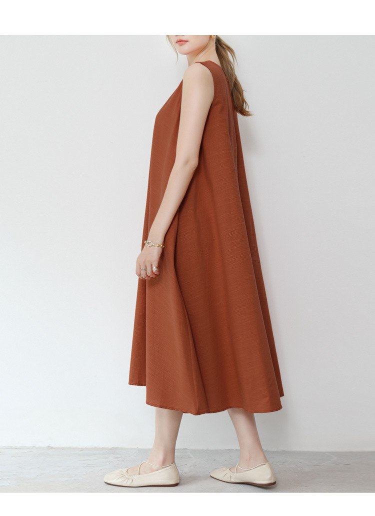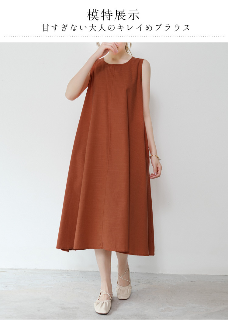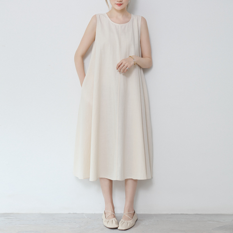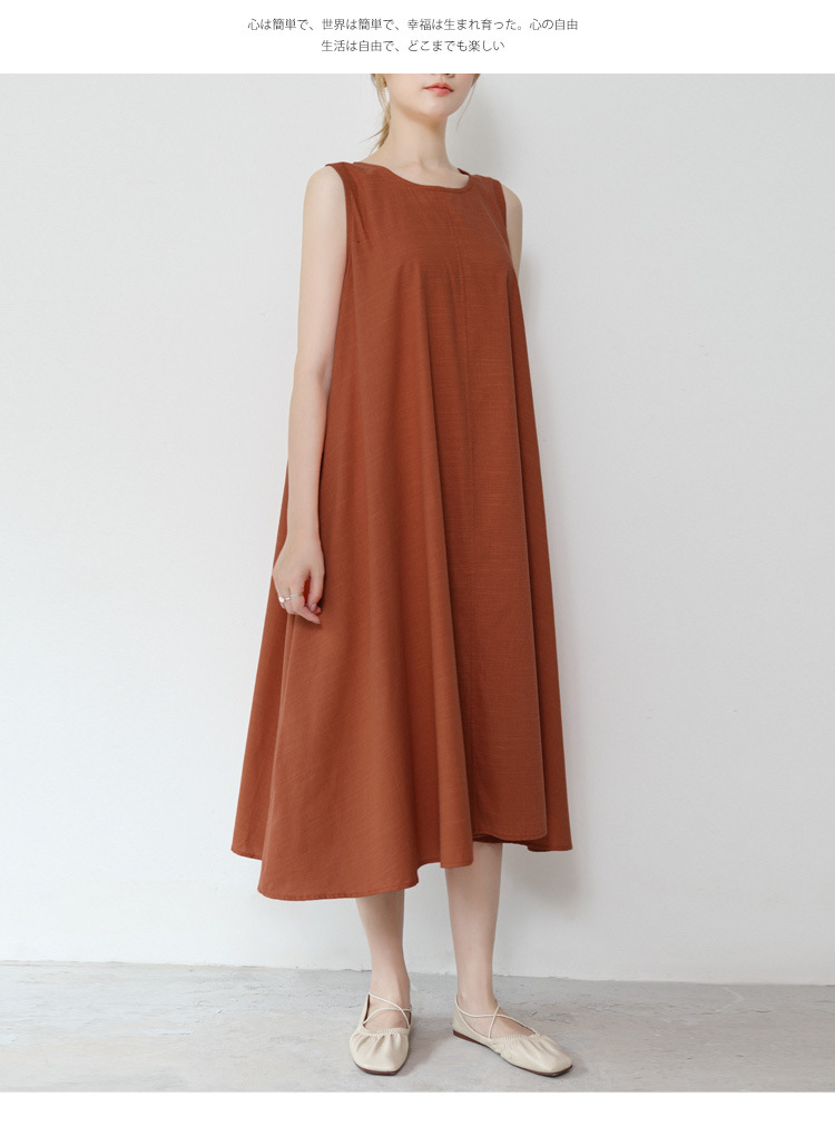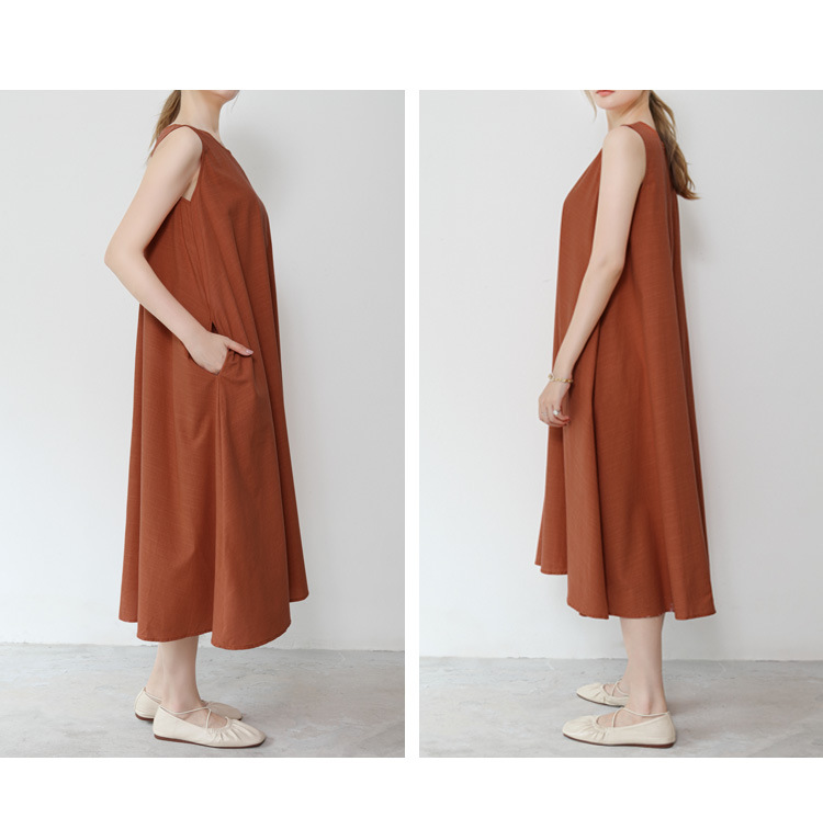 진짜 샷 2024 여름 한국 세련된 바람 느슨한 큰 민소매 호박 색 긴면과 린넨 원피스 여성스토어 가기