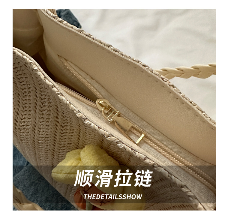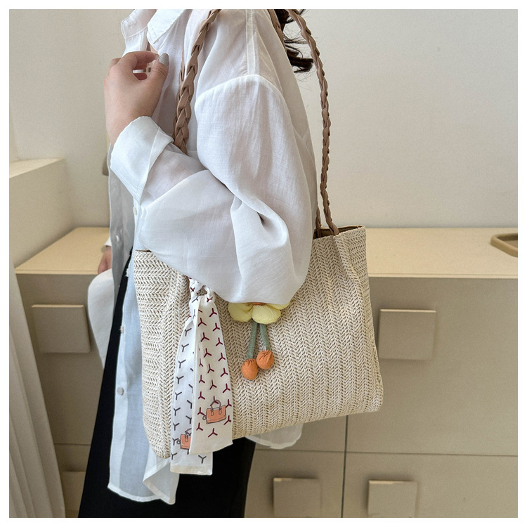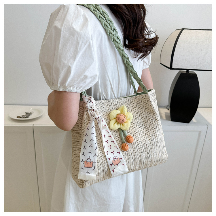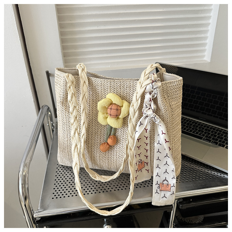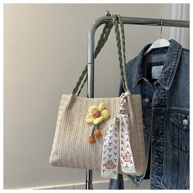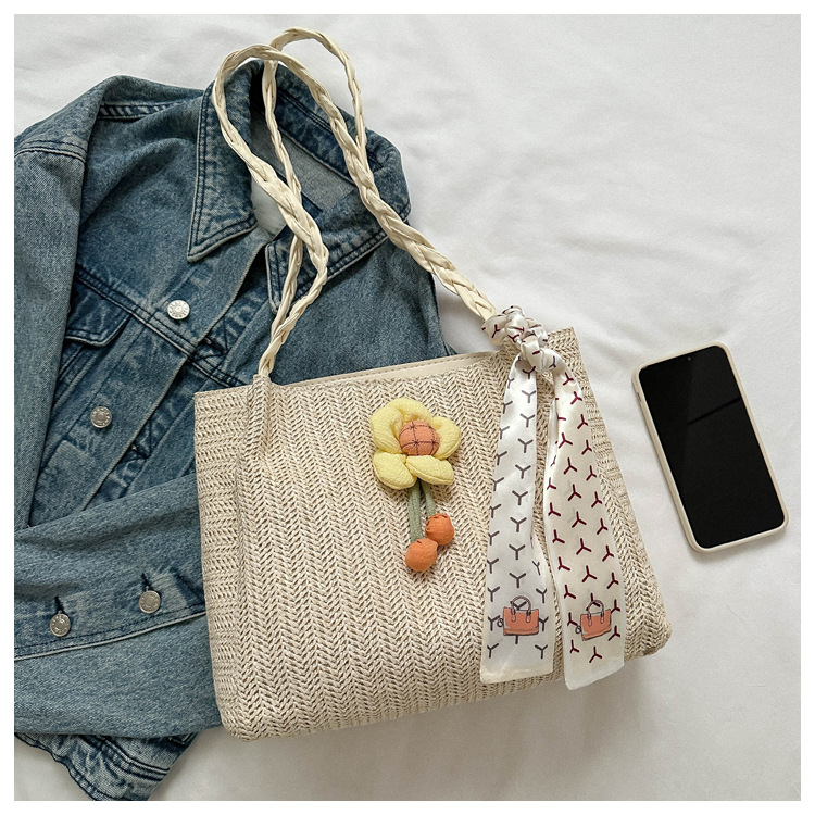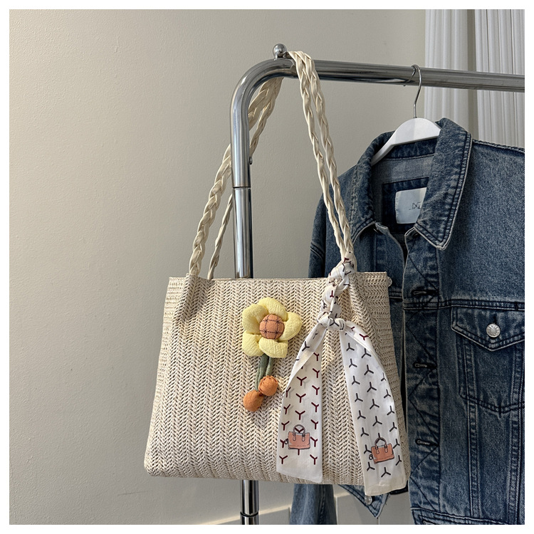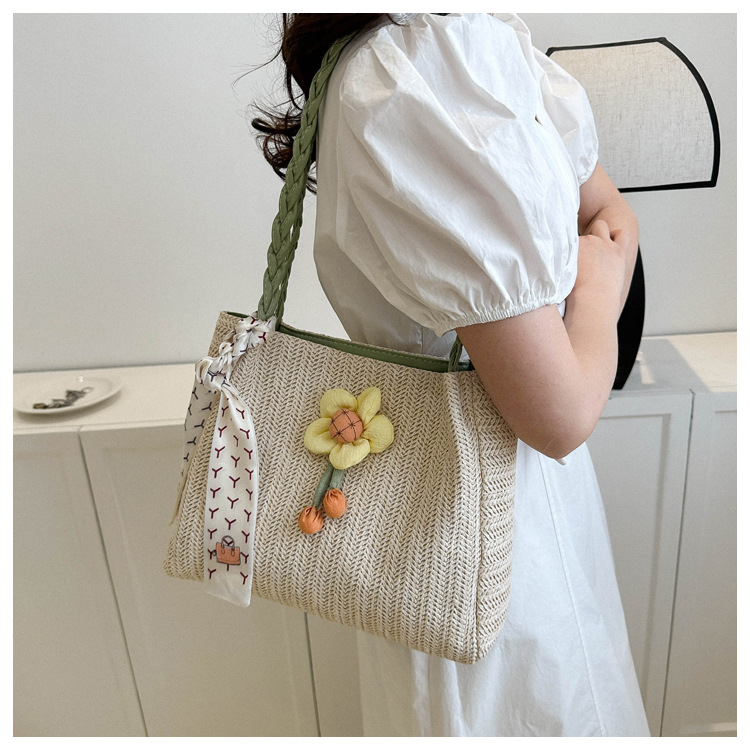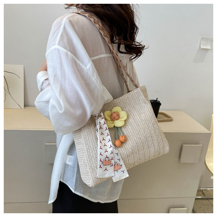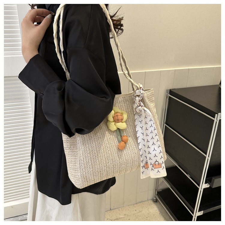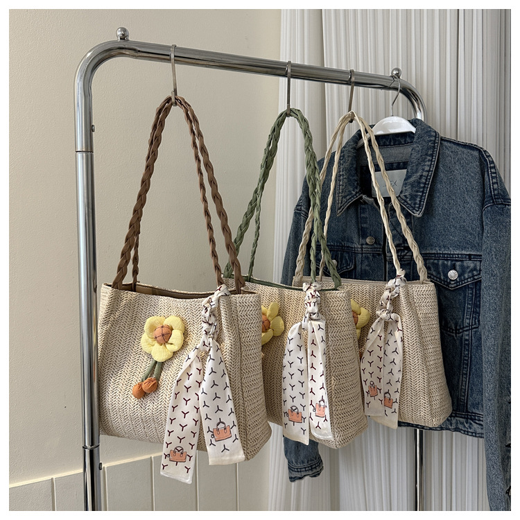 여성용 짠 밀짚 가방 대용량 2024 새로운 여름 꽃 어깨 캐주얼 유행 토트 백스토어 가기