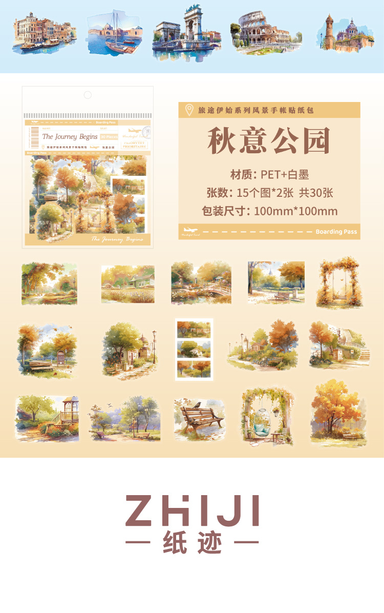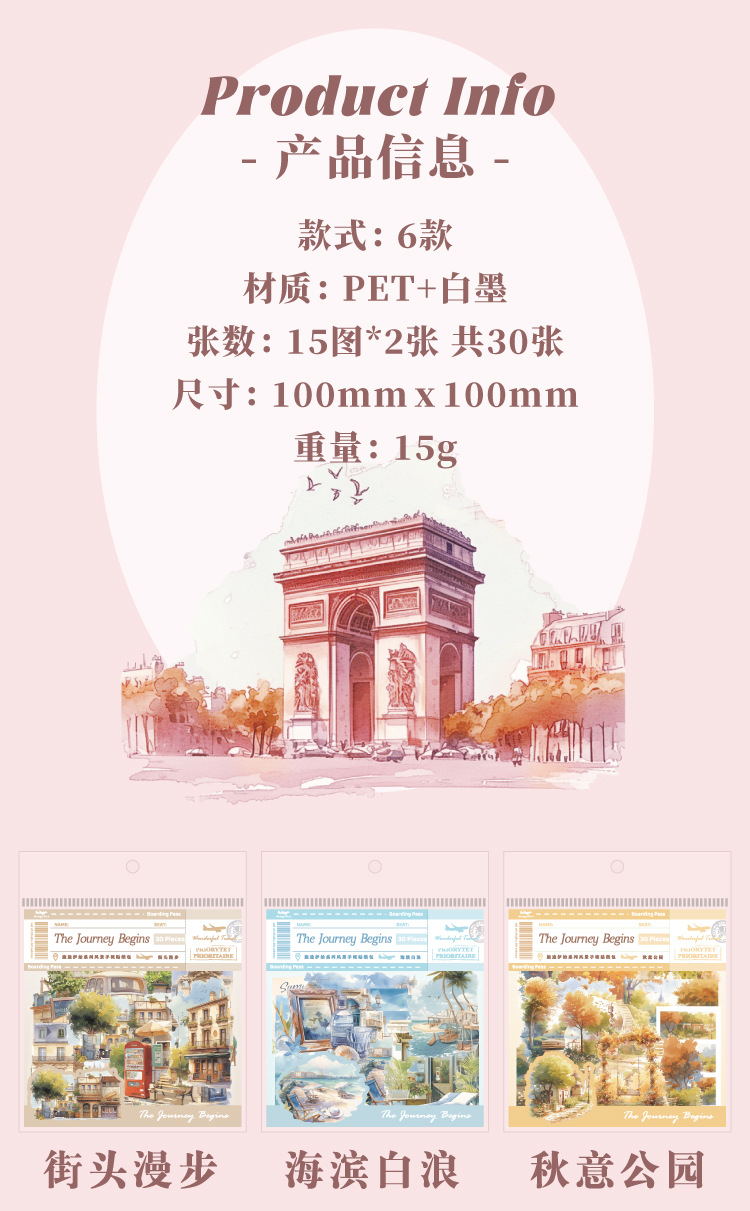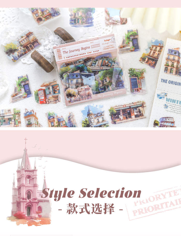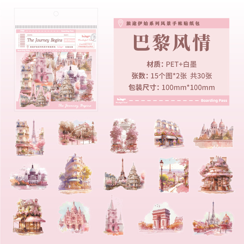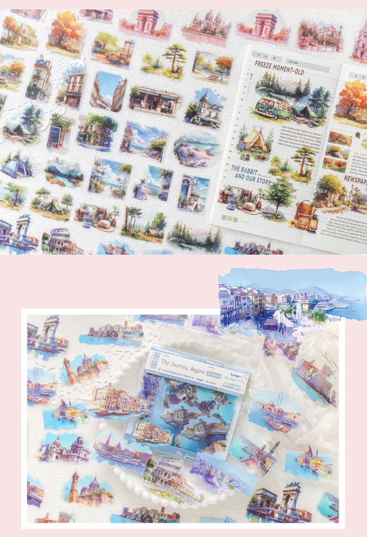 여행 손 계정 PET 스티커 복고풍 파리 로마 풍경 손 계정 절단 금형 장식 DIY 자기 접착 스티커의 시작
