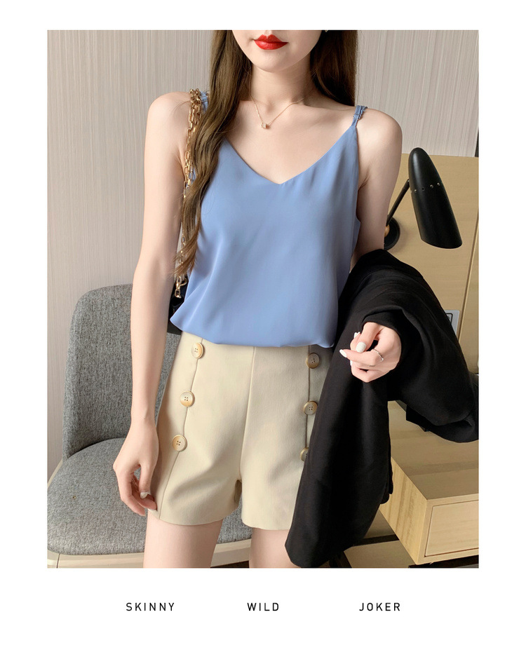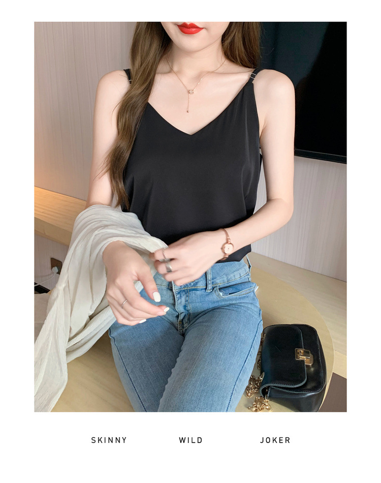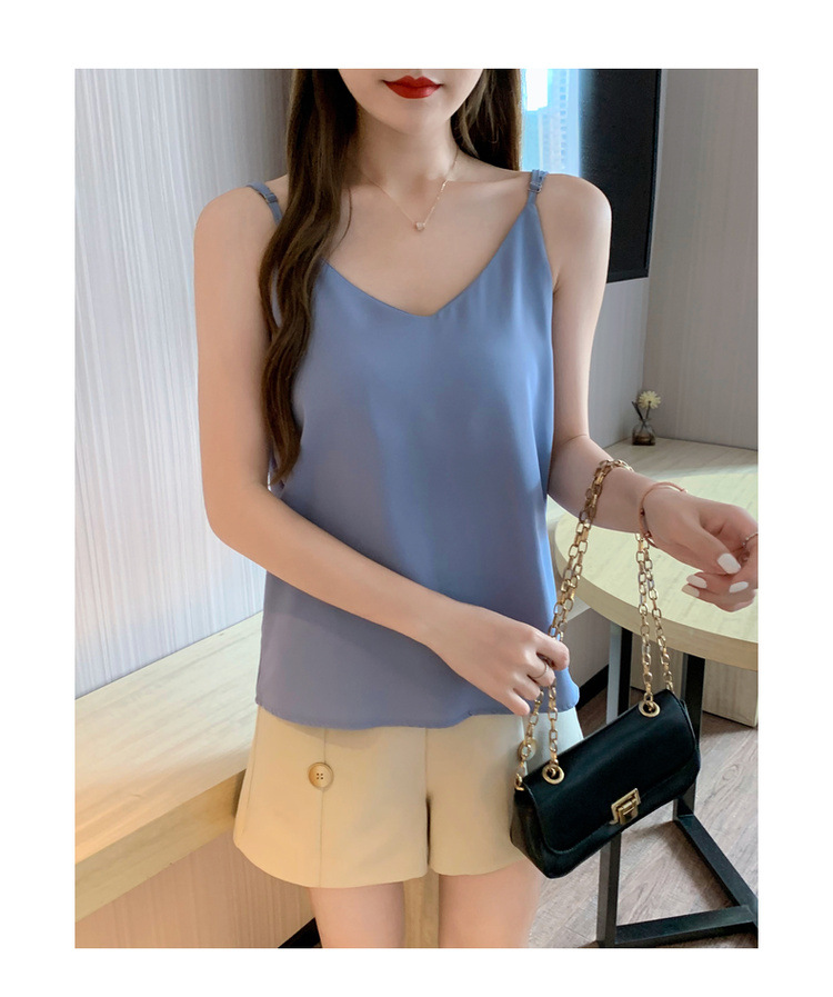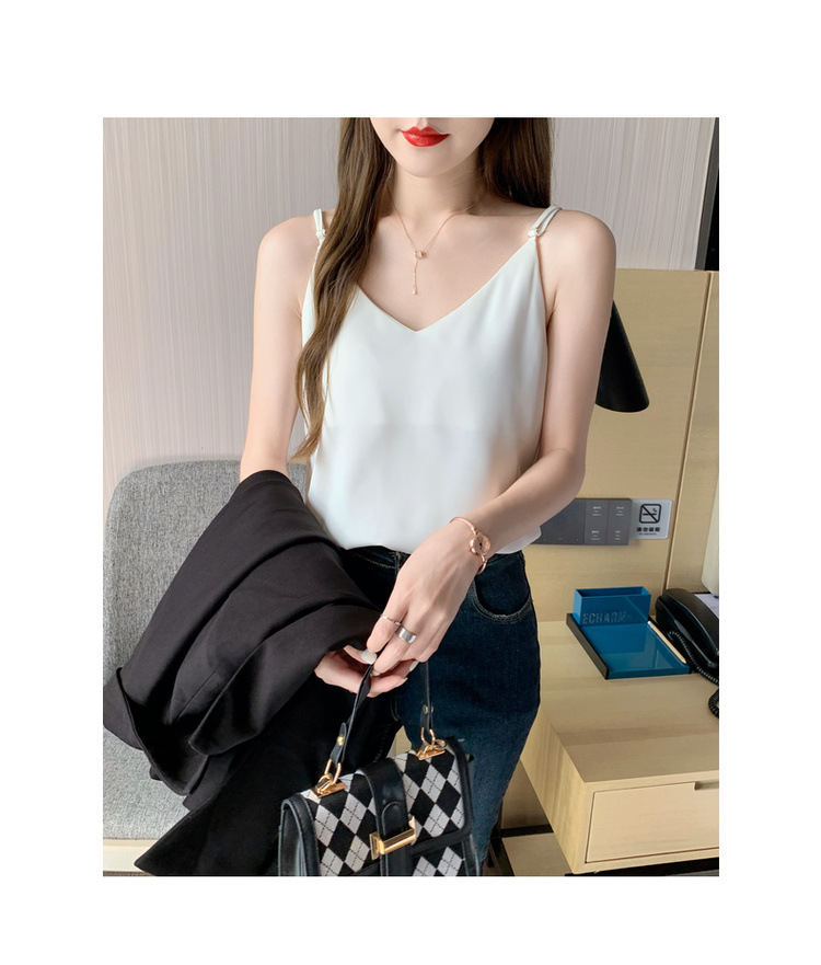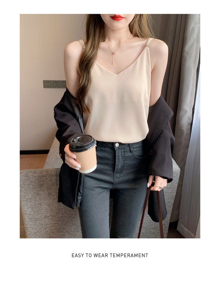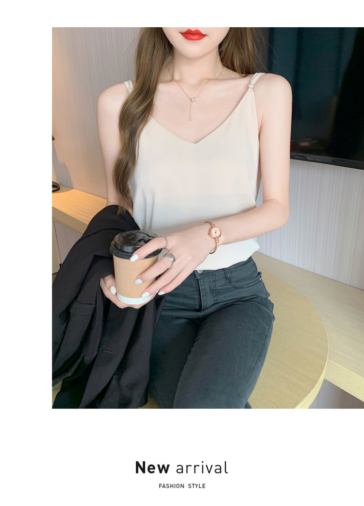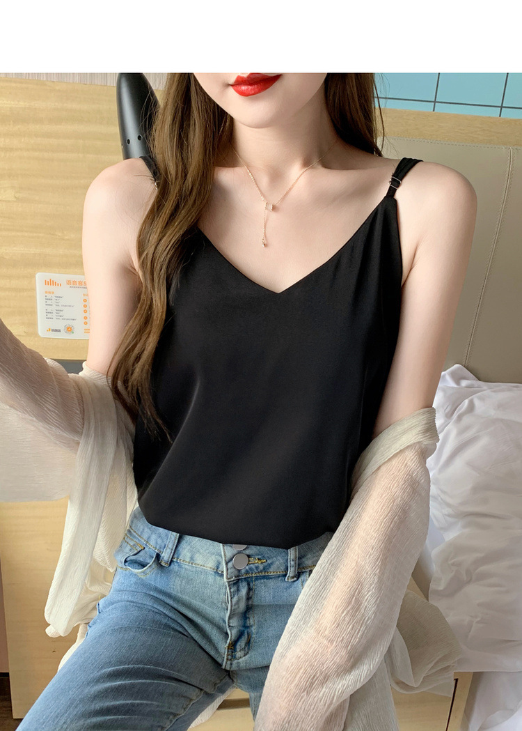 시폰 카미 솔 여자 2024 여름 V-목 조정 가능한 느슨한 외부 착용 내부 화이트 탑