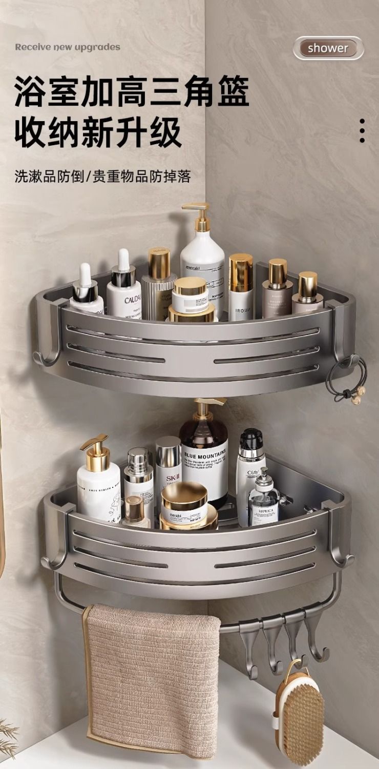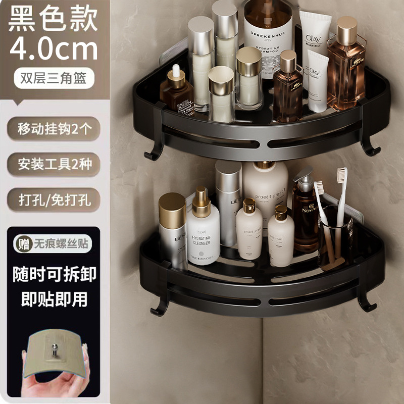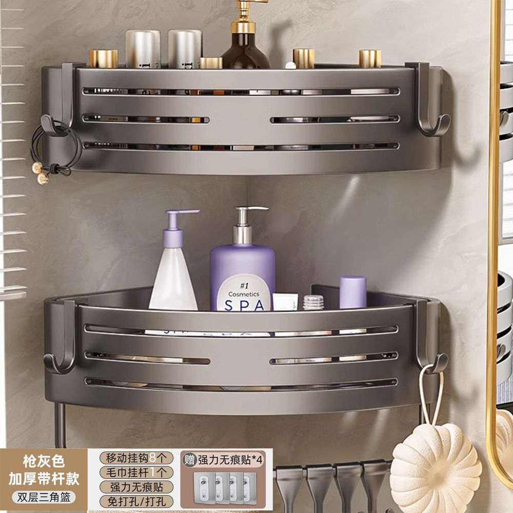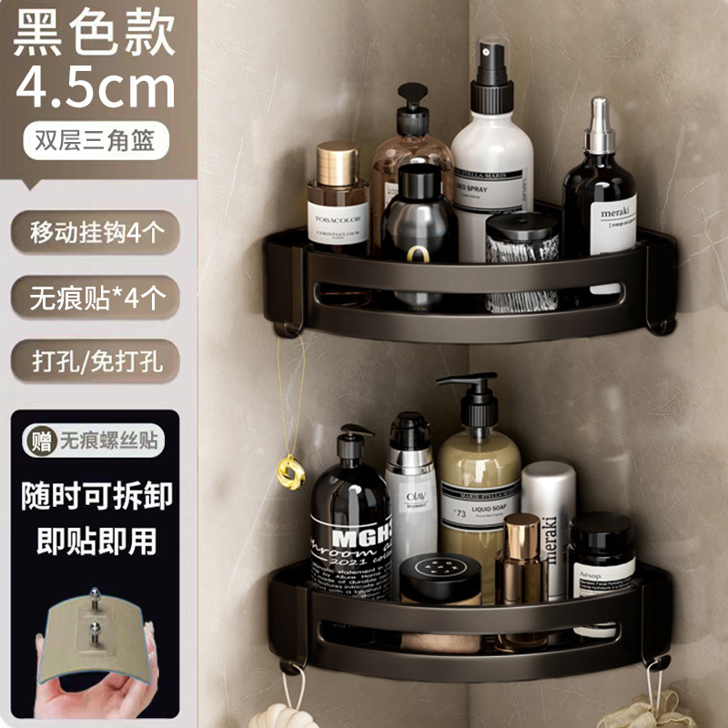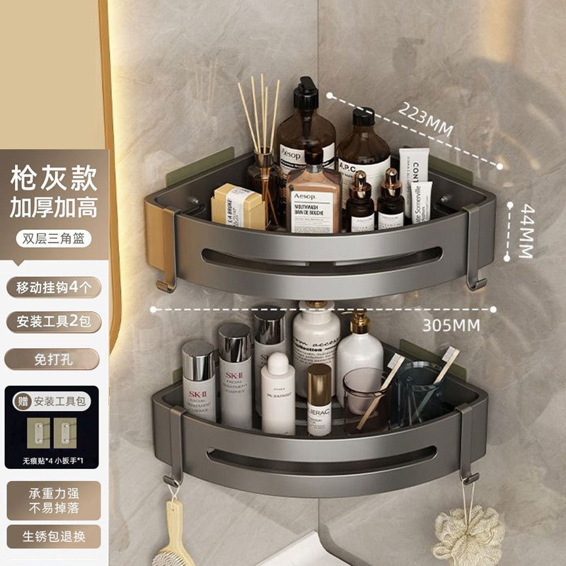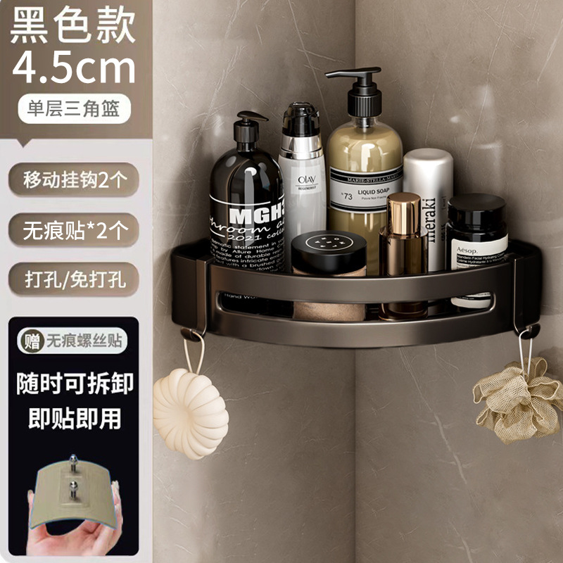 건그레이 색상의 무타공 삼각형 바스켓 부착형 욕실 수납 선반, 욕실 코너 선반, 샤워젤 벽걸이 코너 선반, 벽걸이형 코너 선반스토어 가기