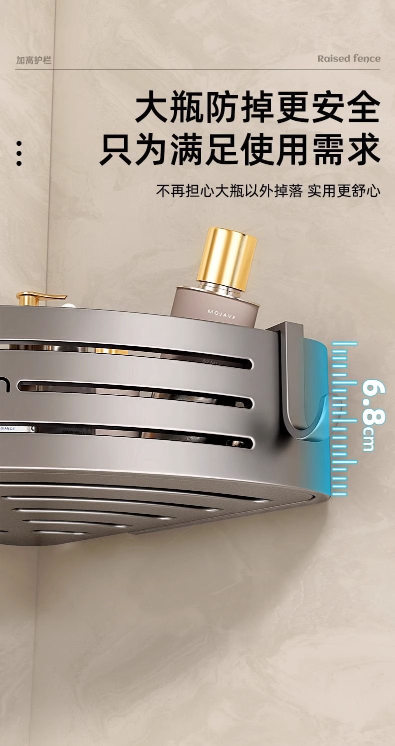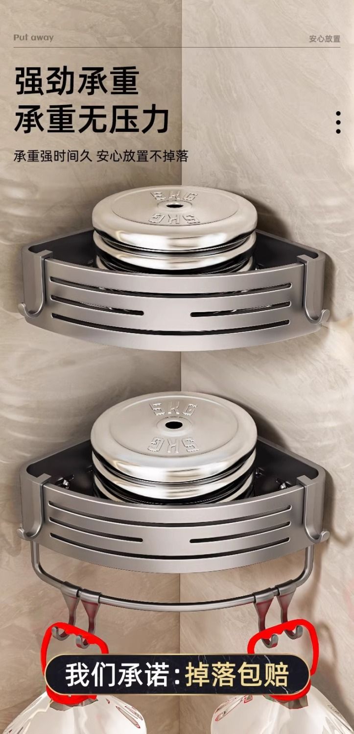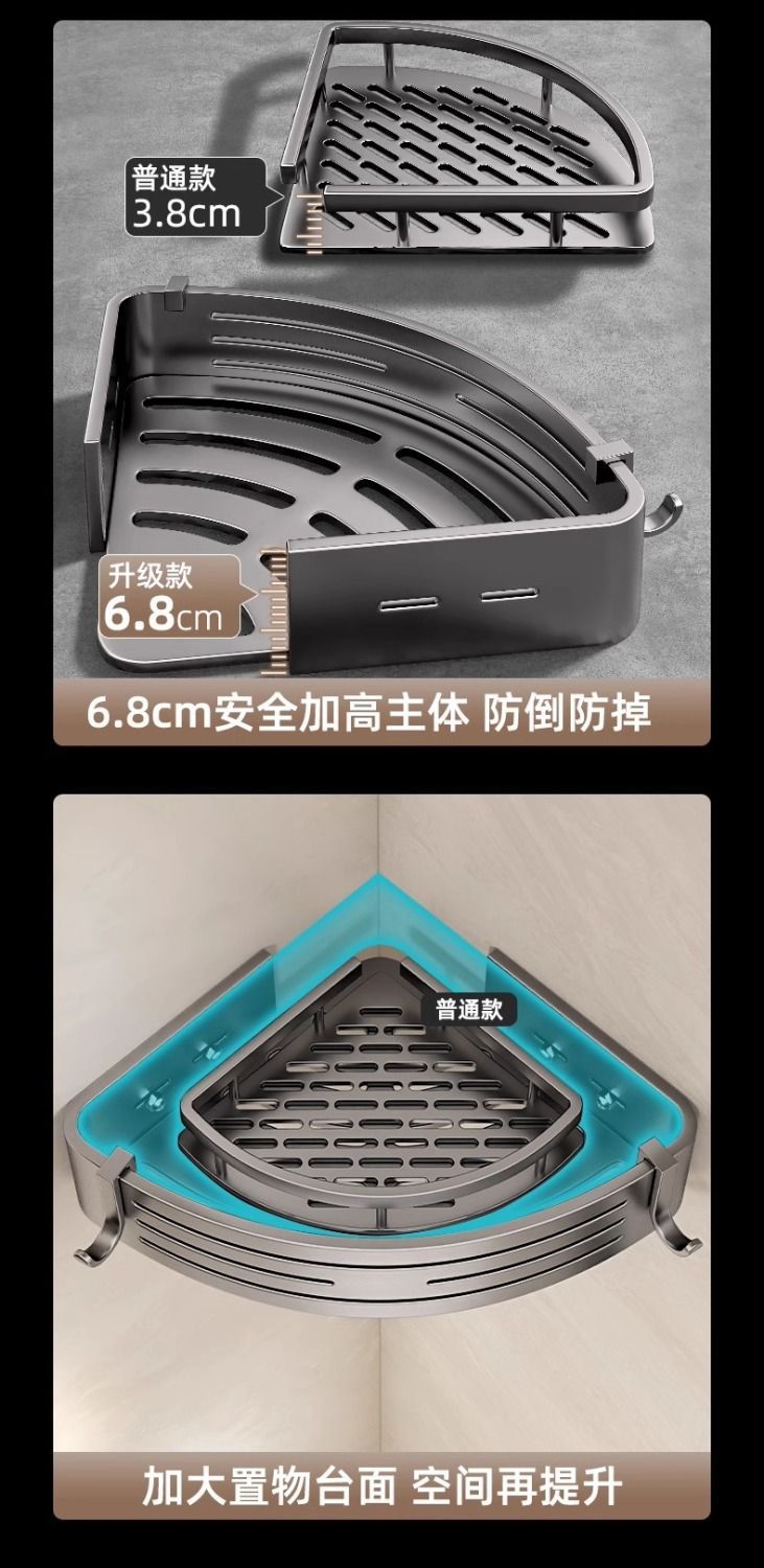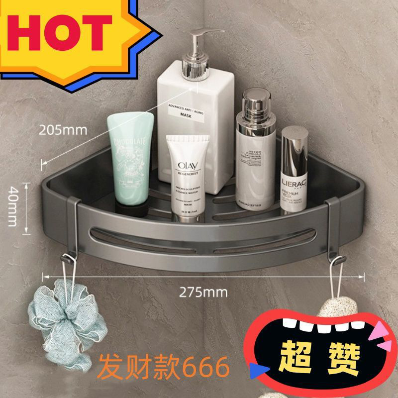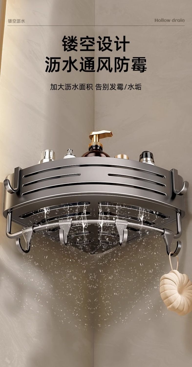건그레이 색상의 무타공 삼각형 바스켓 부착형 욕실 수납 선반, 욕실 코너 선반, 샤워젤 벽걸이 코너 선반, 벽걸이형 코너 선반스토어 가기