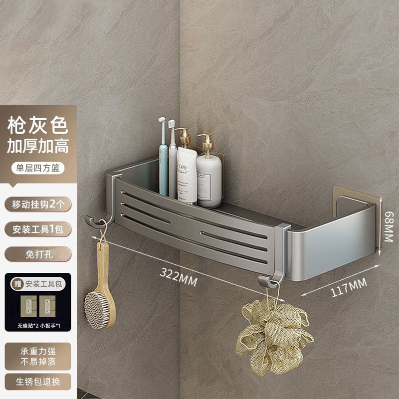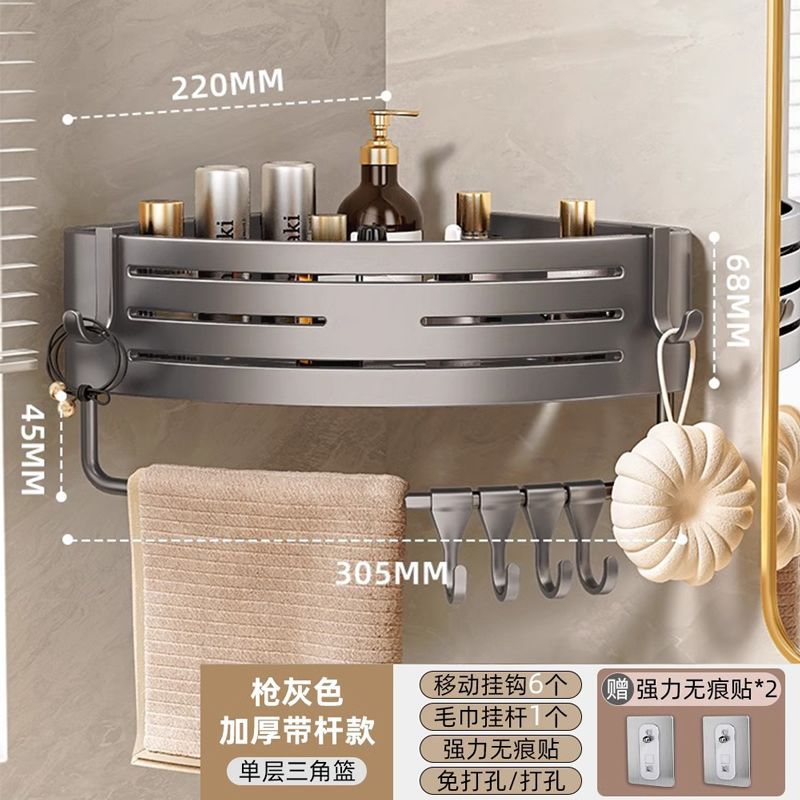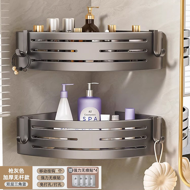 건그레이 색상의 무타공 삼각형 바스켓 부착형 욕실 수납 선반, 욕실 코너 선반, 샤워젤 벽걸이 코너 선반, 벽걸이형 코너 선반