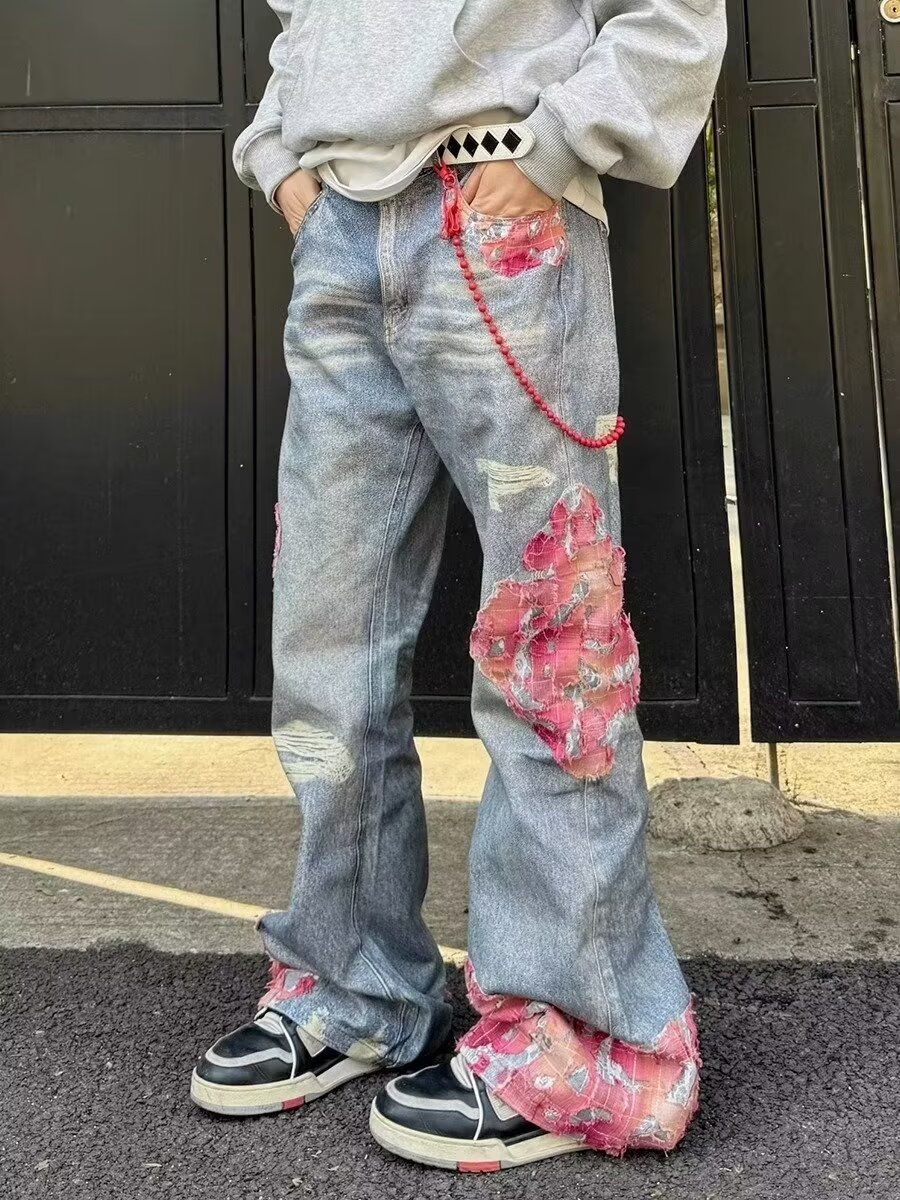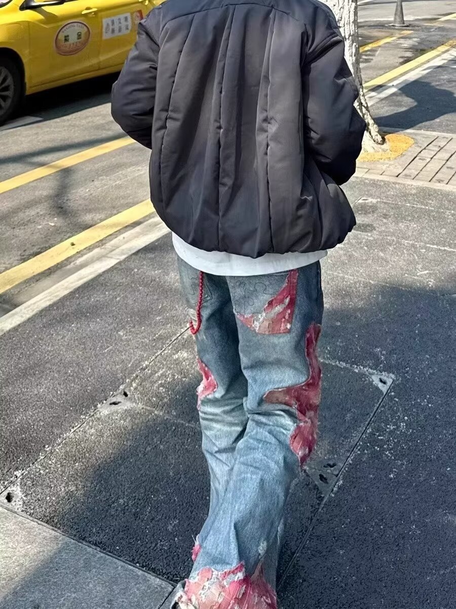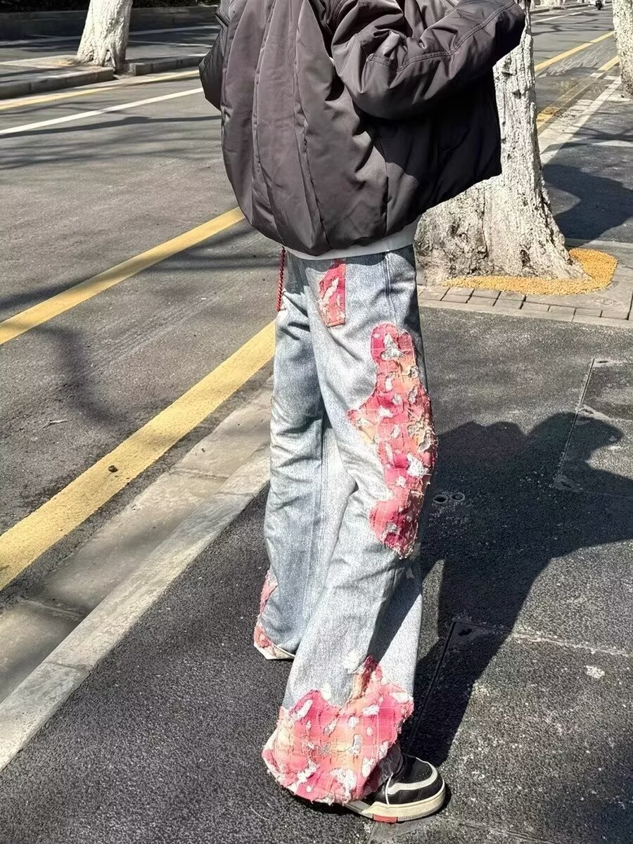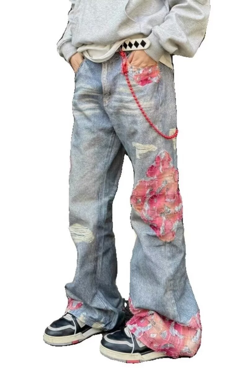 블루 아메리칸 스타일 하이 스트리트 바느질 고층 청바지 남성과 여성의 마이크로 플레어 바지 인쇄 스티칭 캐주얼 바지