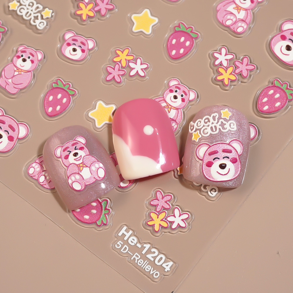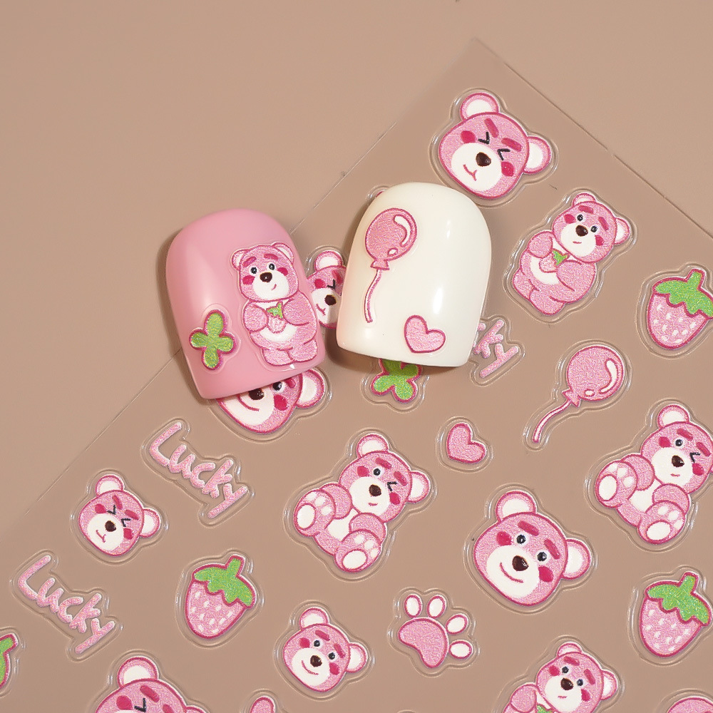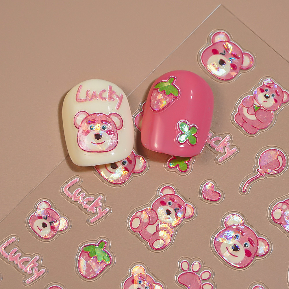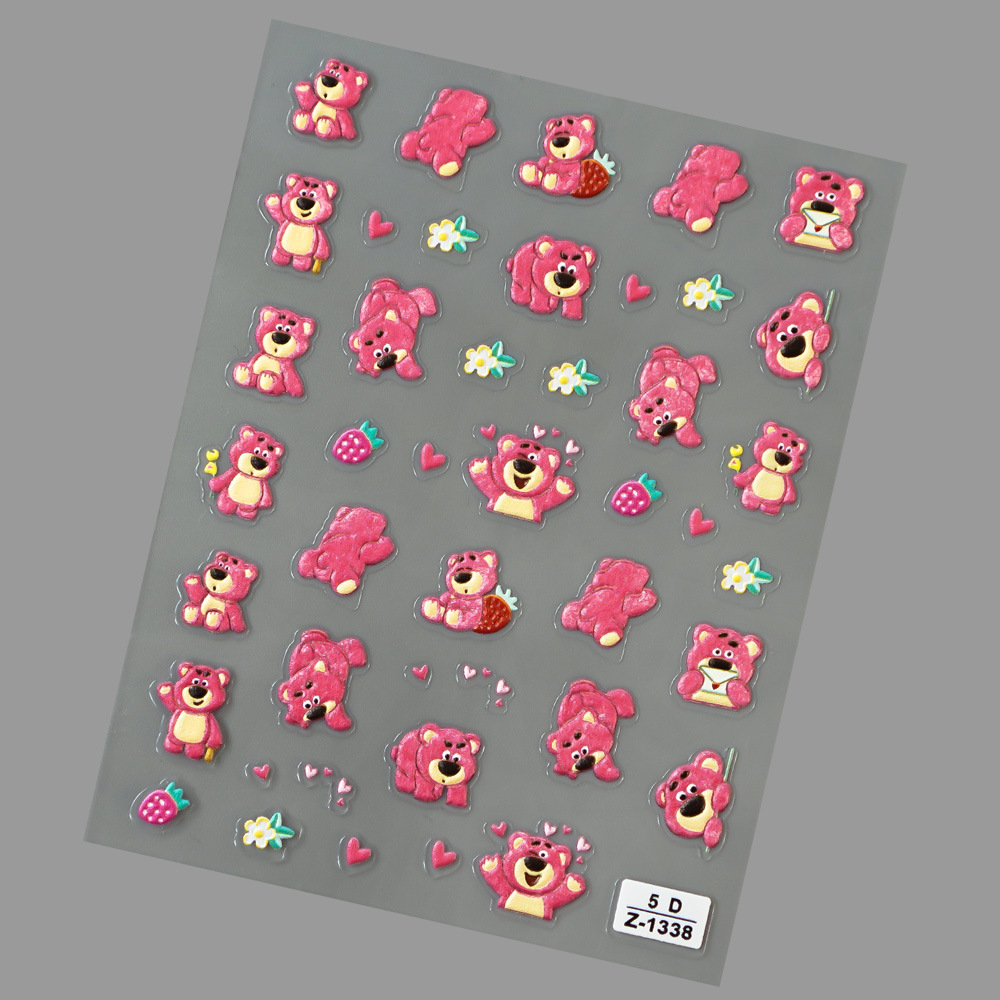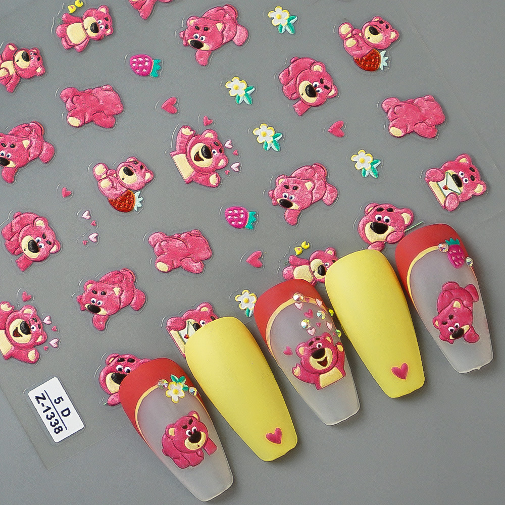 Redanco 새로운 5D 구호 만화 딸기 곰 네일 스티커 3 차원 접착 네일 스티커 도매