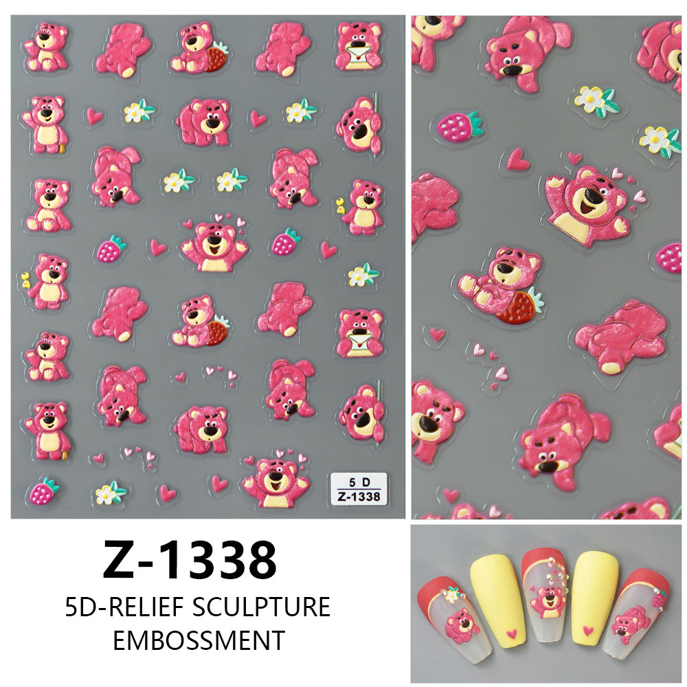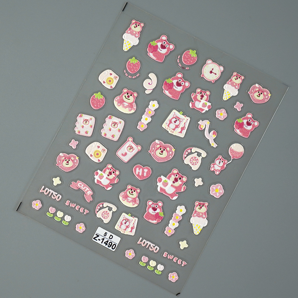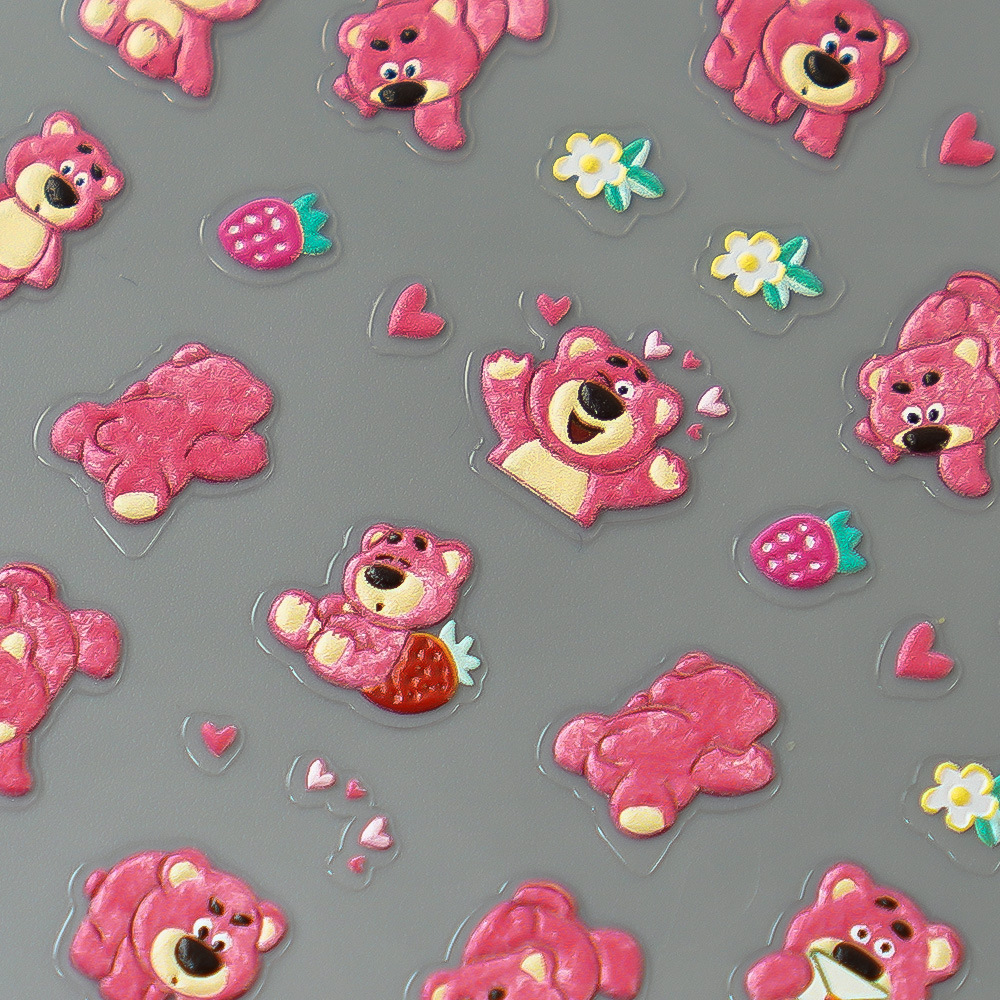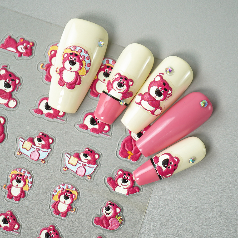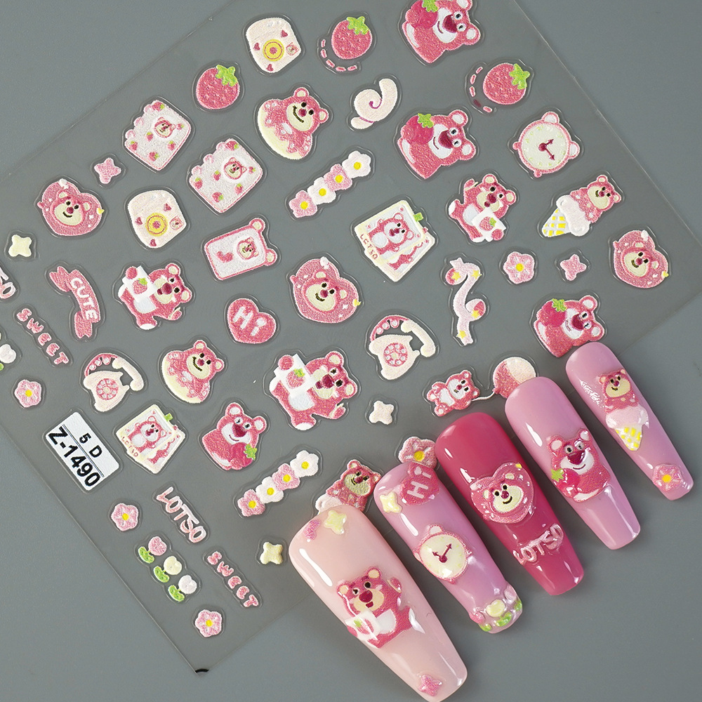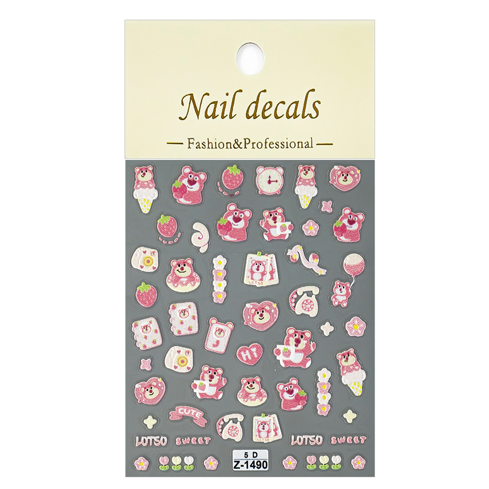 Redanco 새로운 5D 구호 만화 딸기 곰 네일 스티커 3 차원 접착 네일 스티커 도매