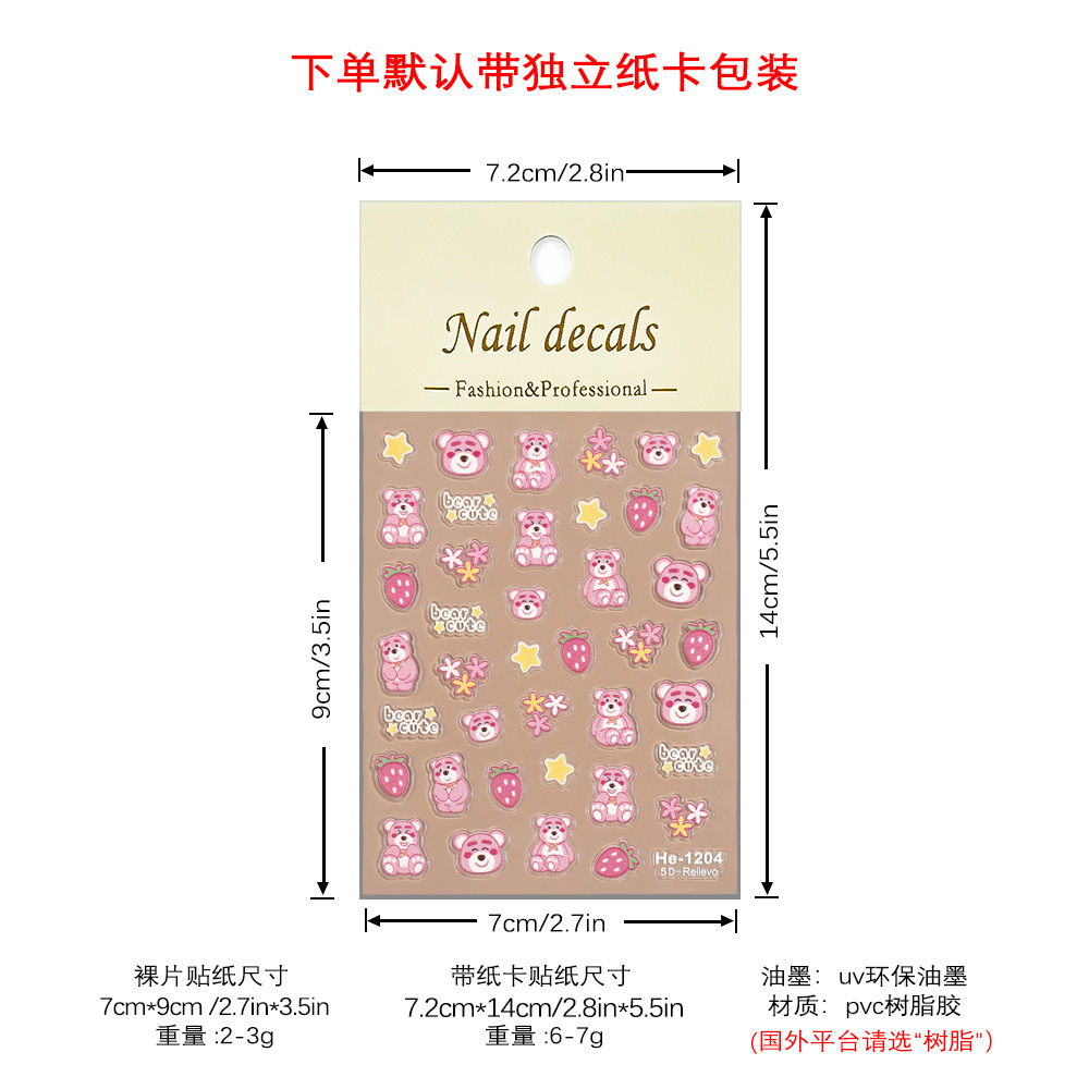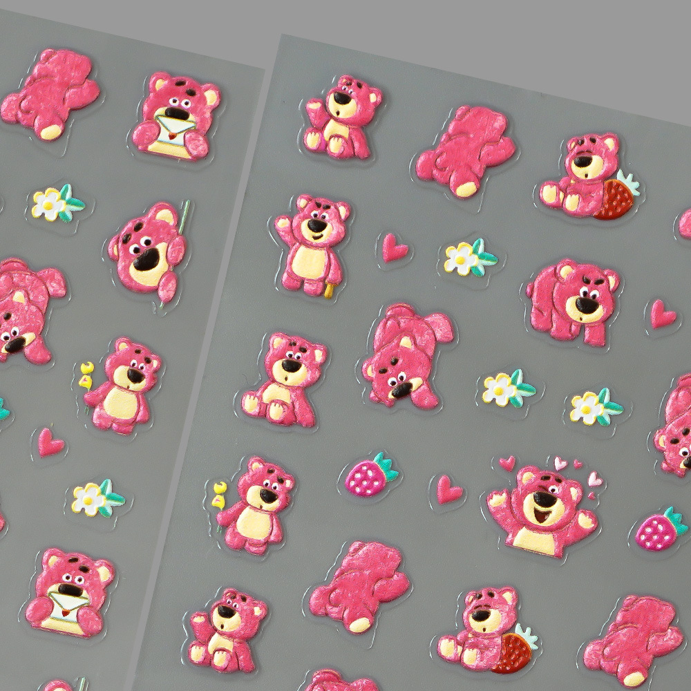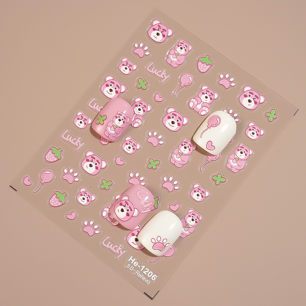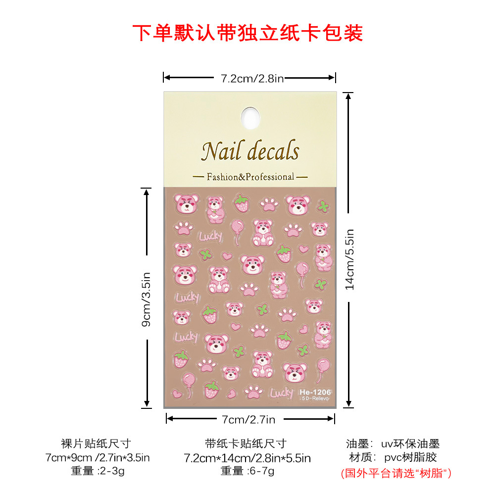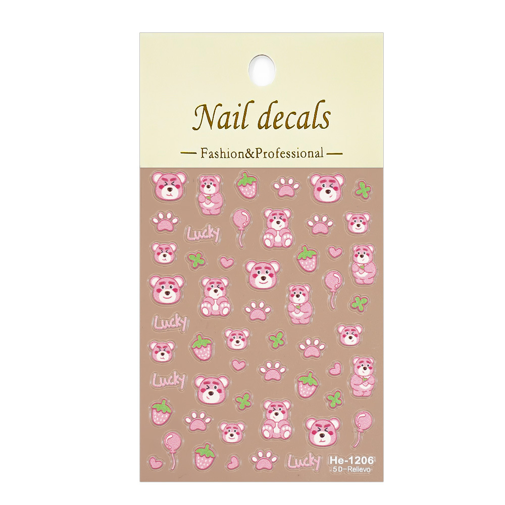 Redanco 새로운 5D 구호 만화 딸기 곰 네일 스티커 3 차원 접착 네일 스티커 도매