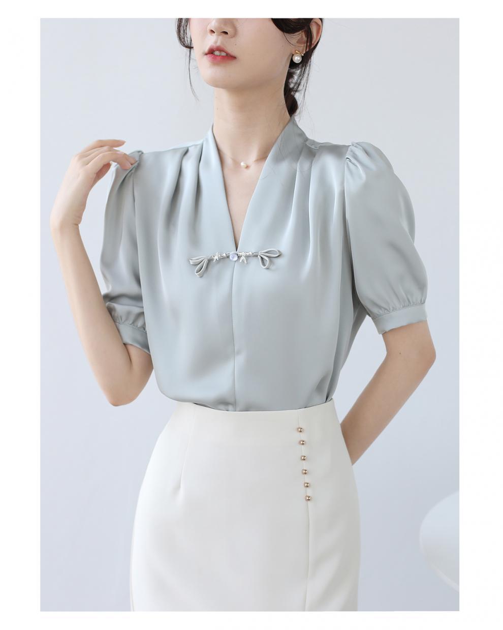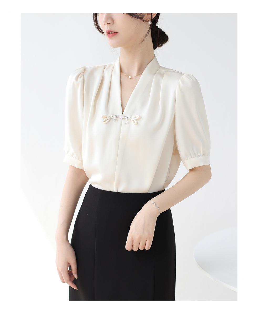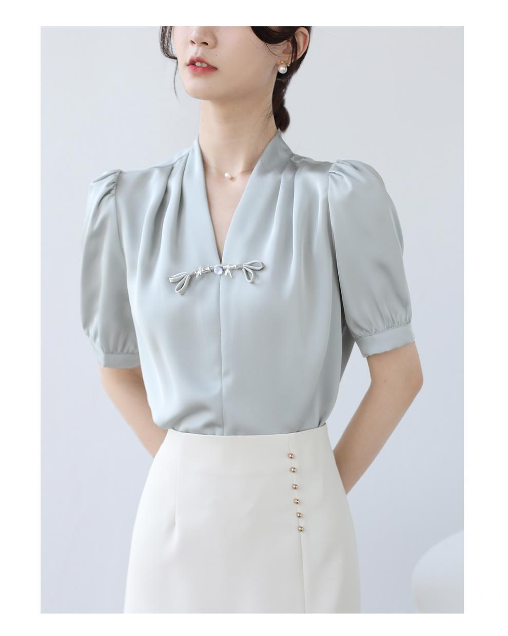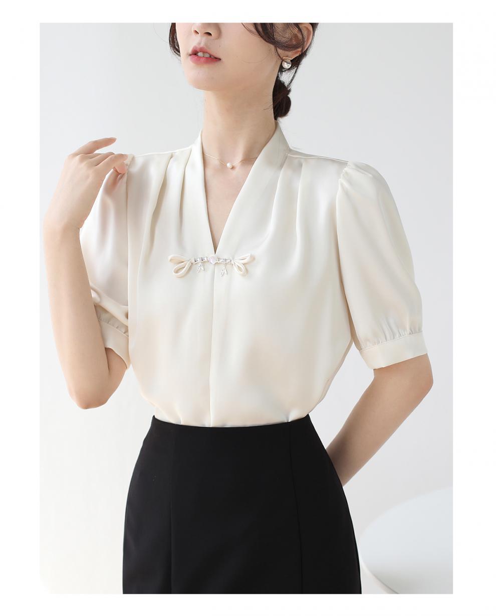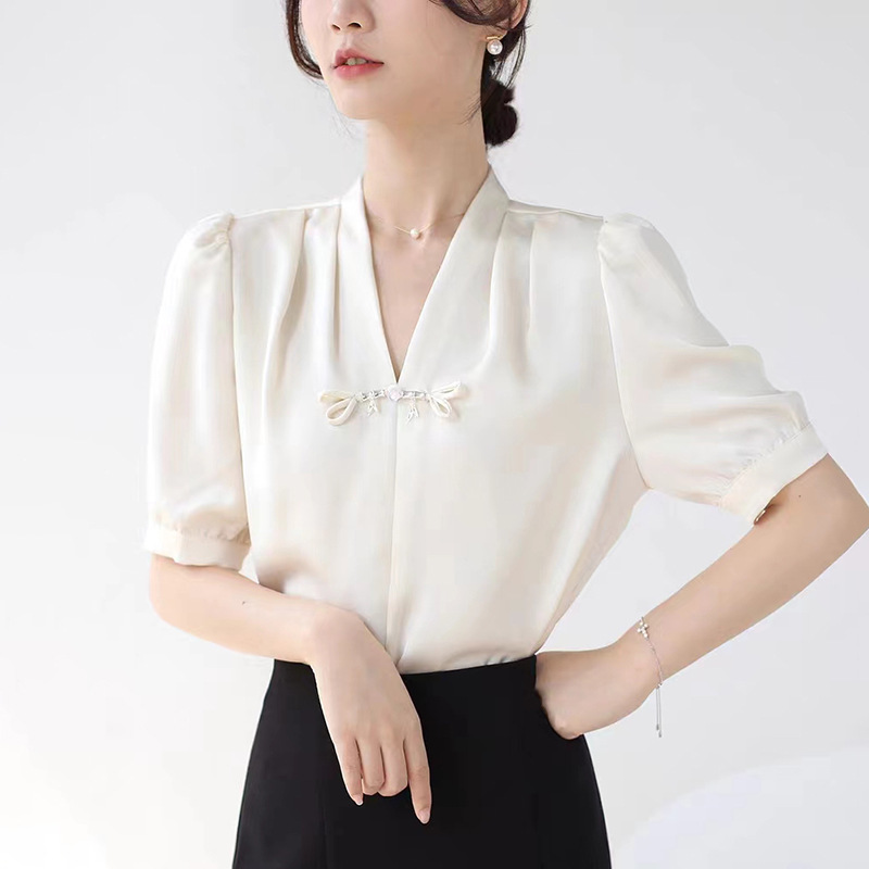 그물 이미지 복고풍 새로운 중국 스타일 V 넥 버클 짧은 소매 셔츠 여성의 여름 새로운 빛 국가 스타일 새틴 작은 셔츠 탑
